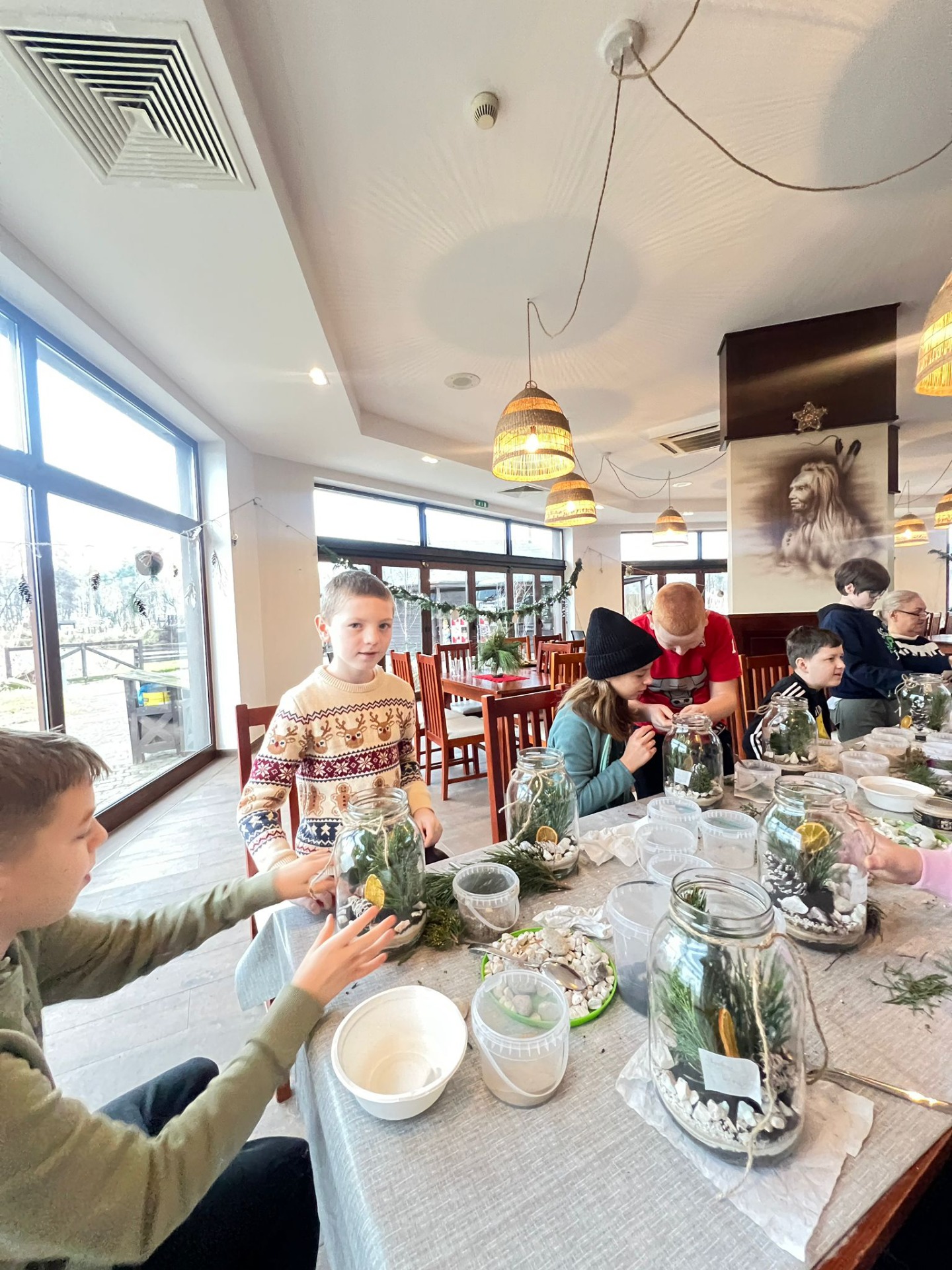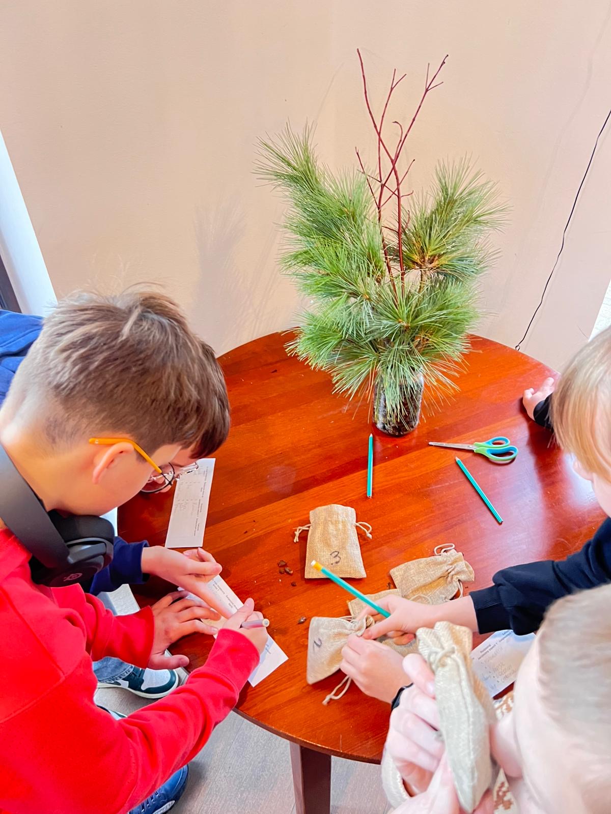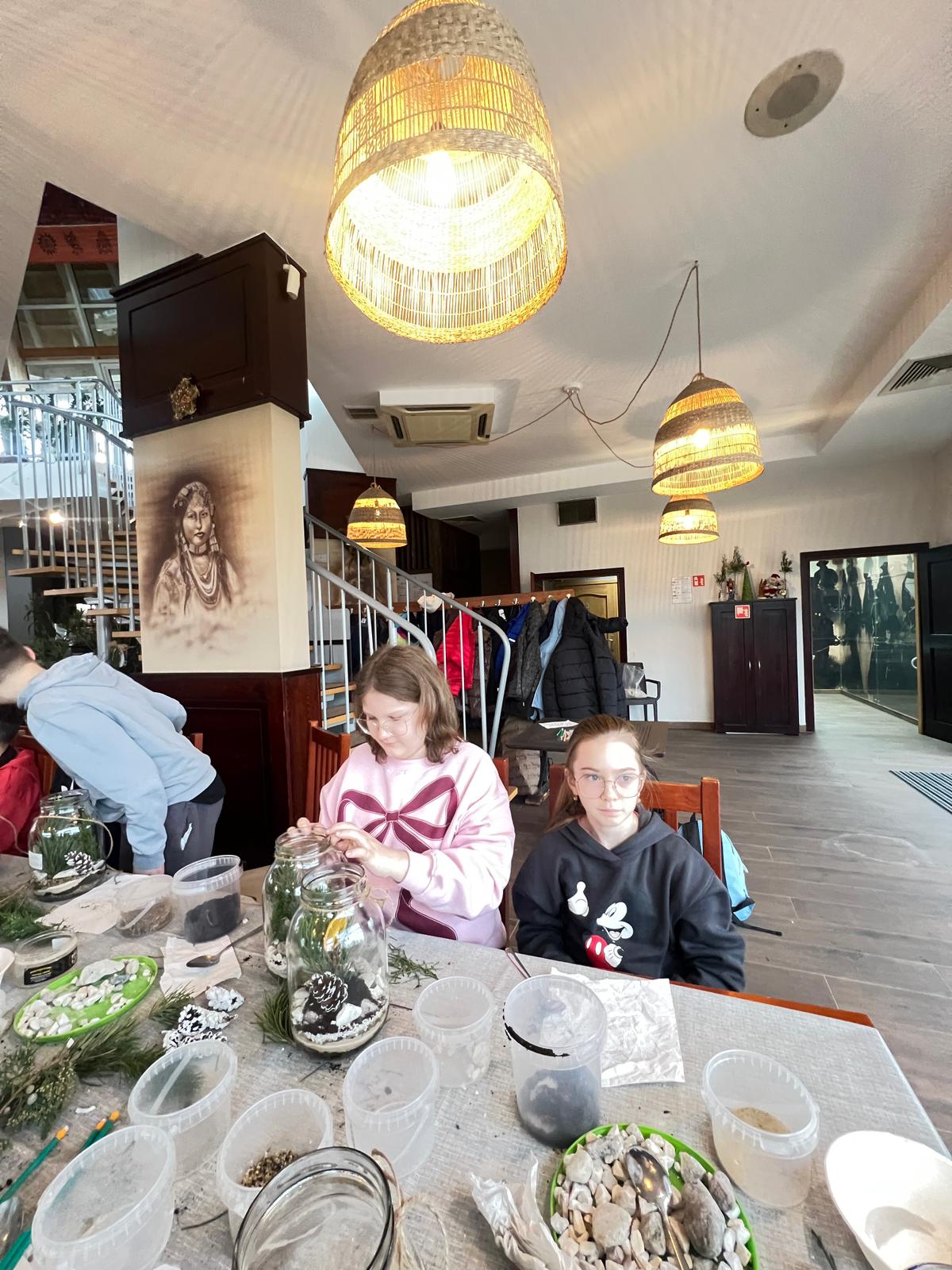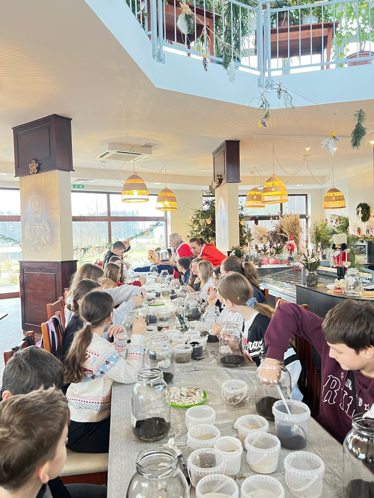 W pięknie udekorowanej świątecznymi ozdobami sali, w blasku wiszących lamp, otoczeni zapachem igliwia i ciepłem kominka, uczniowie przystąpili do twórczej pracy.