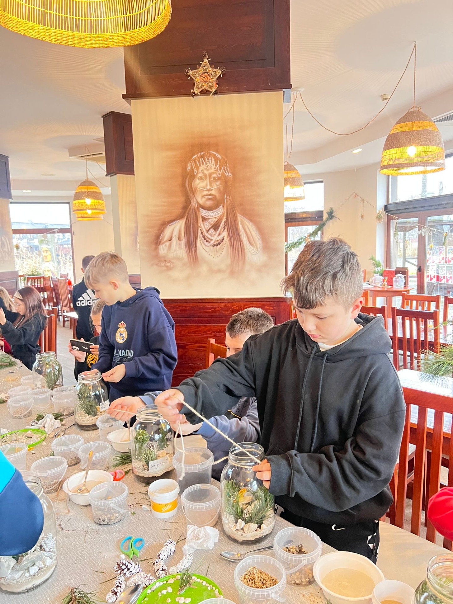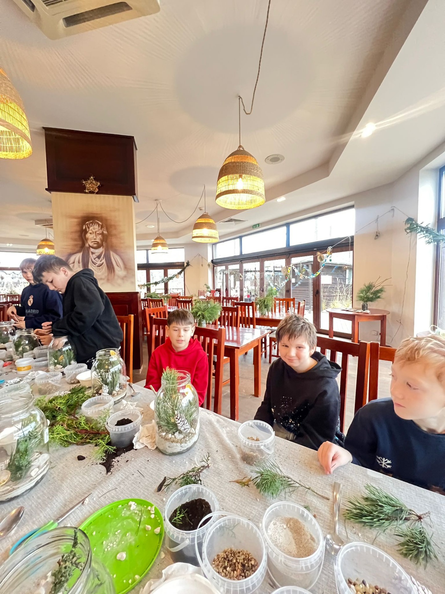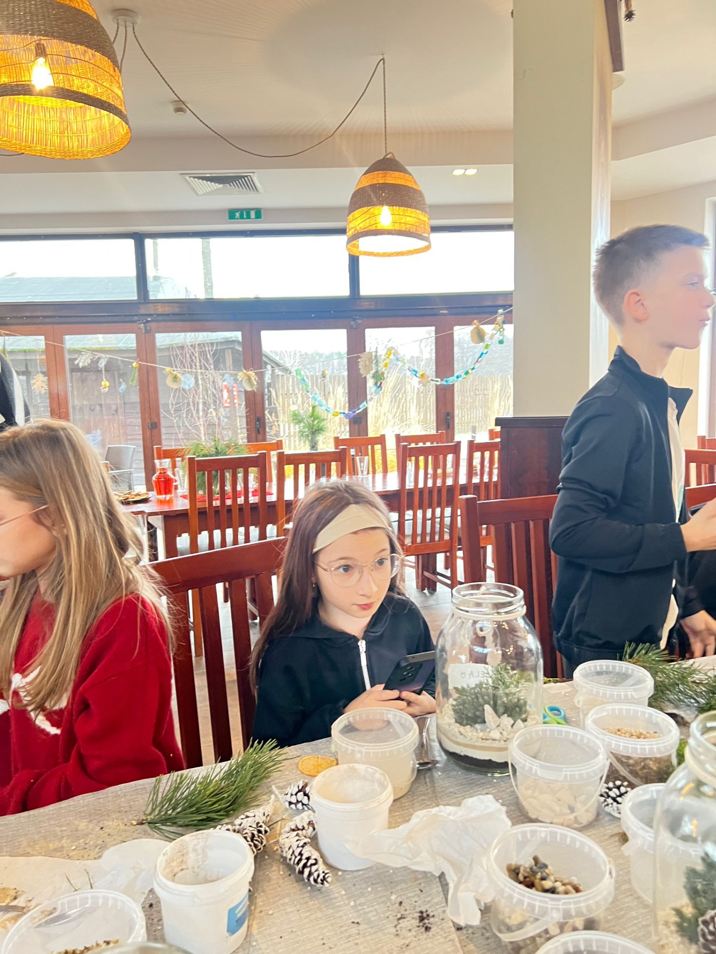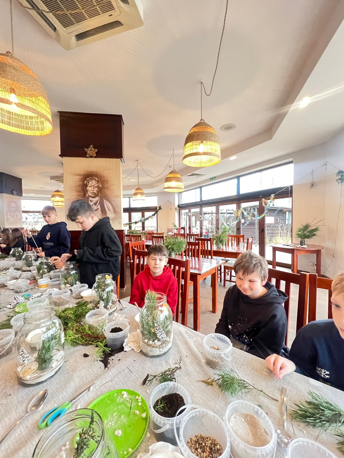 W pięknie udekorowanej świątecznymi ozdobami sali, w blasku wiszących lamp, otoczeni zapachem igliwia i ciepłem kominka, uczniowie przystąpili do twórczej pracy.