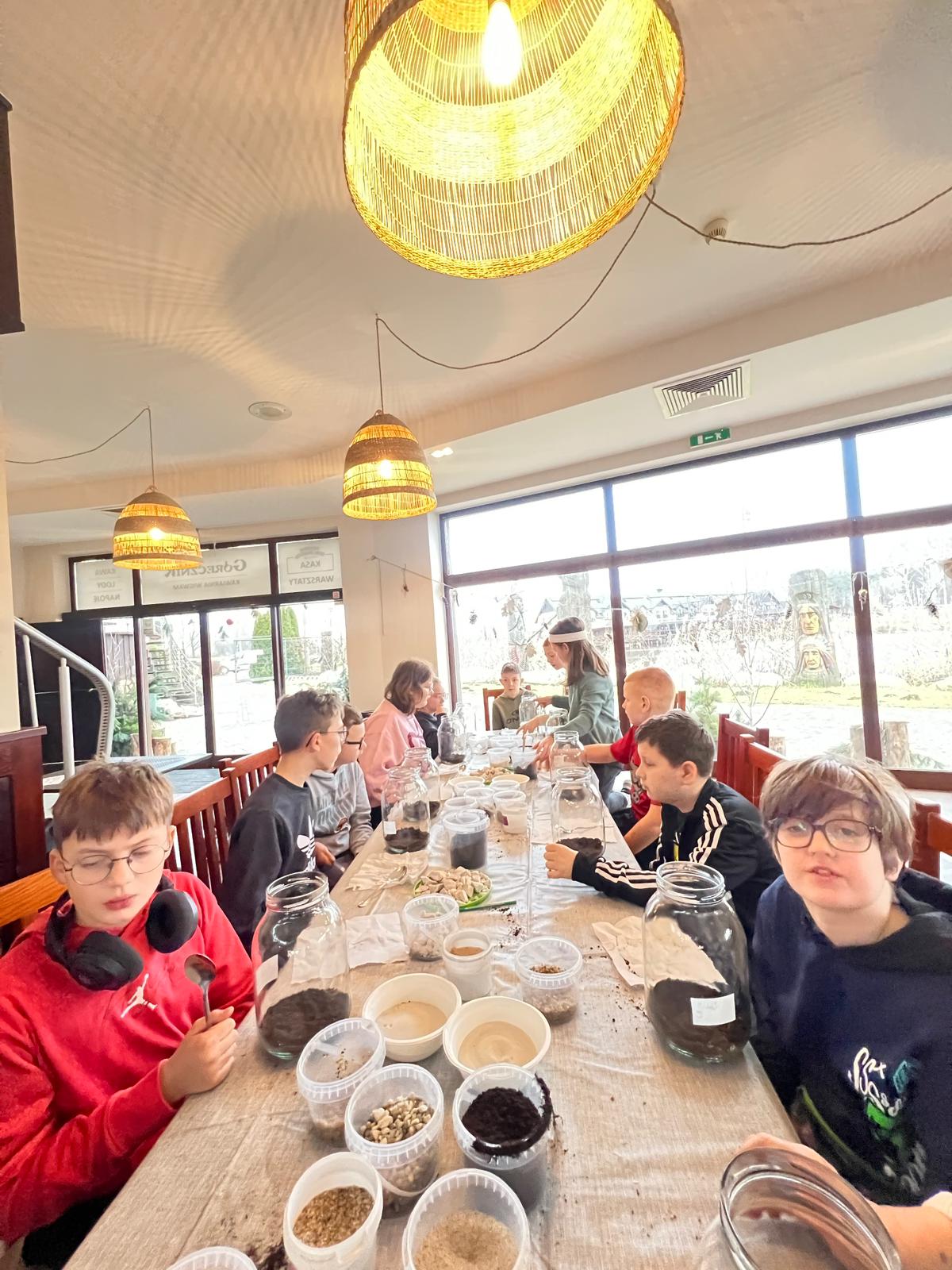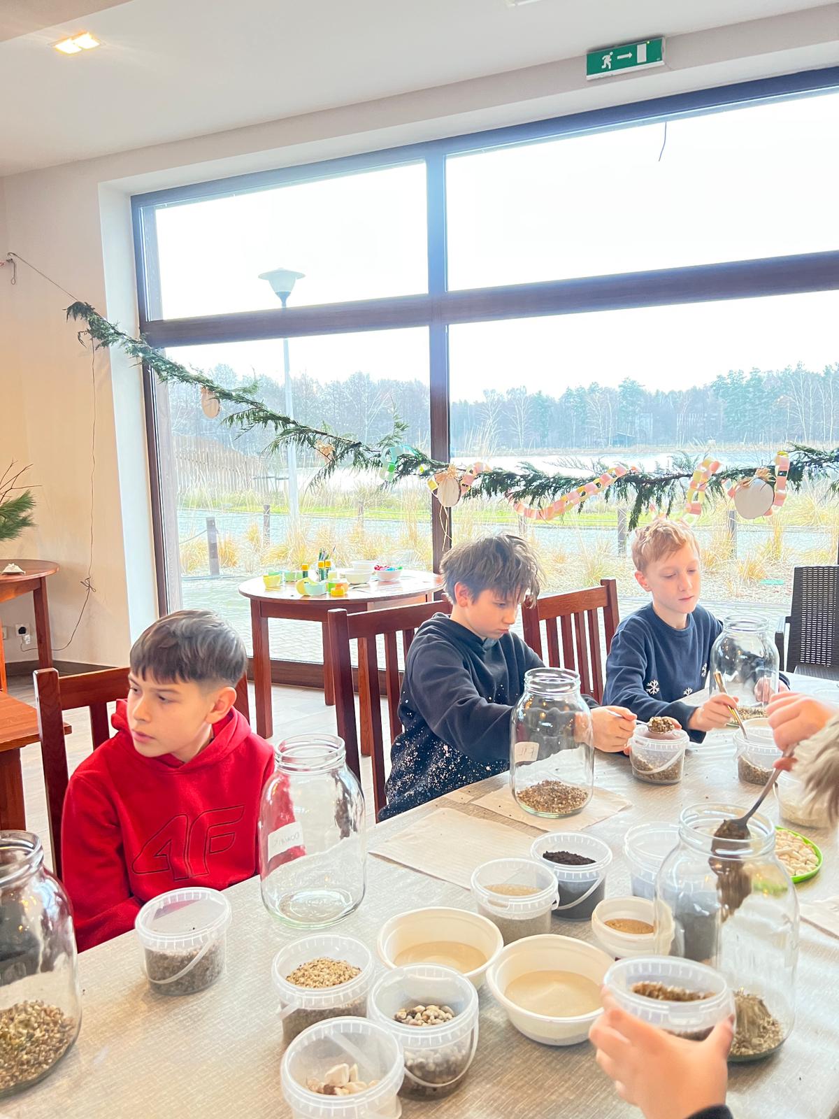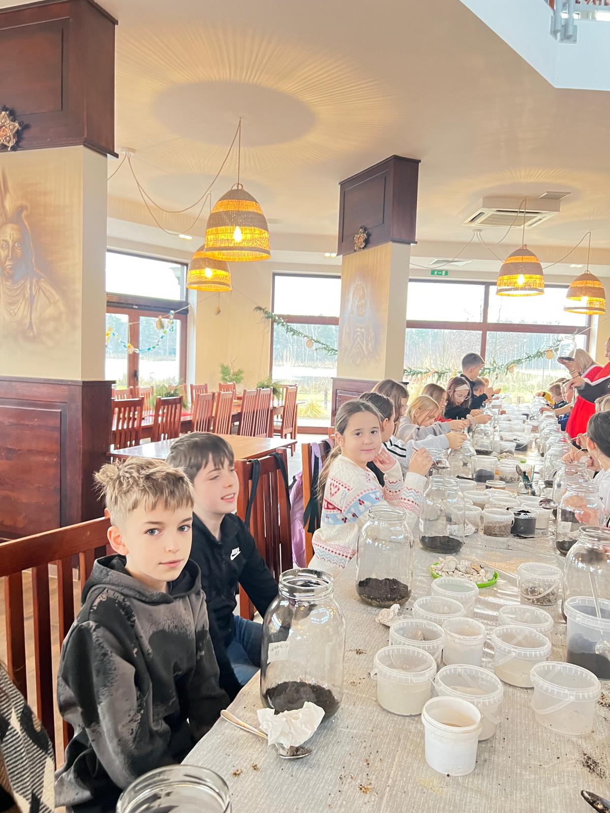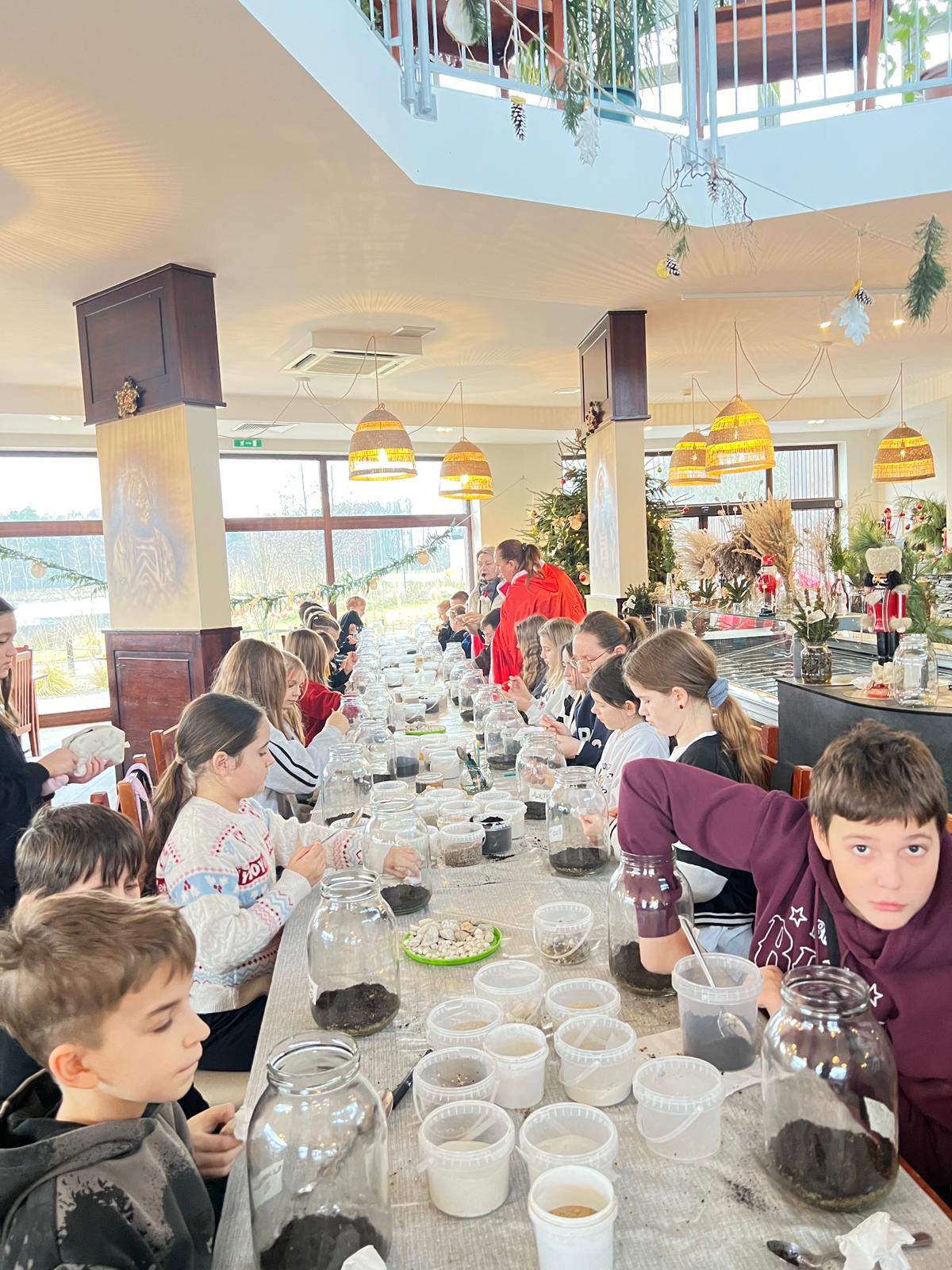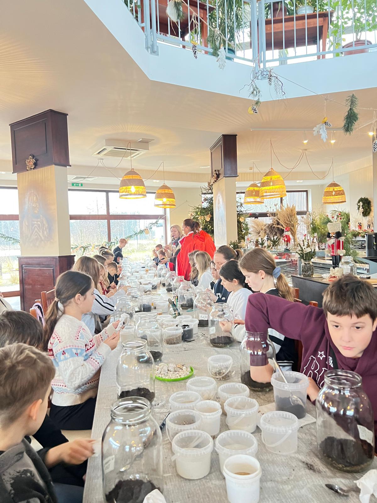 Na stołach czekało wszystko, co niezbędne, by stworzyć miniaturowy las: duże szklane słoje, piasek, żwir i ziemia, drobne kamienie oraz sadzonki karłowatych drzewek i mchu. Uczniowie z wielkim zaangażowaniem, krok po kroku, układali kolejne warstwy podłoża, a następnie sadzili rośliny, tworząc zachwycające kompozycje, przypominające prawdziwy, mały kawałek lasu.