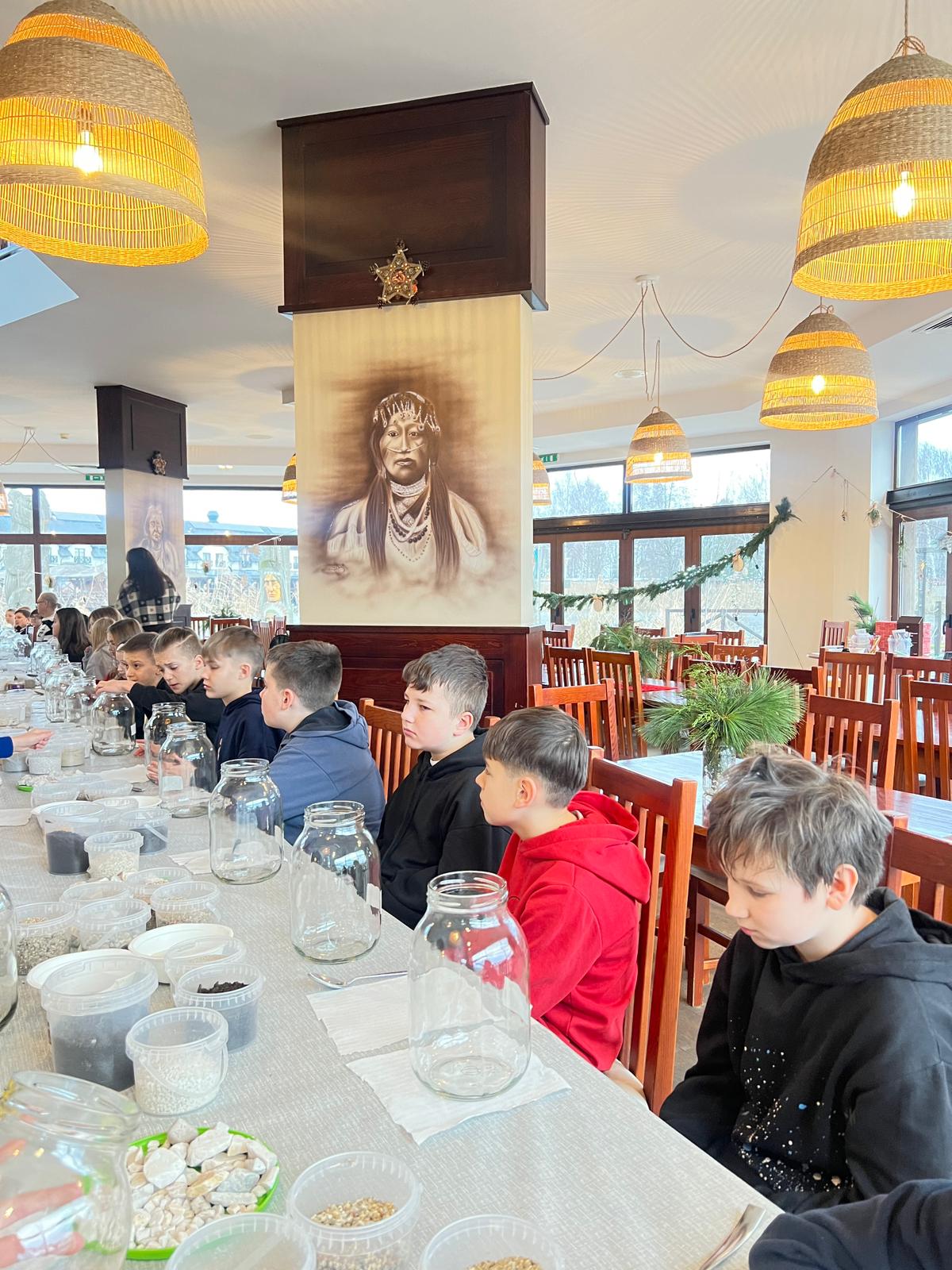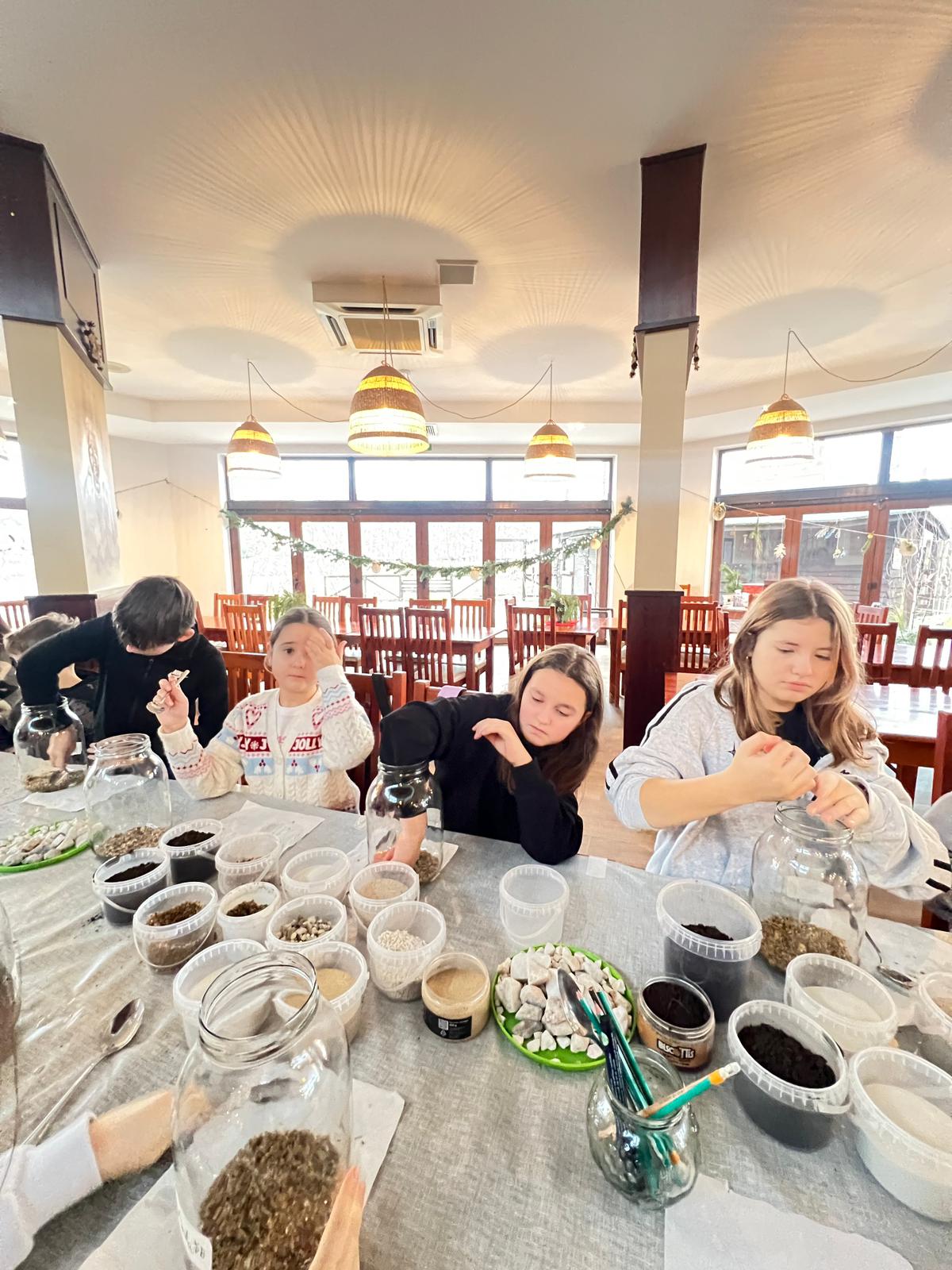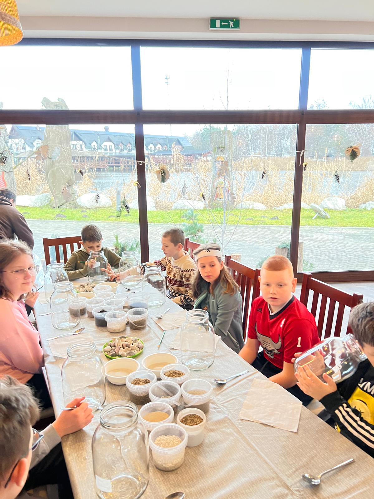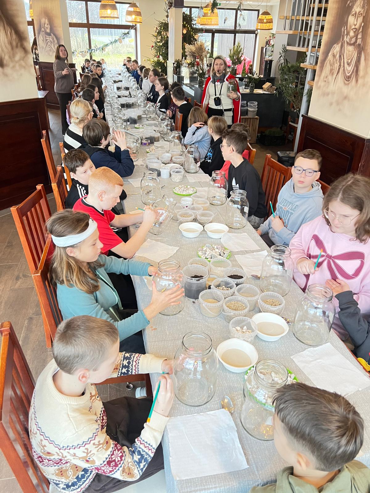 Na stołach czekało wszystko, co niezbędne, by stworzyć miniaturowy las: duże szklane słoje, piasek, żwir i ziemia, drobne kamienie oraz sadzonki karłowatych drzewek i mchu. Uczniowie z wielkim zaangażowaniem, krok po kroku, układali kolejne warstwy podłoża, a następnie sadzili rośliny, tworząc zachwycające kompozycje, przypominające prawdziwy, mały kawałek lasu.