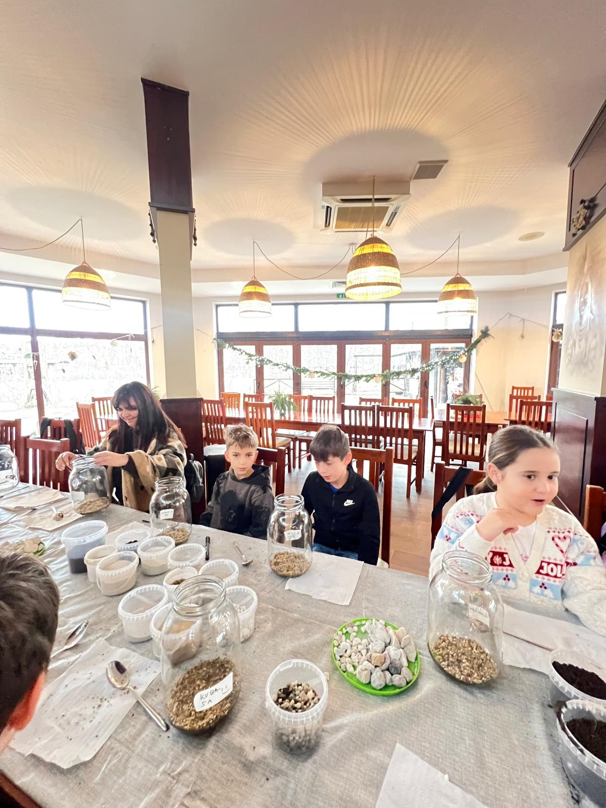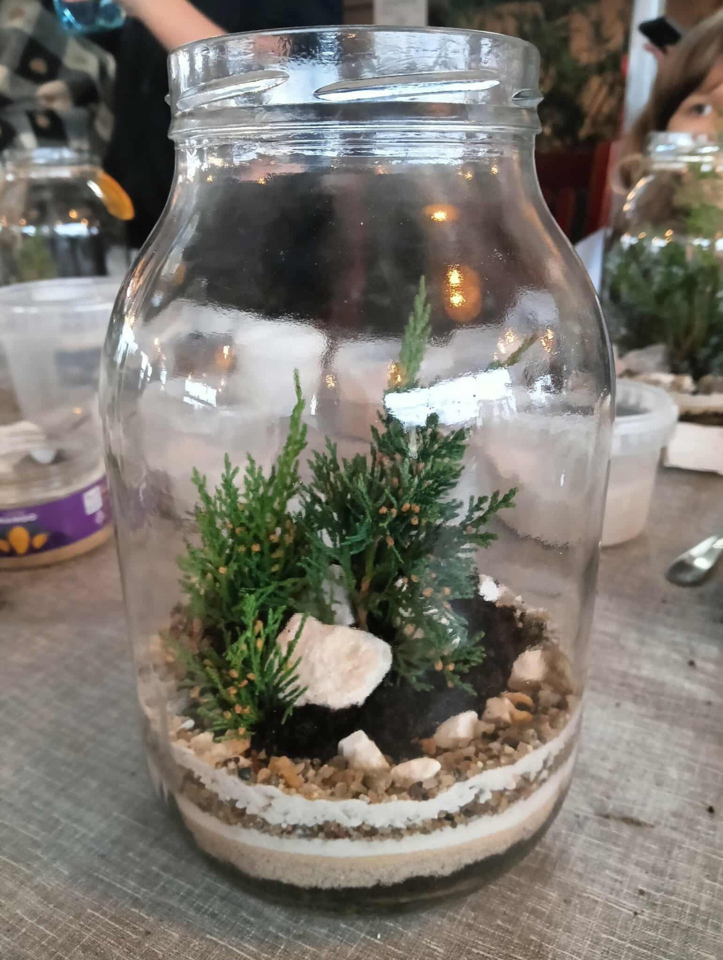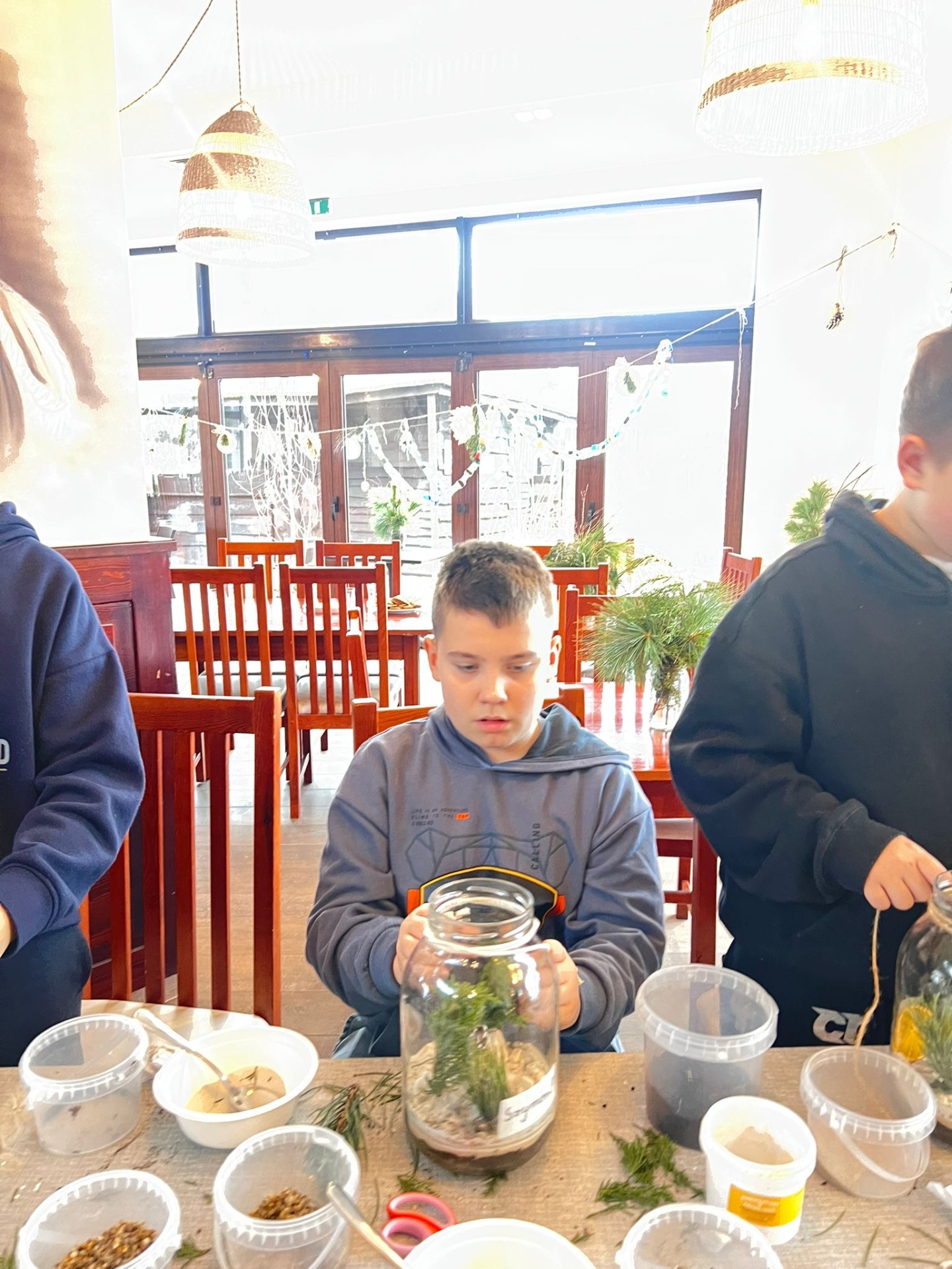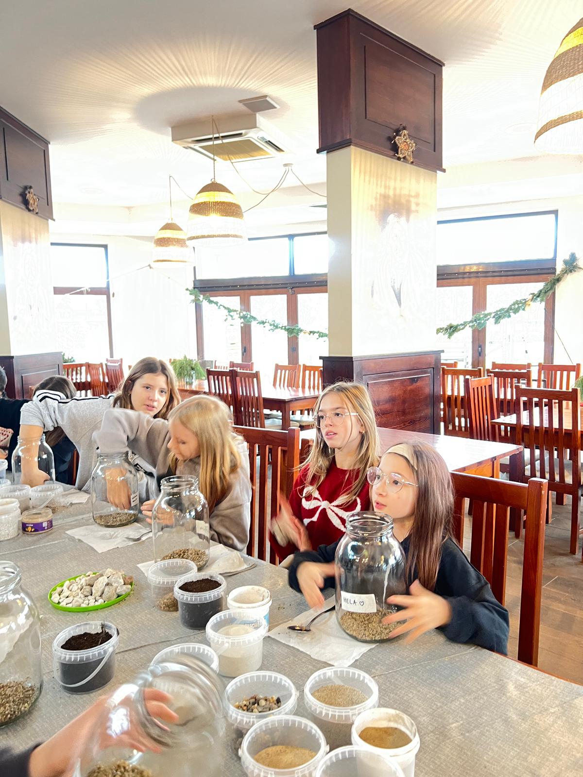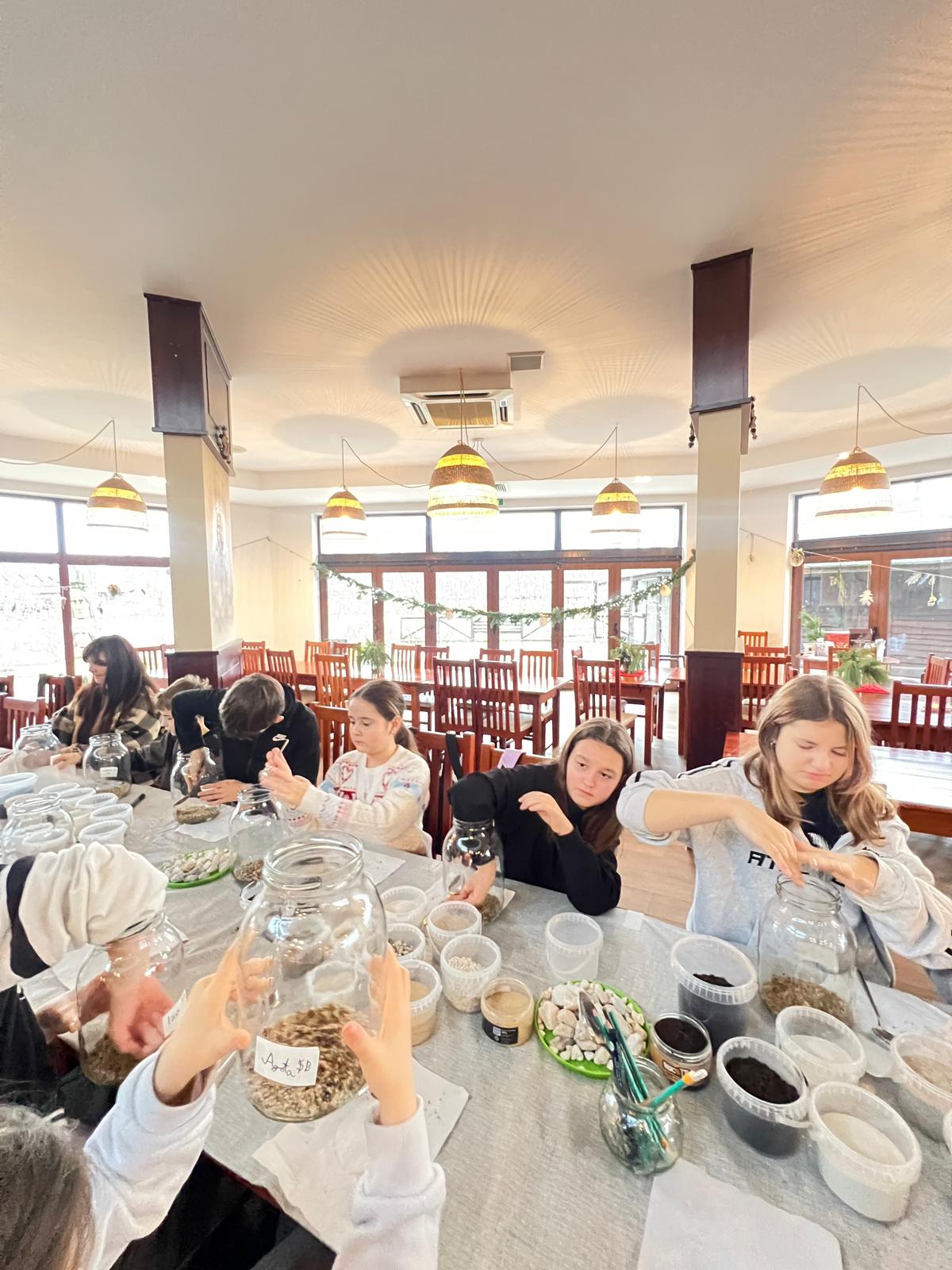 Na stołach czekało wszystko, co niezbędne, by stworzyć miniaturowy las: duże szklane słoje, piasek, żwir i ziemia, drobne kamienie oraz sadzonki karłowatych drzewek i mchu. Uczniowie z wielkim zaangażowaniem, krok po kroku, układali kolejne warstwy podłoża, a następnie sadzili rośliny, tworząc zachwycające kompozycje, przypominające prawdziwy, mały kawałek lasu.