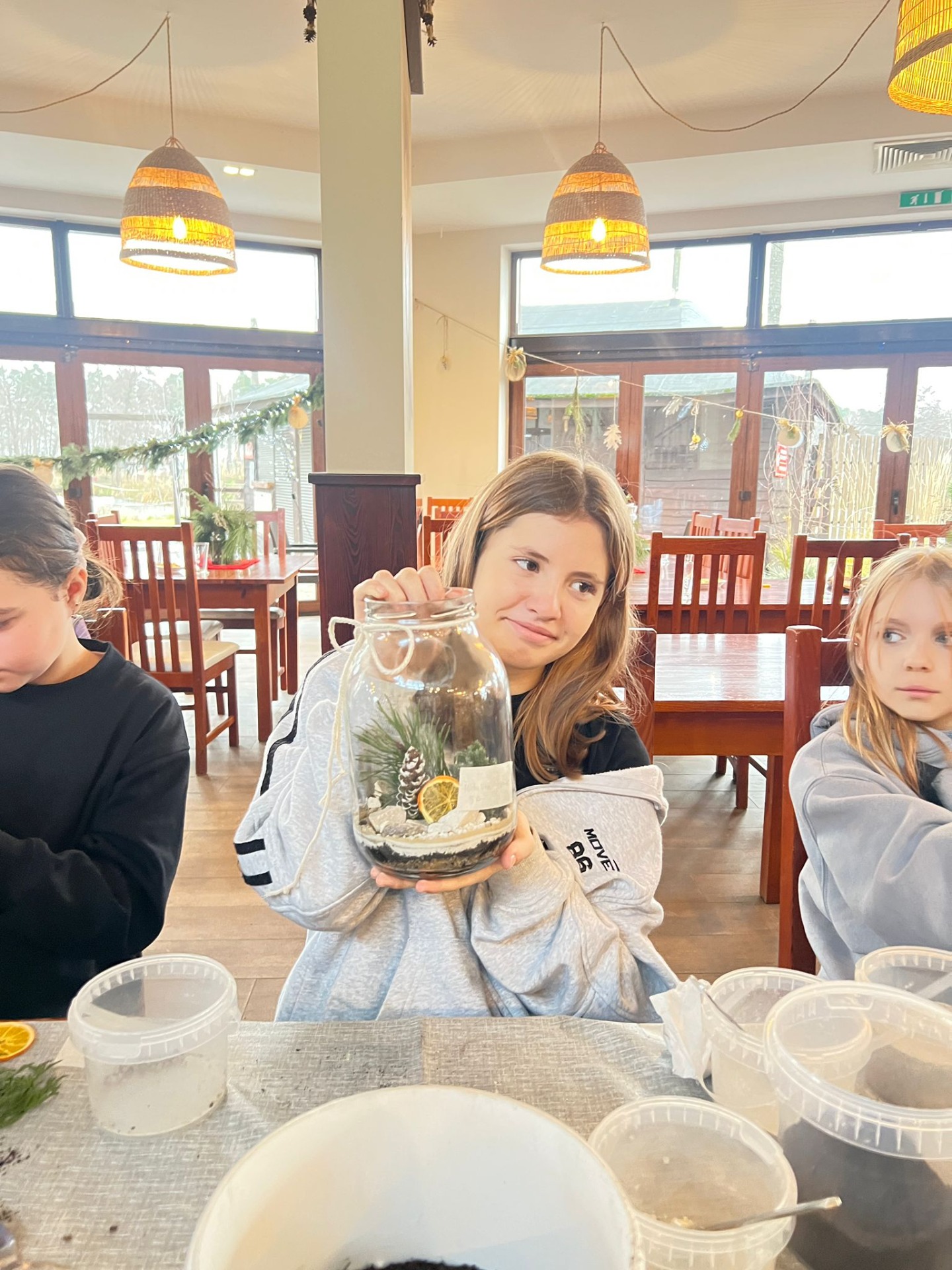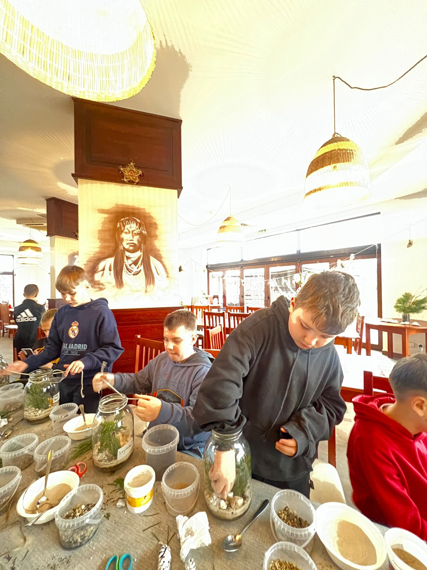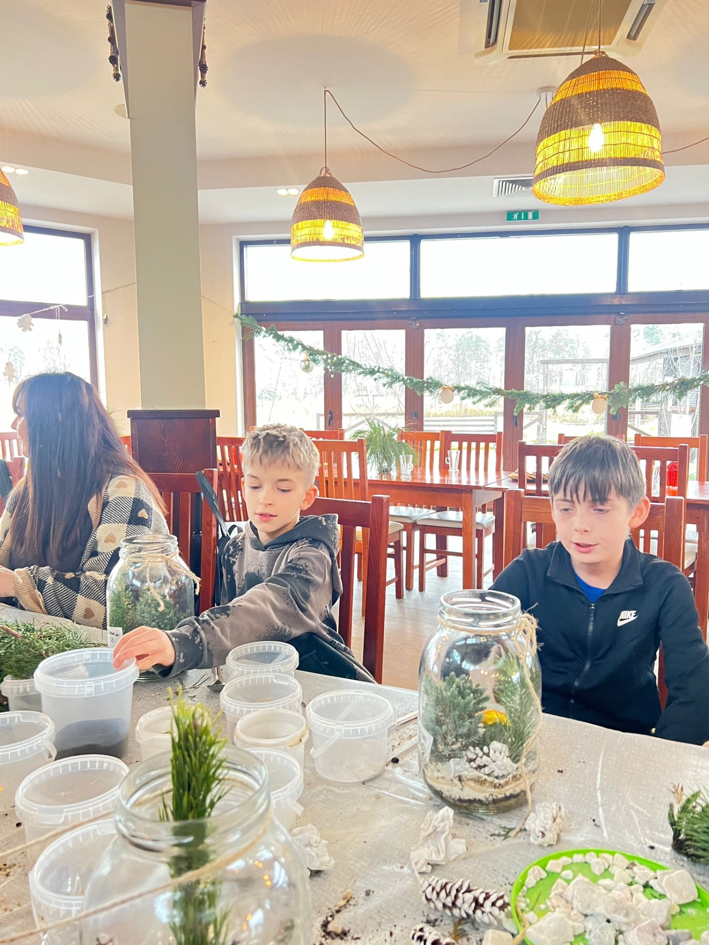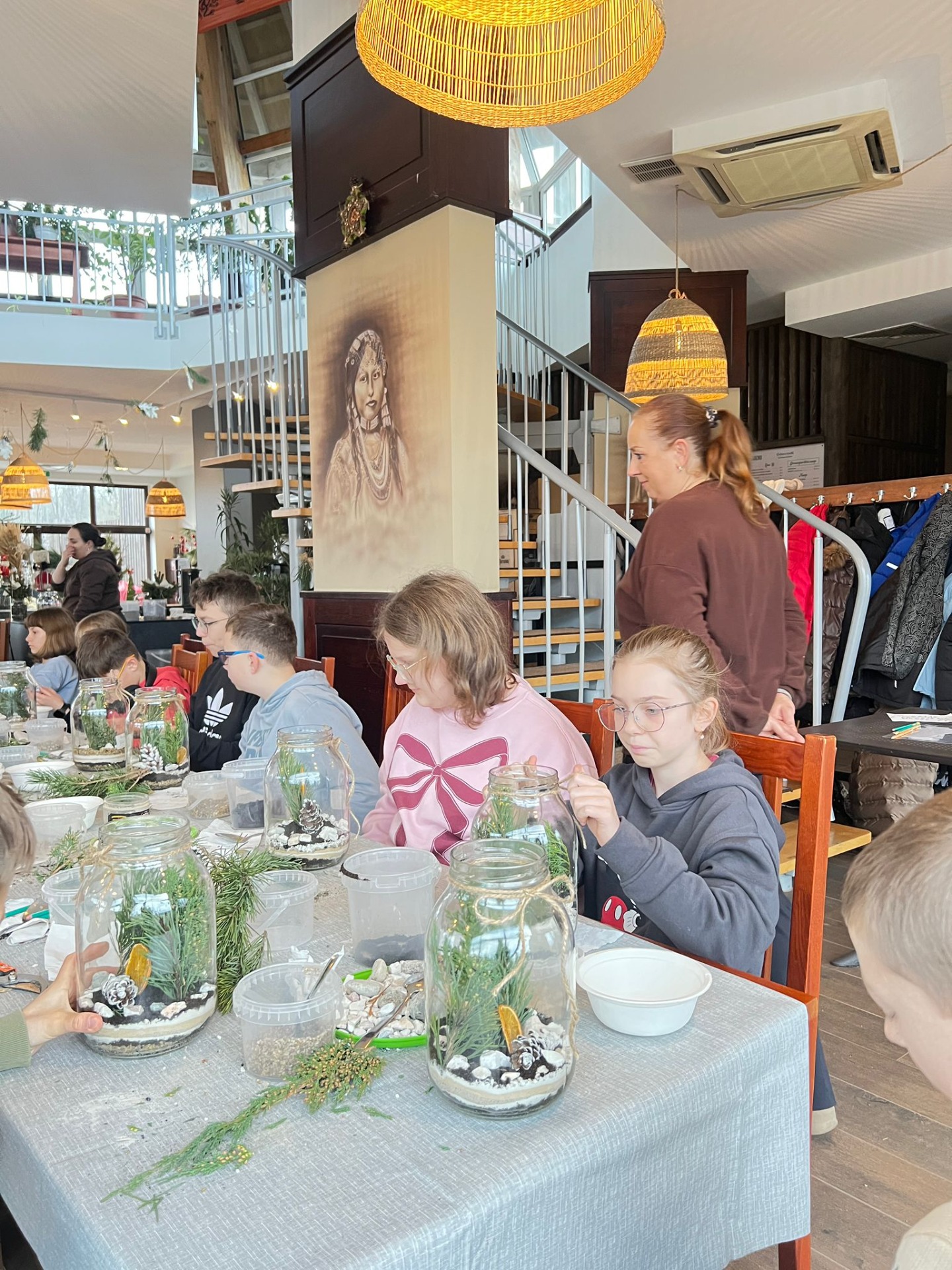 Na stołach czekało wszystko, co niezbędne, by stworzyć miniaturowy las: duże szklane słoje, piasek, żwir i ziemia, drobne kamienie oraz sadzonki karłowatych drzewek i mchu. Uczniowie z wielkim zaangażowaniem, krok po kroku, układali kolejne warstwy podłoża, a następnie sadzili rośliny, tworząc zachwycające kompozycje, przypominające prawdziwy, mały kawałek lasu.