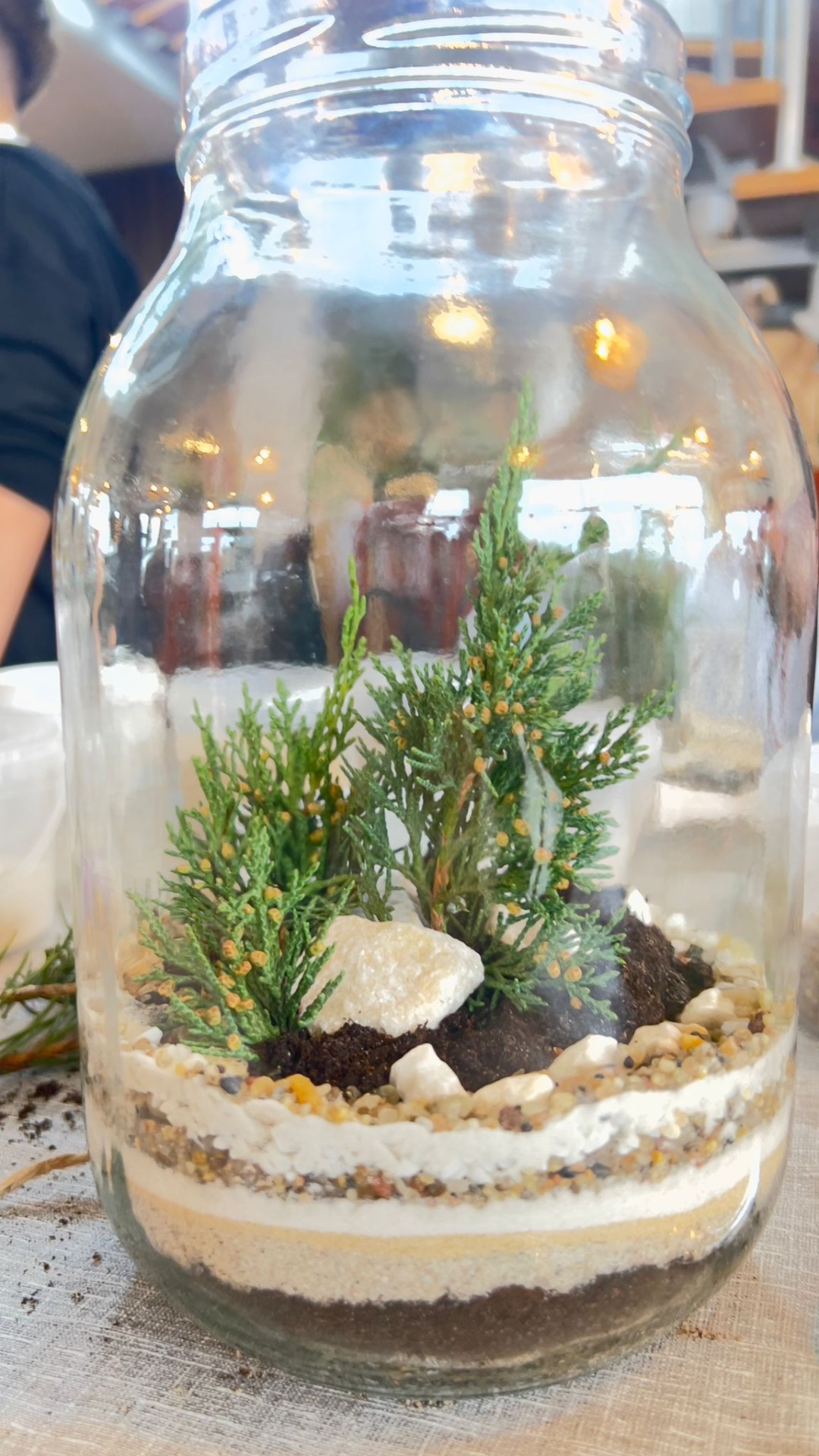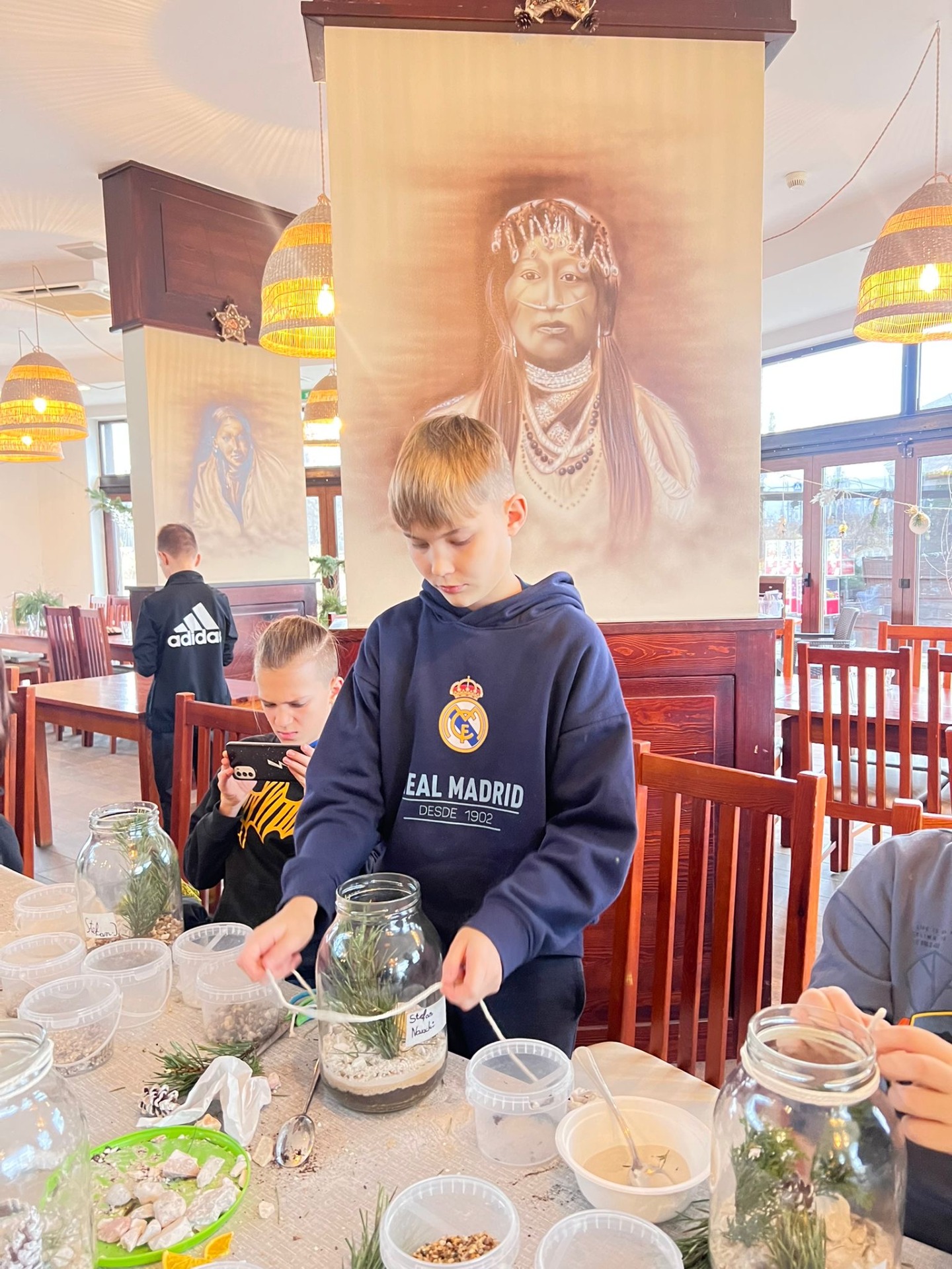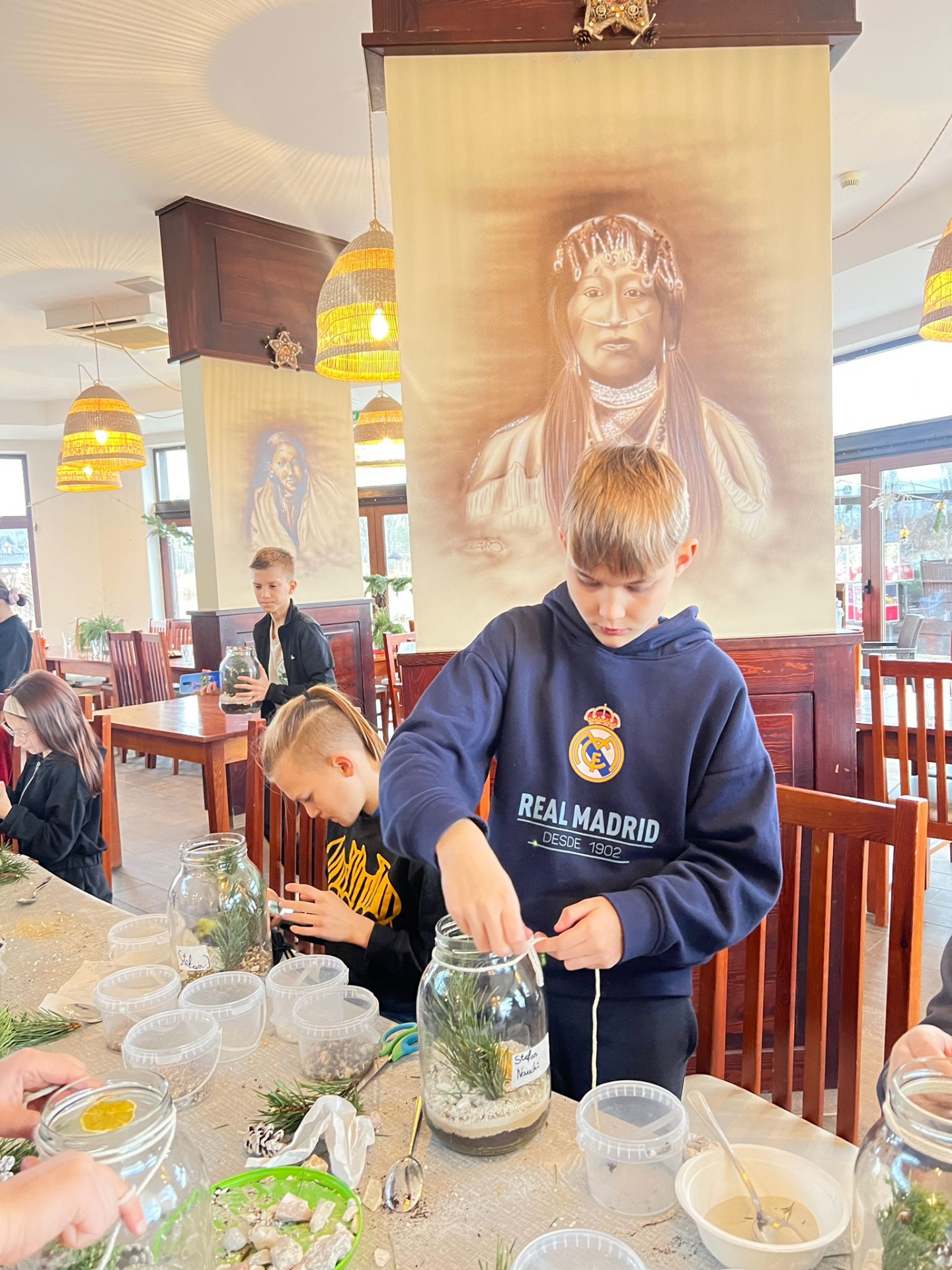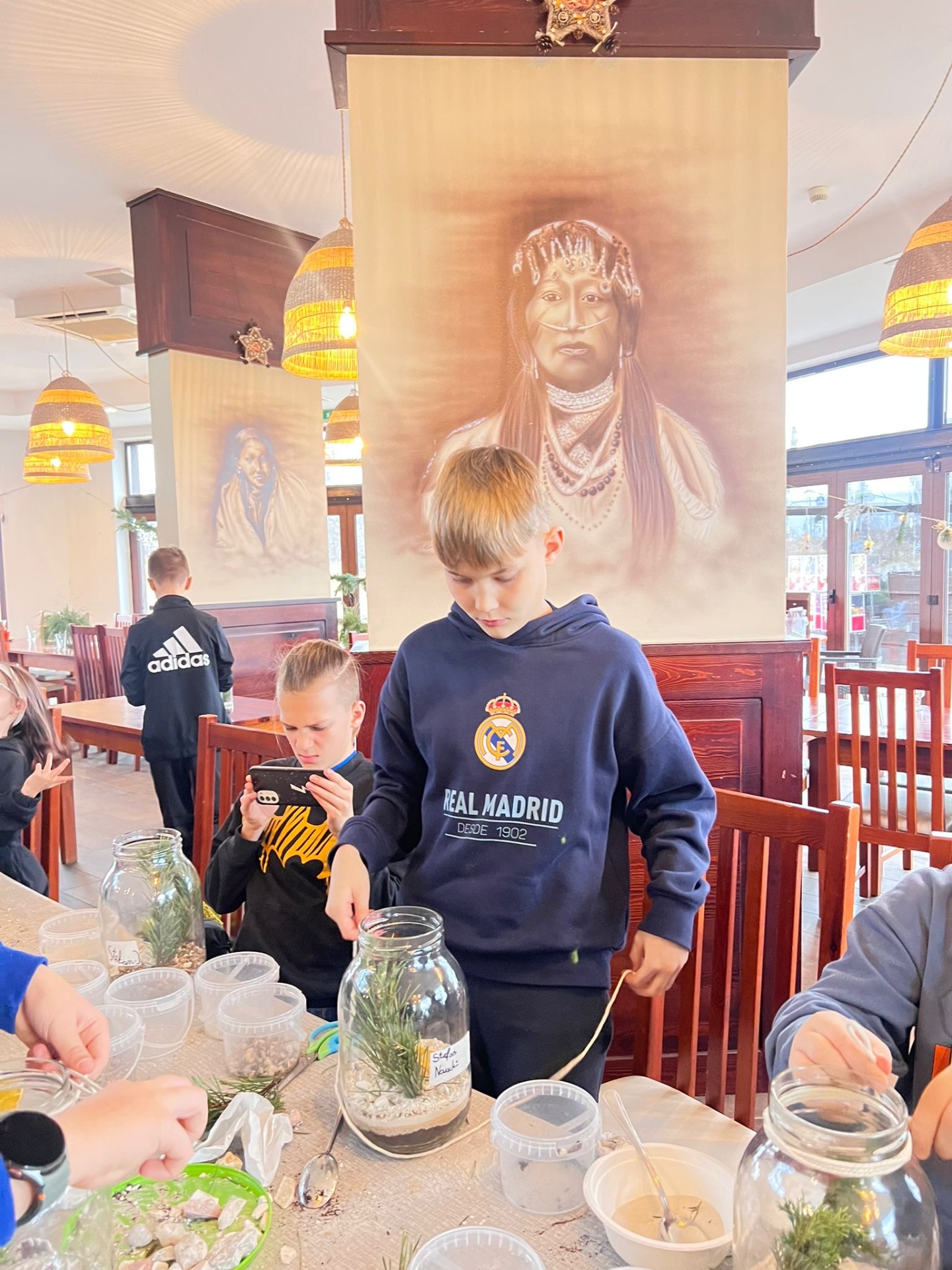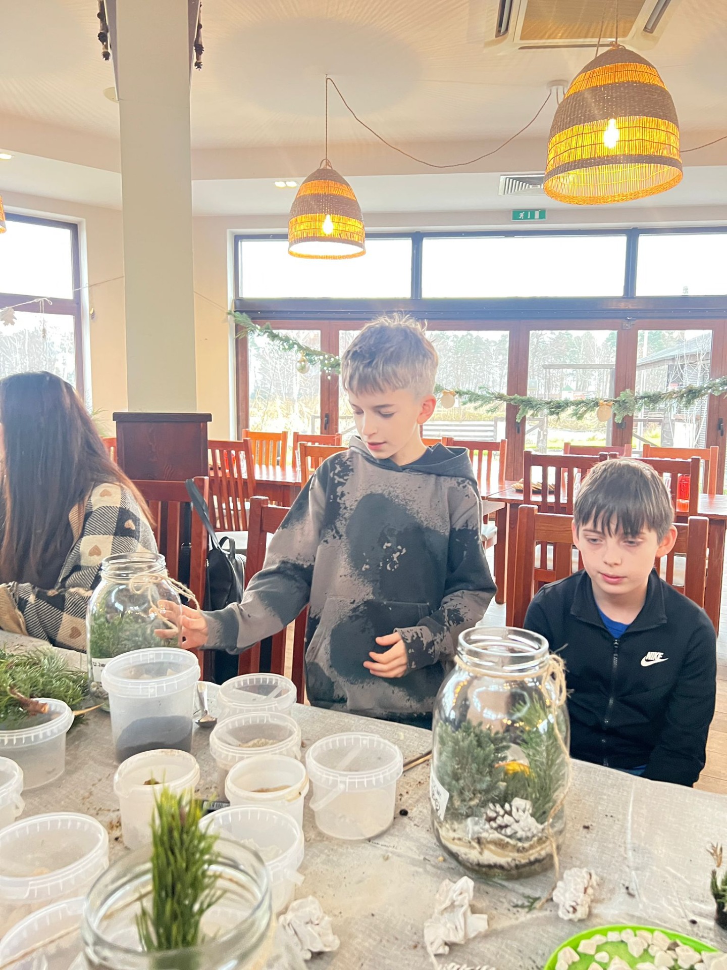 Na stołach czekało wszystko, co niezbędne, by stworzyć miniaturowy las: duże szklane słoje, piasek, żwir i ziemia, drobne kamienie oraz sadzonki karłowatych drzewek i mchu. Uczniowie z wielkim zaangażowaniem, krok po kroku, układali kolejne warstwy podłoża, a następnie sadzili rośliny, tworząc zachwycające kompozycje, przypominające prawdziwy, mały kawałek lasu.