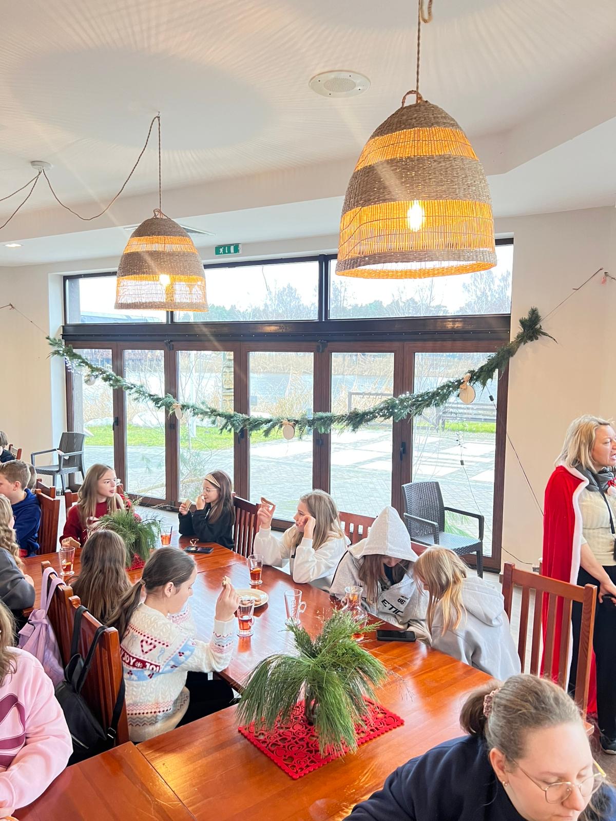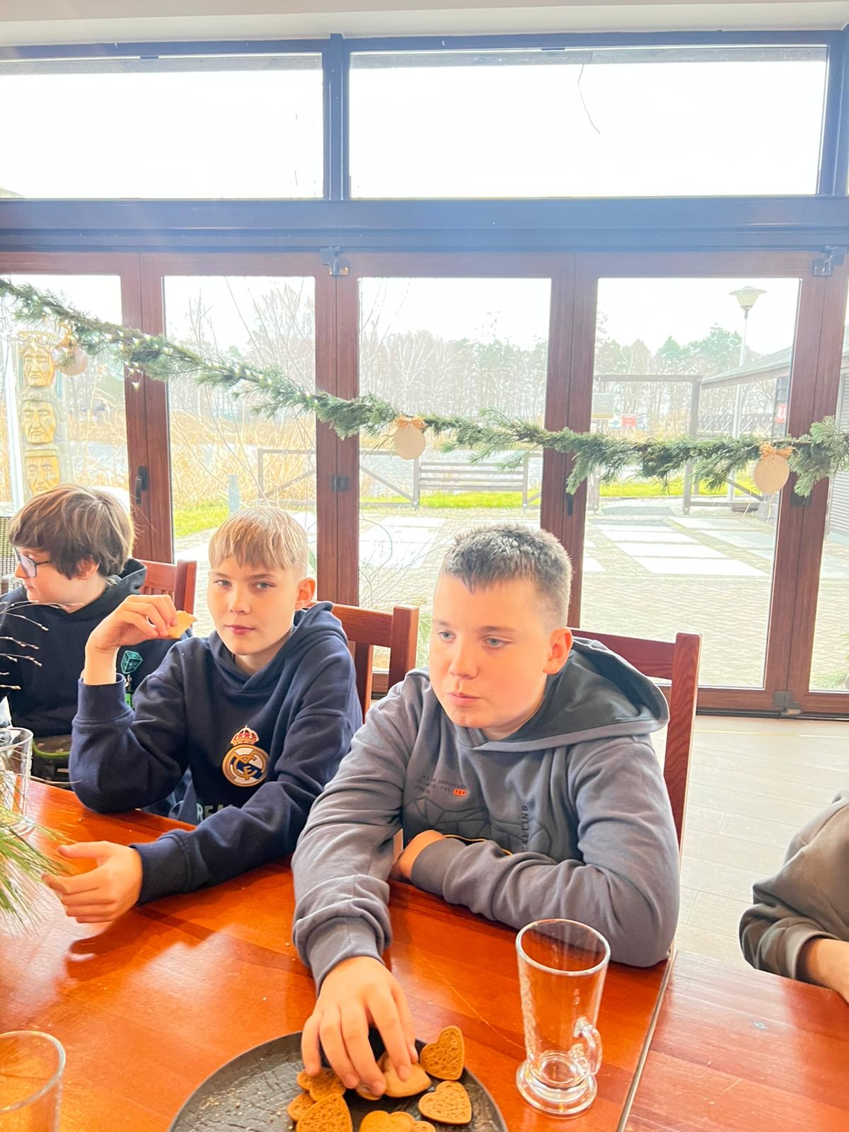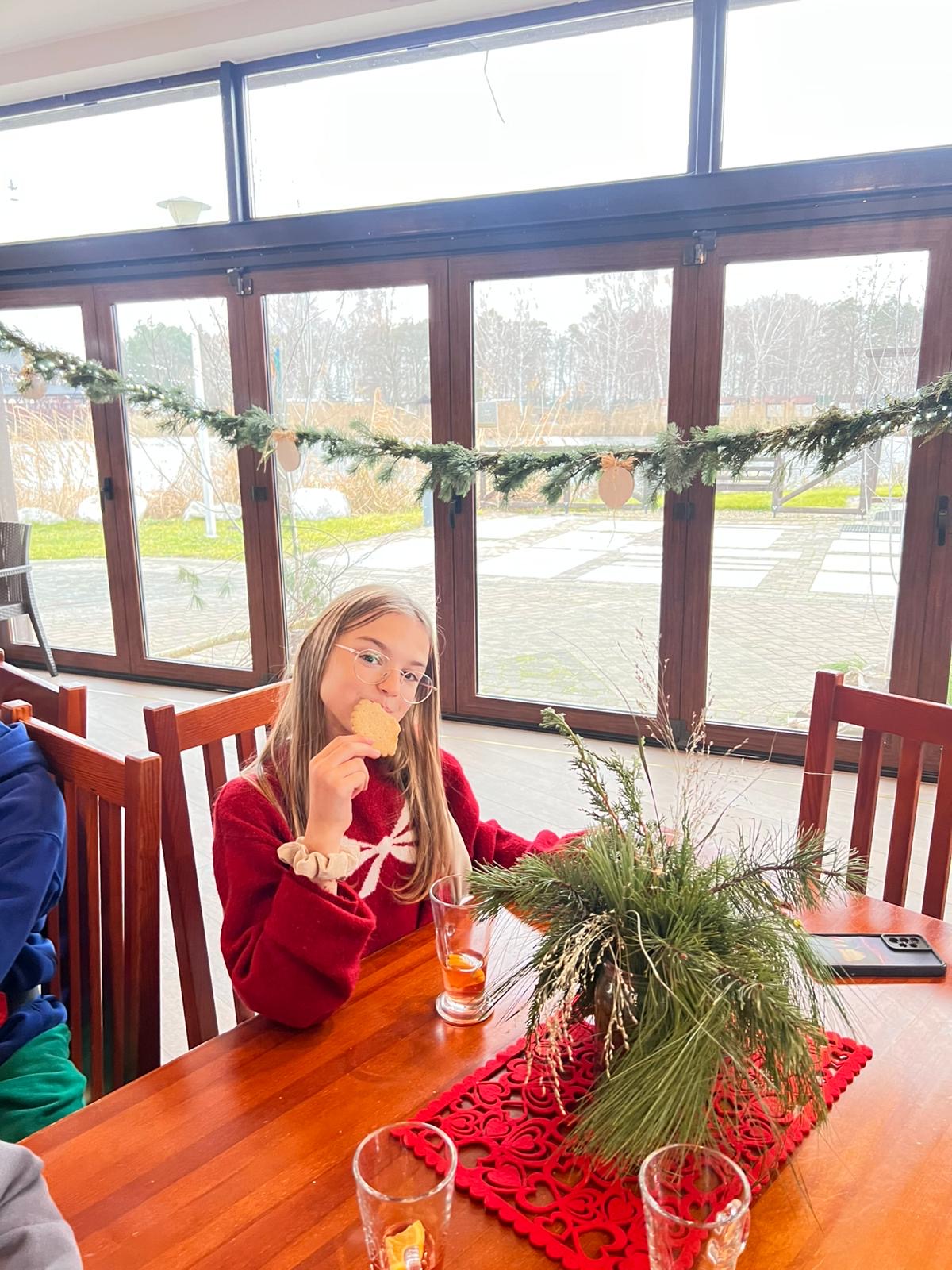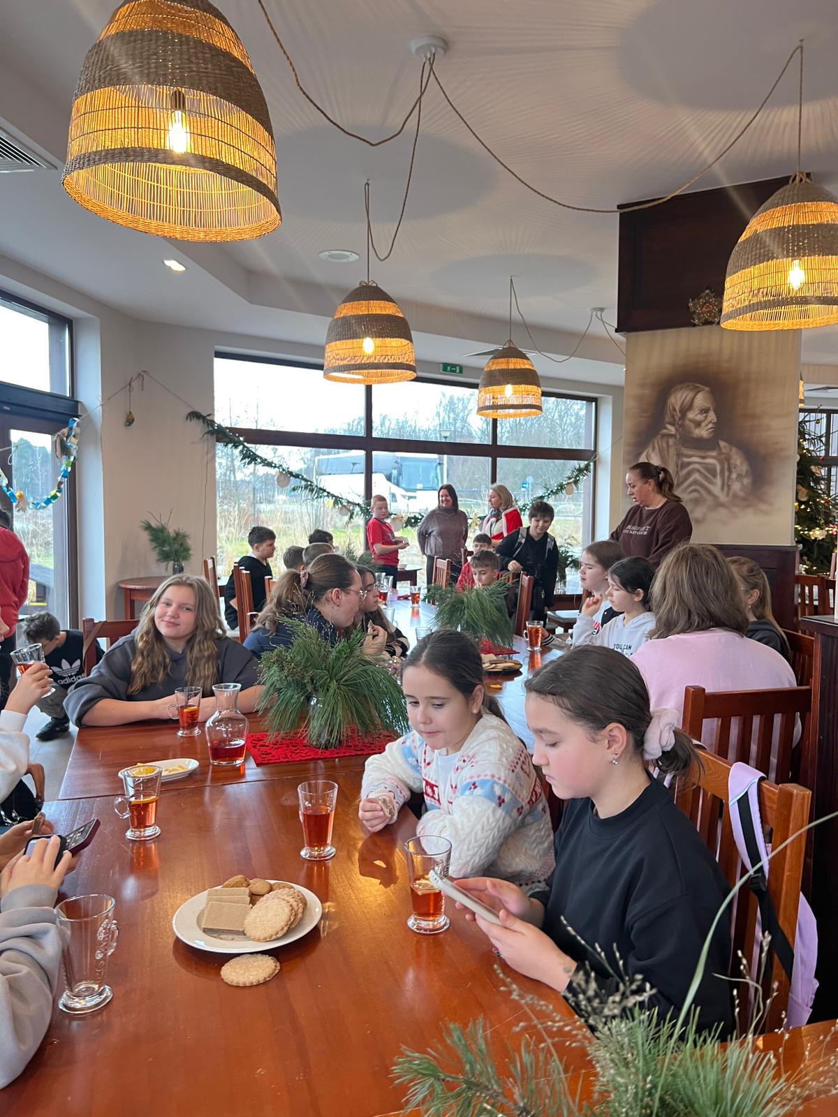 Po intensywnej pracy, nadszedł czas na chwilę relaksu. Przy świątecznie udekorowanej choince, uczniowie delektowali się pyszną, zimową aromatyczną herbatą oraz korzennymi ciasteczkami, nabierając sił przed kolejnymi atrakcjami.