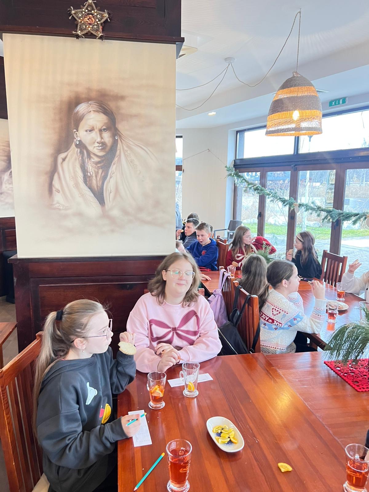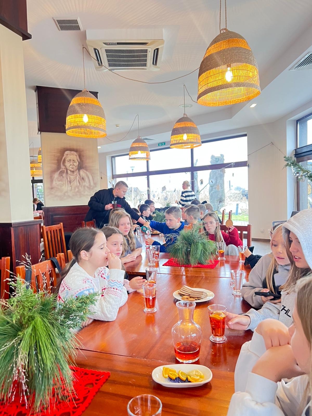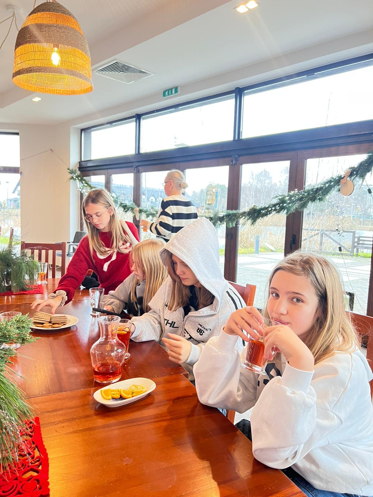Po intensywnej pracy, nadszedł czas na chwilę relaksu. Przy świątecznie udekorowanej choince, uczniowie delektowali się pyszną, zimową aromatyczną herbatą oraz korzennymi ciasteczkami, nabierając sił przed kolejnymi atrakcjami.