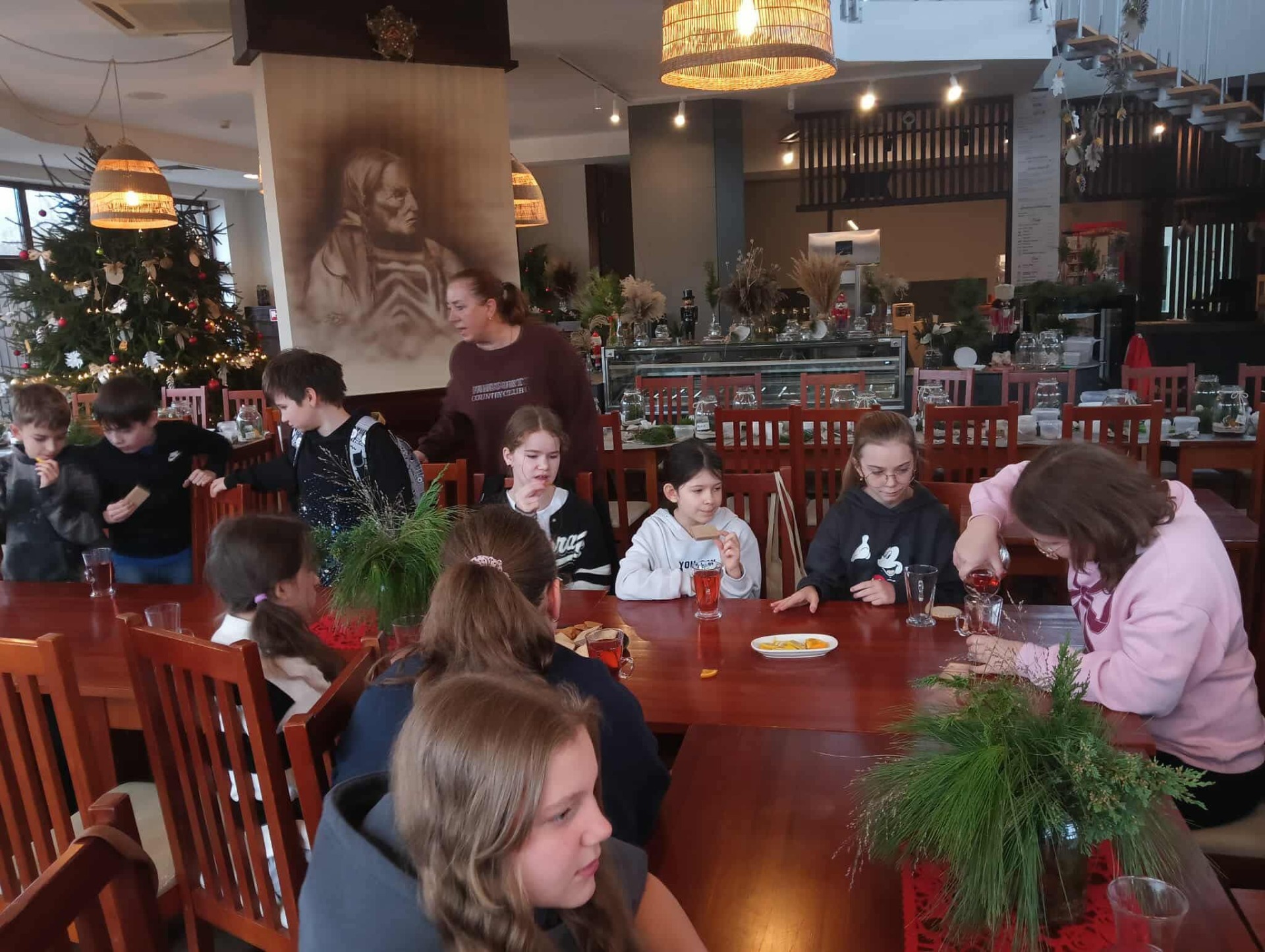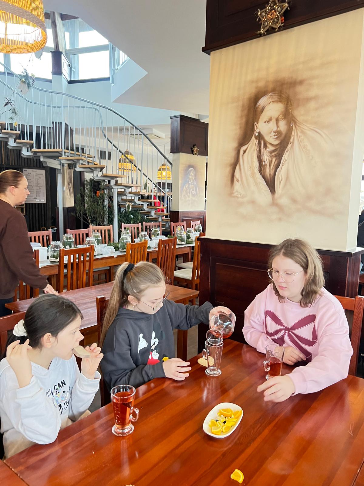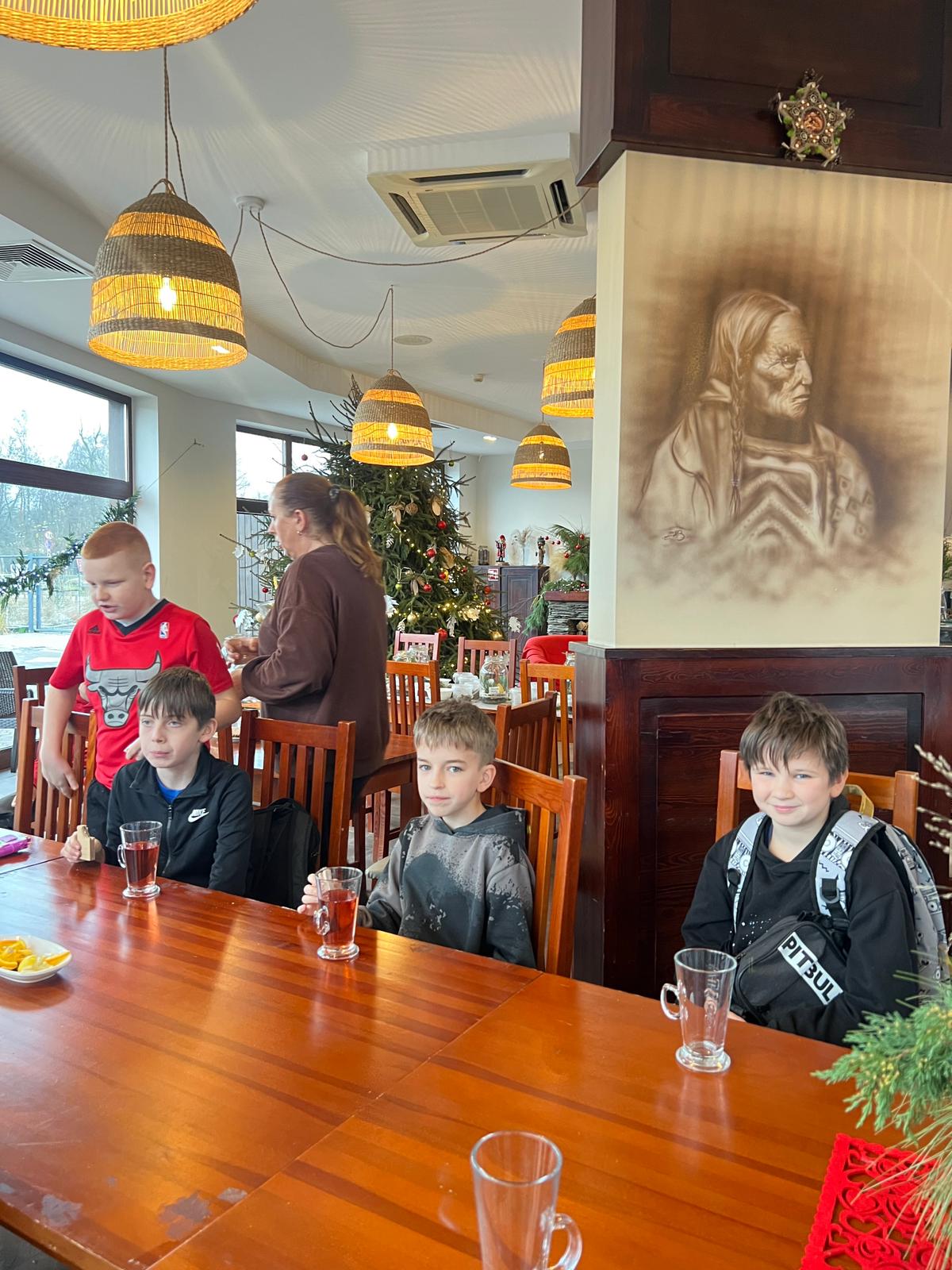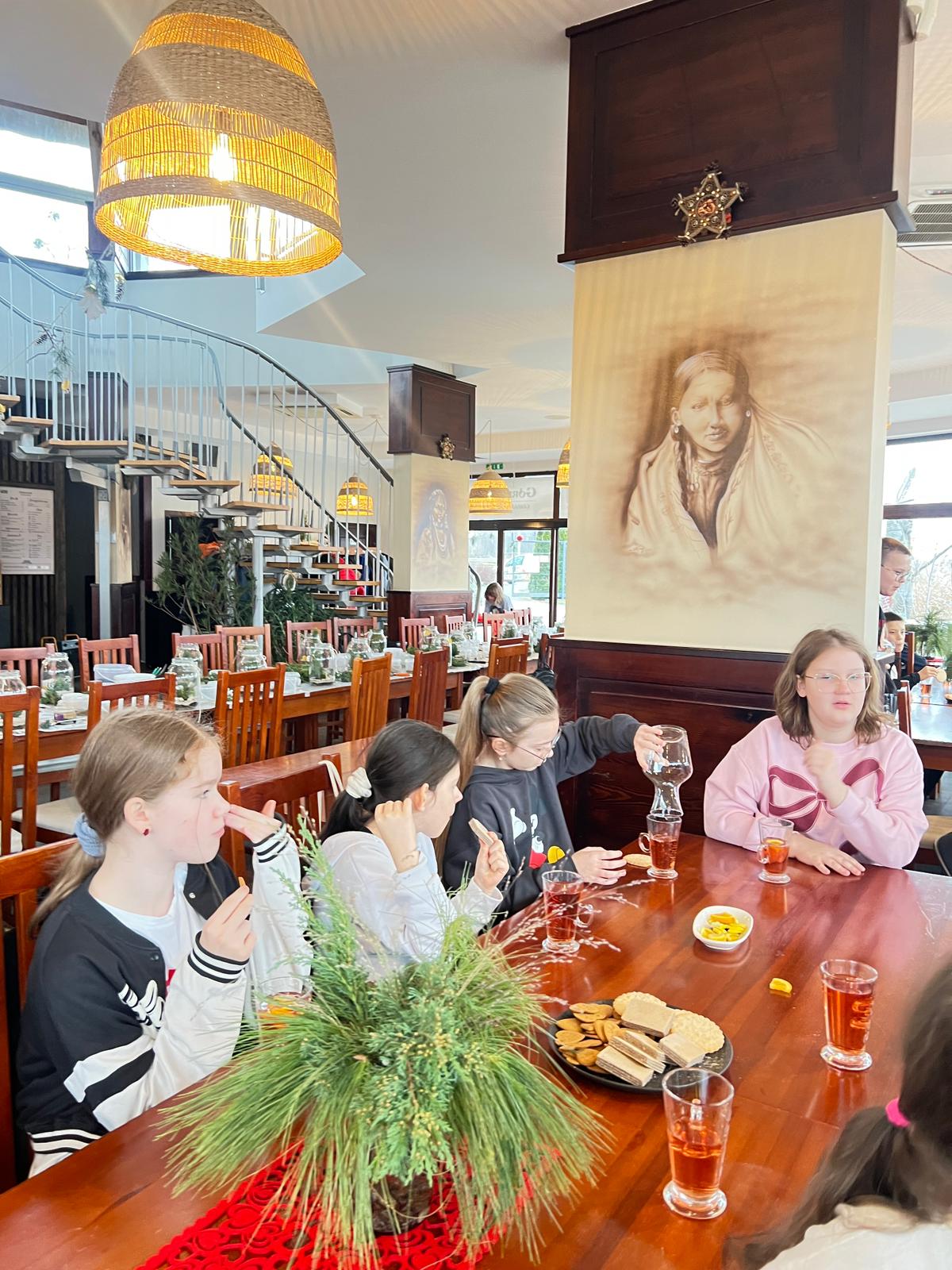 Po intensywnej pracy, nadszedł czas na chwilę relaksu. Przy świątecznie udekorowanej choince, uczniowie delektowali się pyszną, zimową aromatyczną herbatą oraz korzennymi ciasteczkami, nabierając sił przed kolejnymi atrakcjami.
