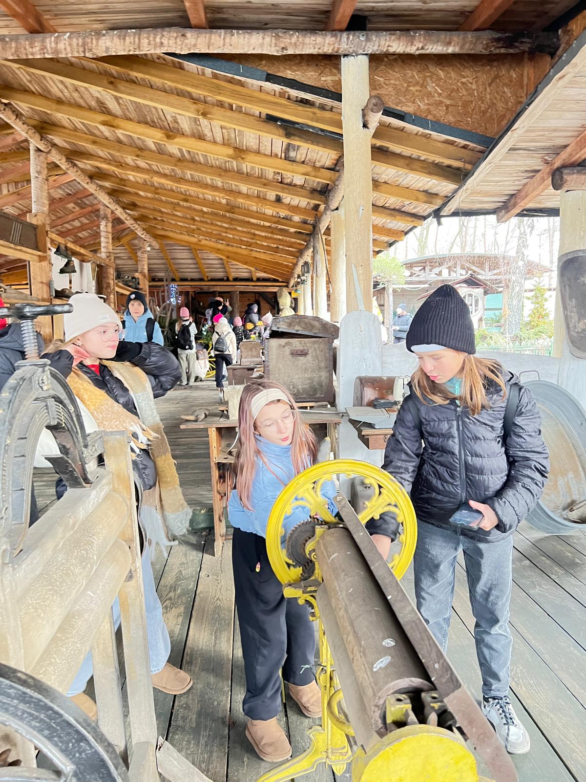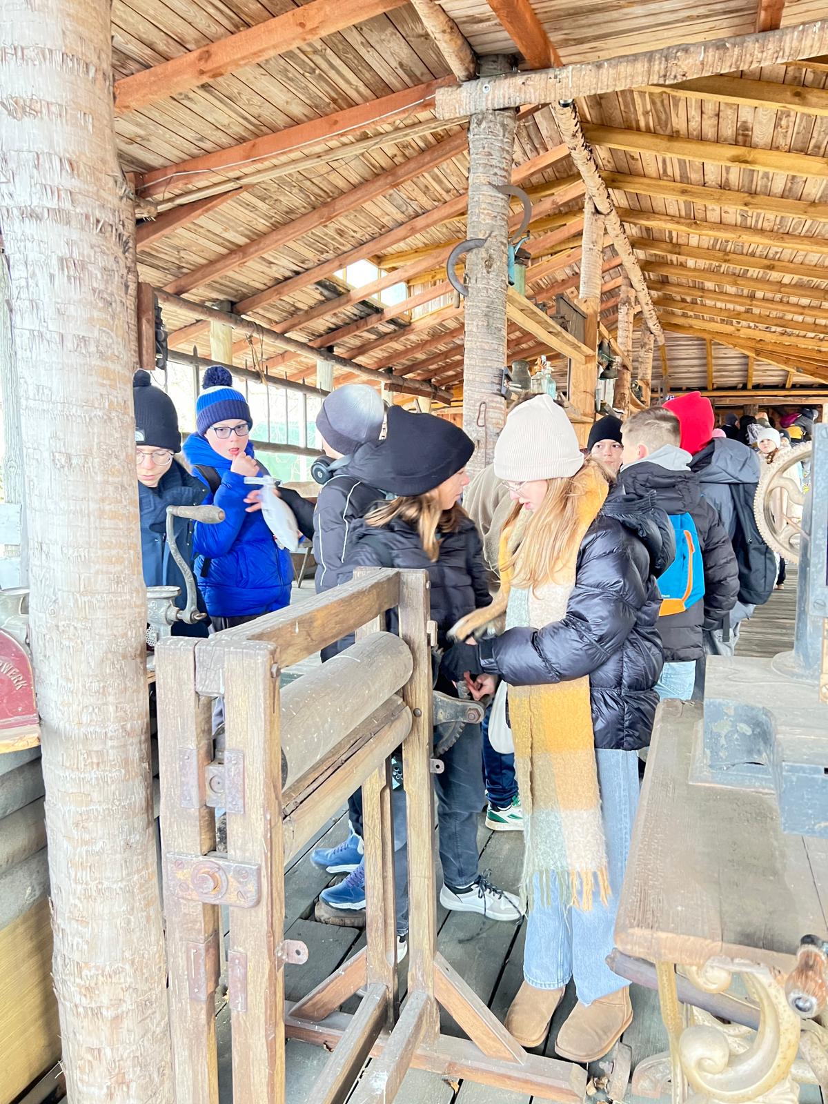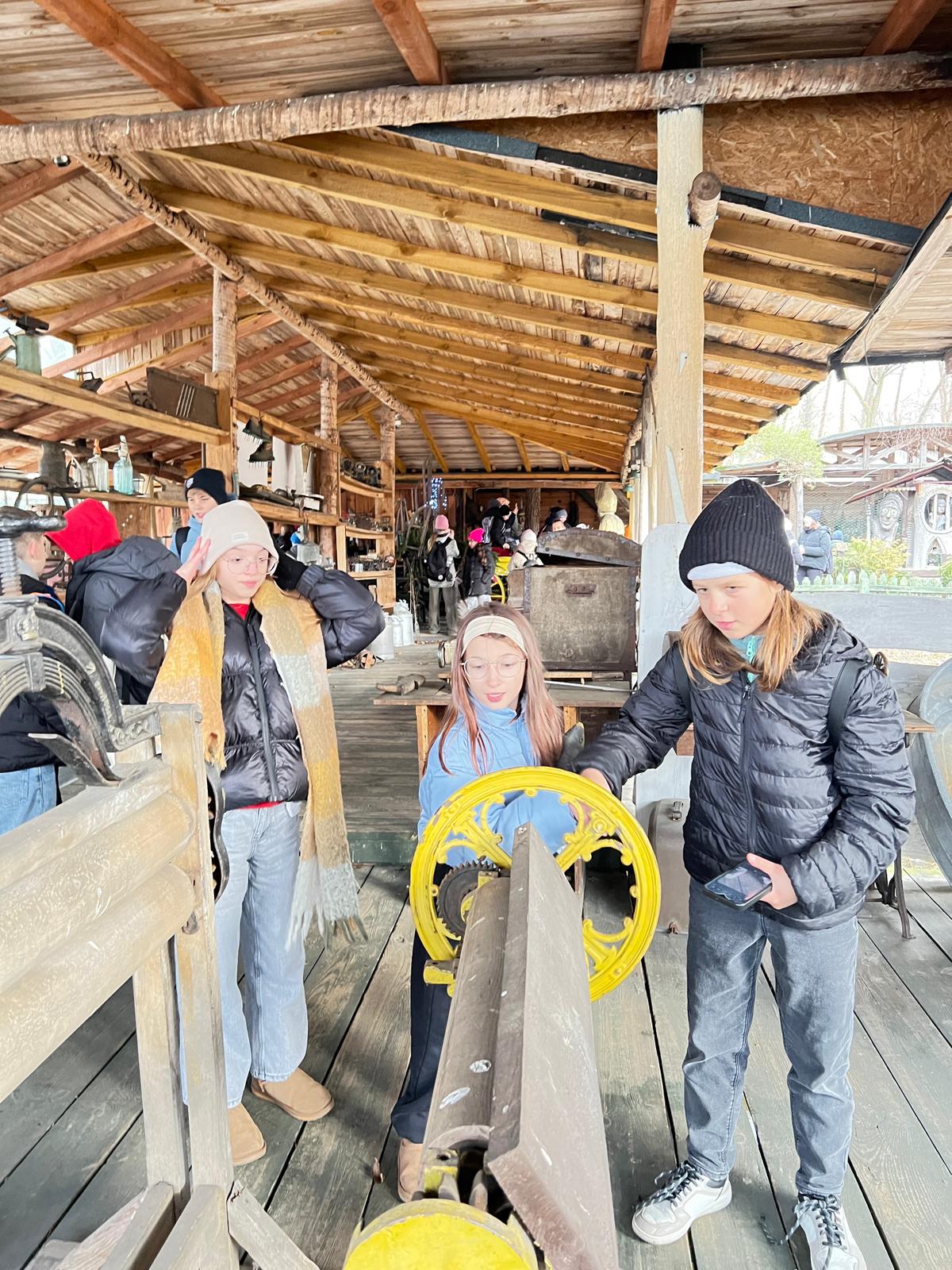 A kolejne atrakcje czekały tuż za rogiem. Tak oto przyszedł czas na fascynującą podróż w czasie. W plenerowej przestrzeni, pod drewnianym dachem, uczniowie wzięli udział w warsztatach poświęconych dawnej wsi. Mieli okazję poznać życie naszych przodków, a także zobaczyć na własne oczy stare maszyny rolnicze i sprzęty domowe.