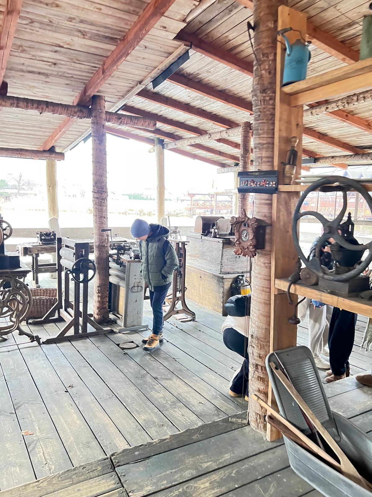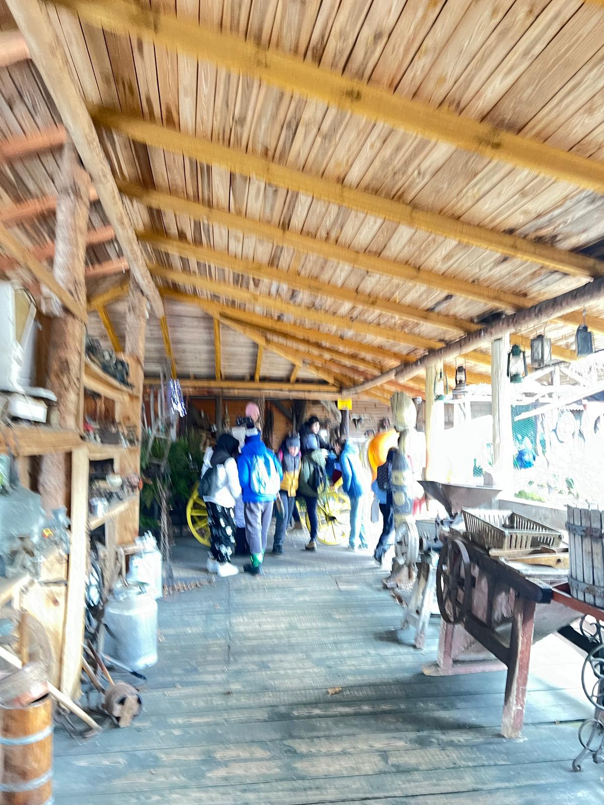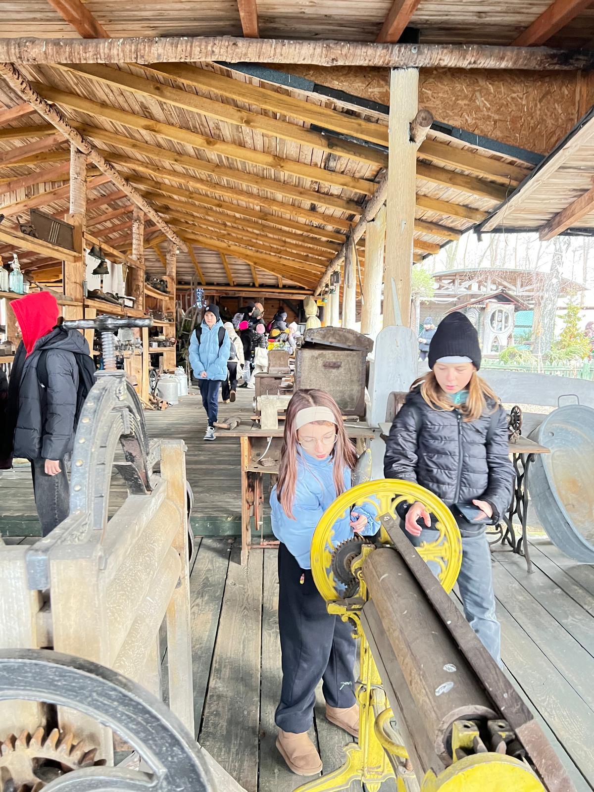 A kolejne atrakcje czekały tuż za rogiem. Tak oto przyszedł czas na fascynującą podróż w czasie. W plenerowej przestrzeni, pod drewnianym dachem, uczniowie wzięli udział w warsztatach poświęconych dawnej wsi. Mieli okazję poznać życie naszych przodków, a także zobaczyć na własne oczy stare maszyny rolnicze i sprzęty domowe.