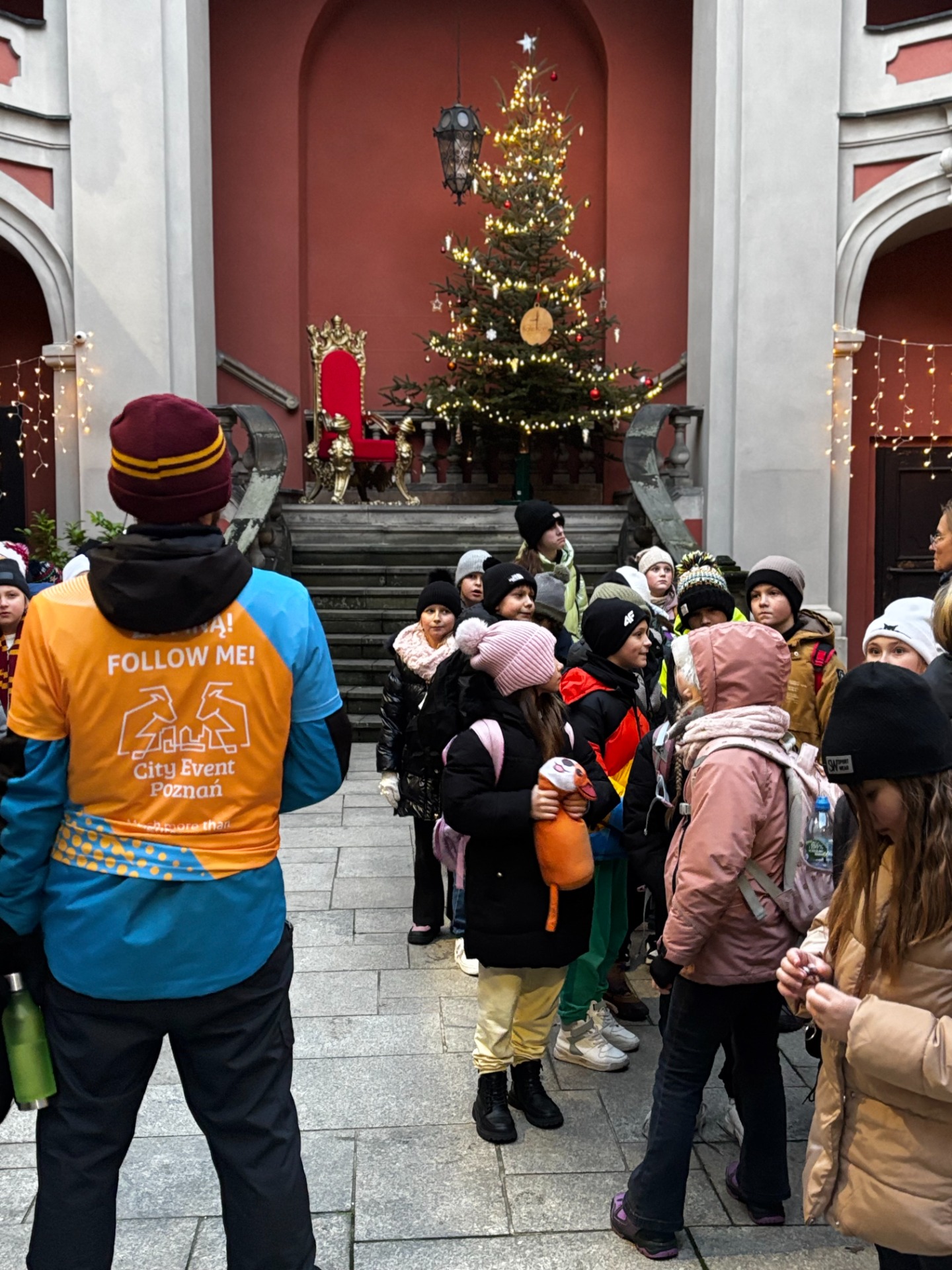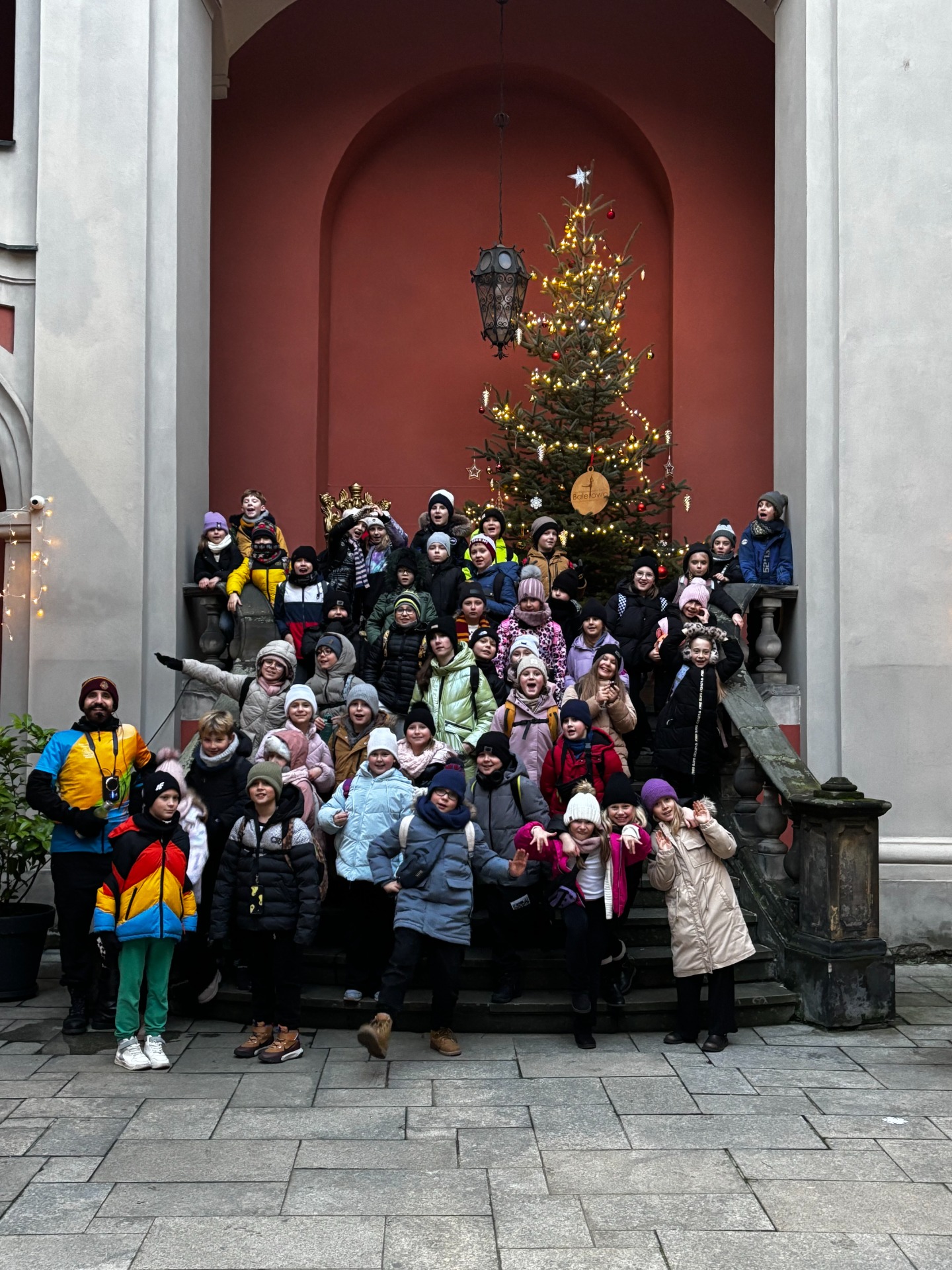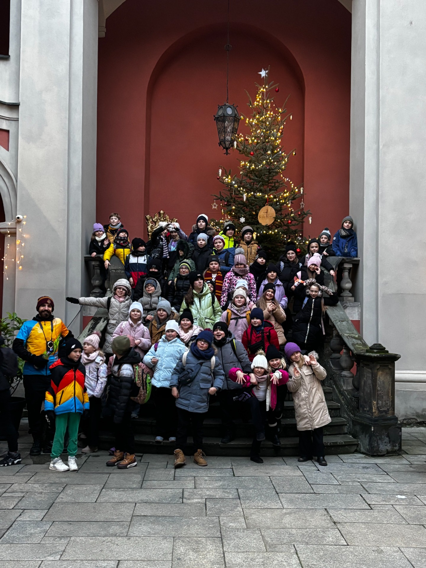 Aby odzyskać kalorie spalone na tropieniu lwów, uczniowie skusili się na ciepłą czekoladę z jarmarku bożonarodzeniowego. Było słodko, lepko i absolutnie cudownie. Wokół piękne światełka, muzyka świąteczna i piękna choinka przyozdobiona bombkami - niektóre wyglądały jak koziołki. W takiej atmosferze ratusz, pręgierz i okno, którego nie ma, prezentowały się przepięknie.