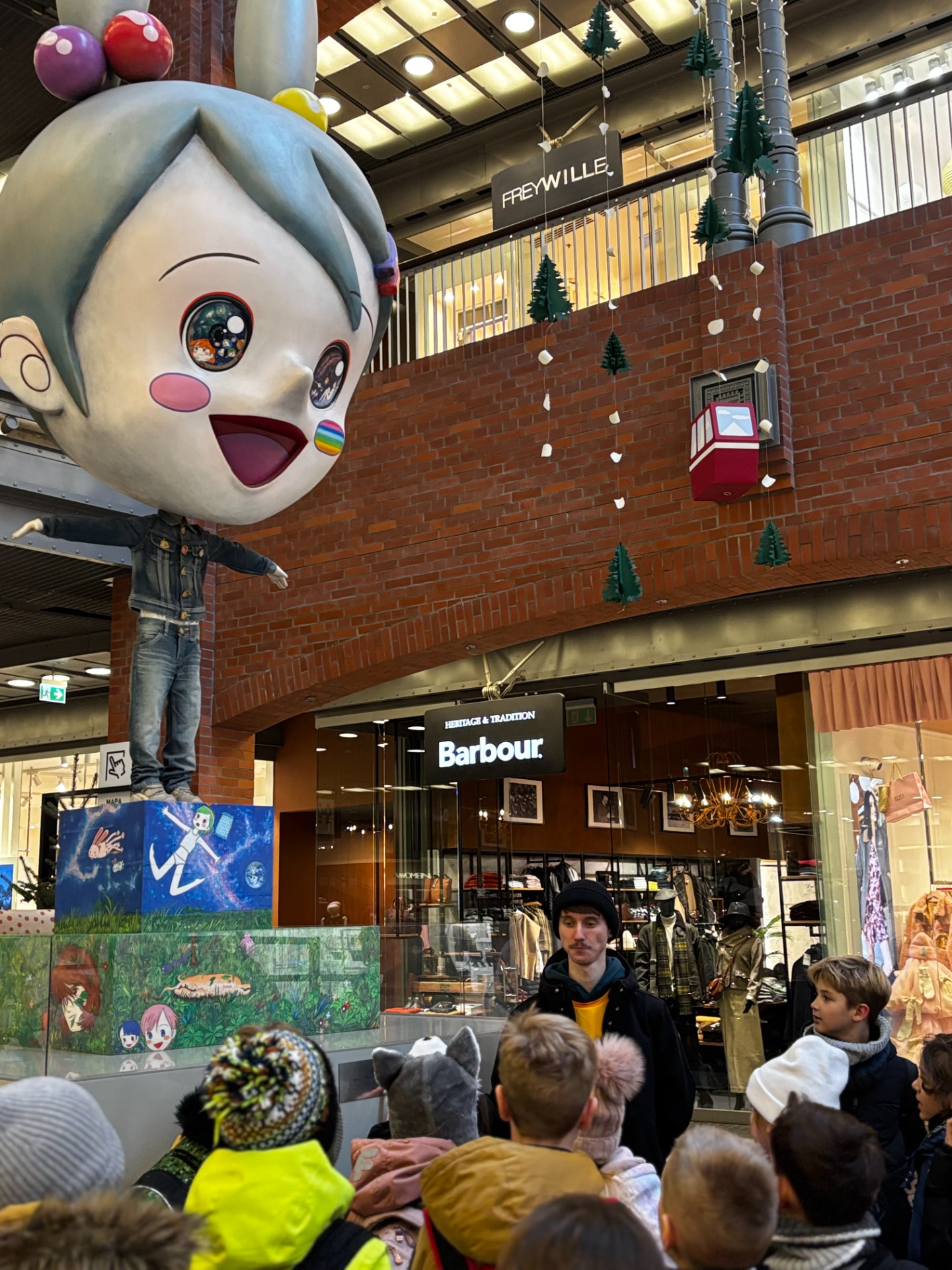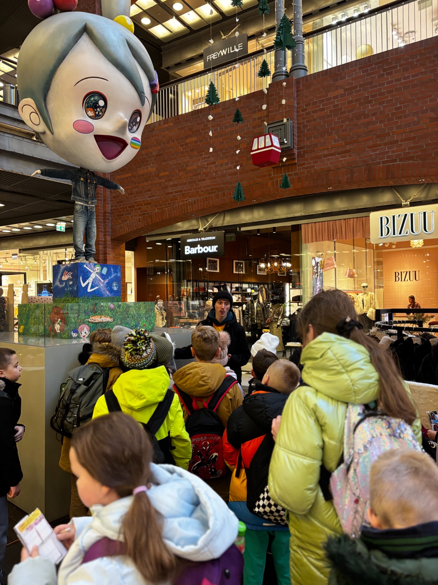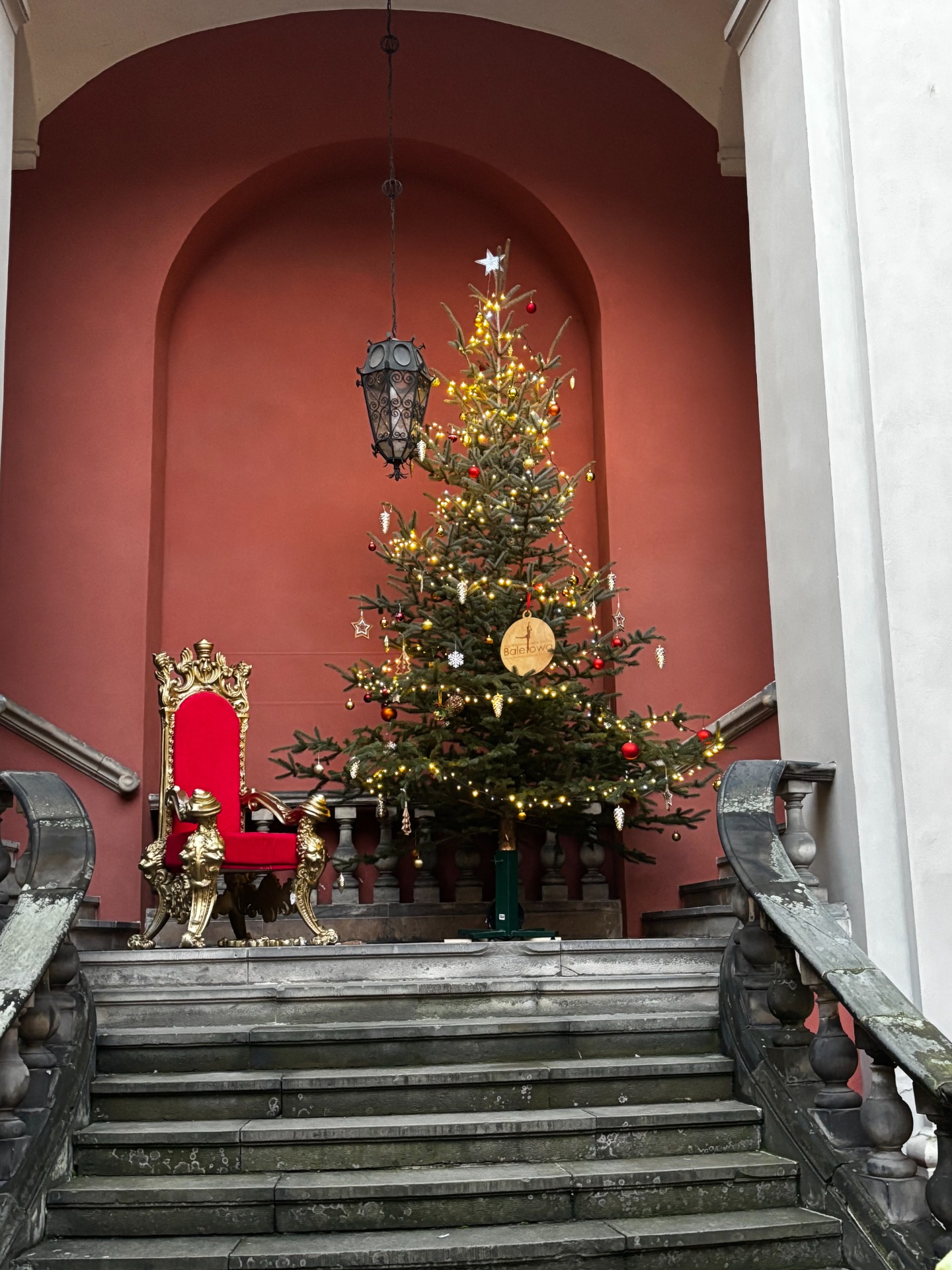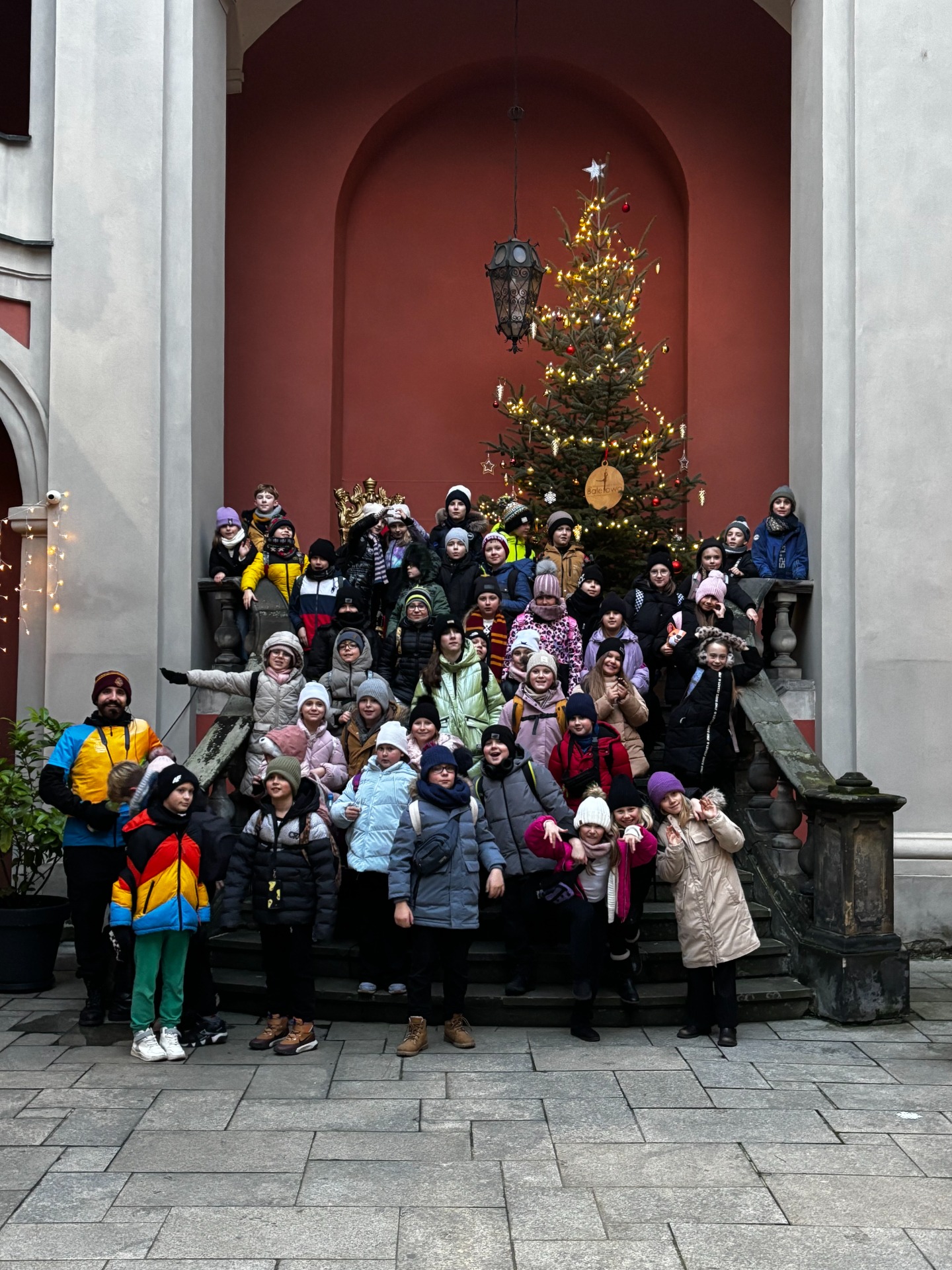 Aby odzyskać kalorie spalone na tropieniu lwów, uczniowie skusili się na ciepłą czekoladę z jarmarku bożonarodzeniowego. Było słodko, lepko i absolutnie cudownie. Wokół piękne światełka, muzyka świąteczna i piękna choinka przyozdobiona bombkami - niektóre wyglądały jak koziołki. W takiej atmosferze ratusz, pręgierz i okno, którego nie ma, prezentowały się przepięknie.
