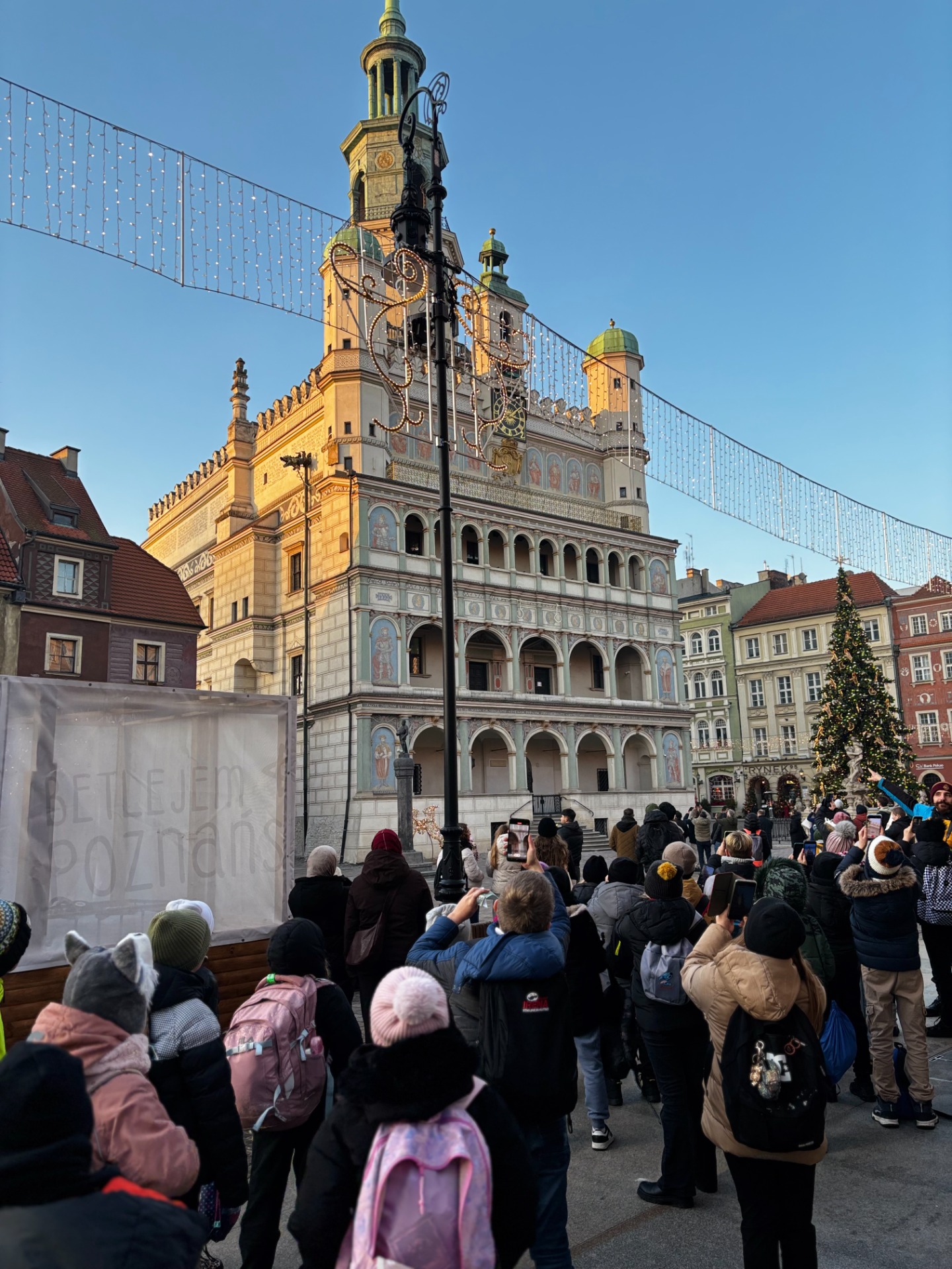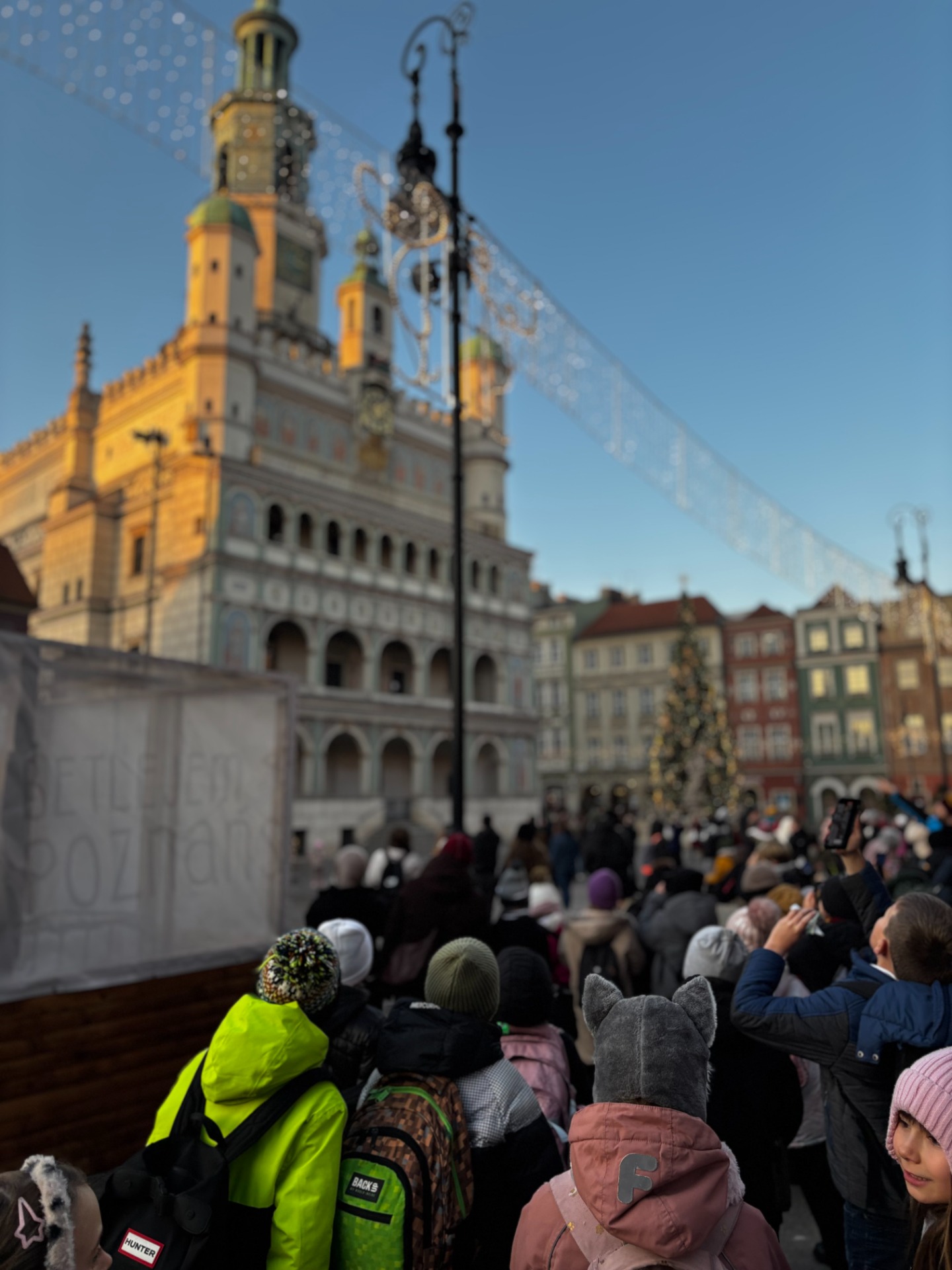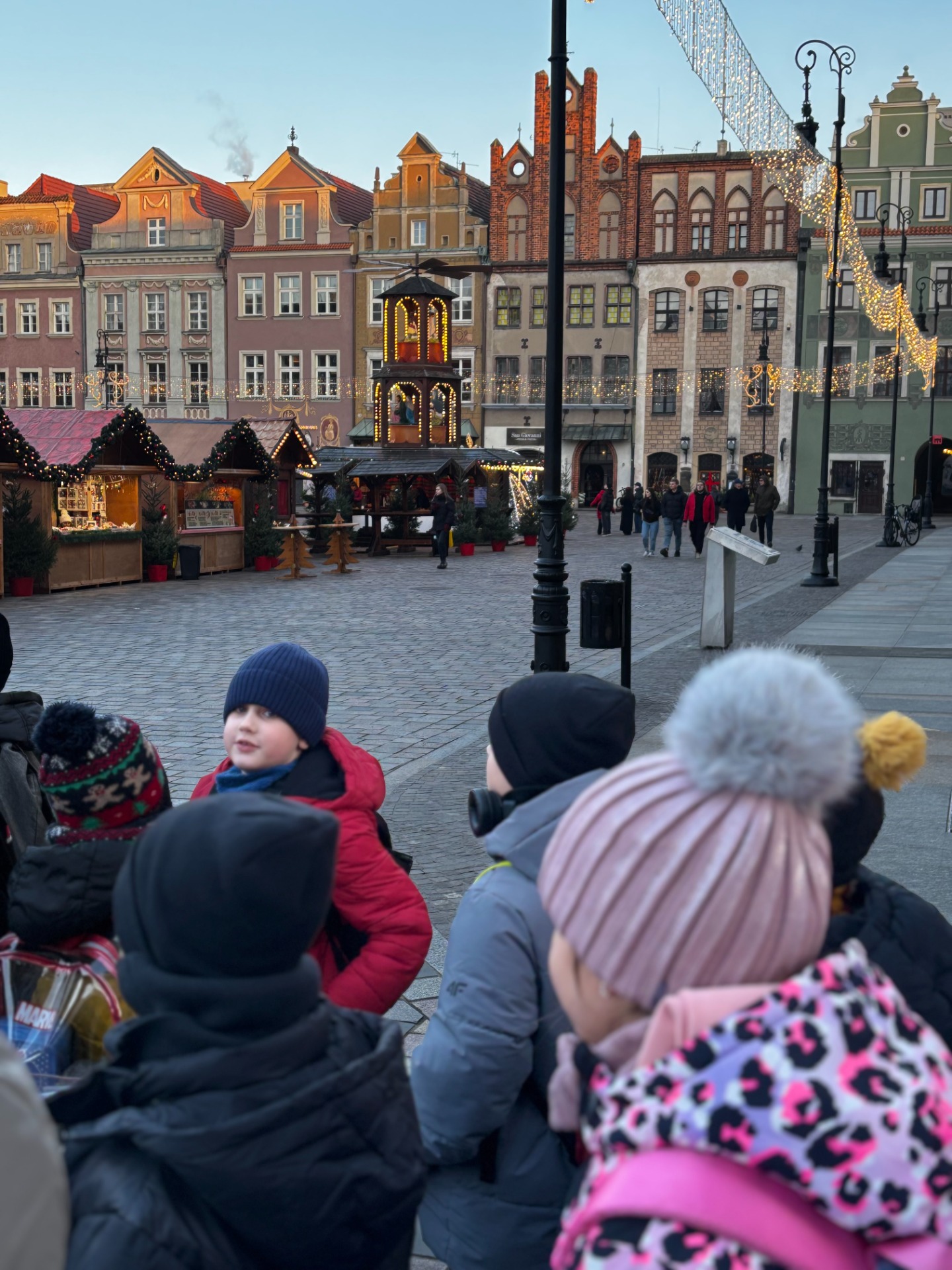 Na Starym Rynku czekały na nich kolejne atrakcje. Lodowisko obejrzeli z bezpiecznego dystansu (nikt nie planował gipsu przed świętami), a potem tradycyjnie „pobili się wzrokiem” z poznańskimi koziołkami.