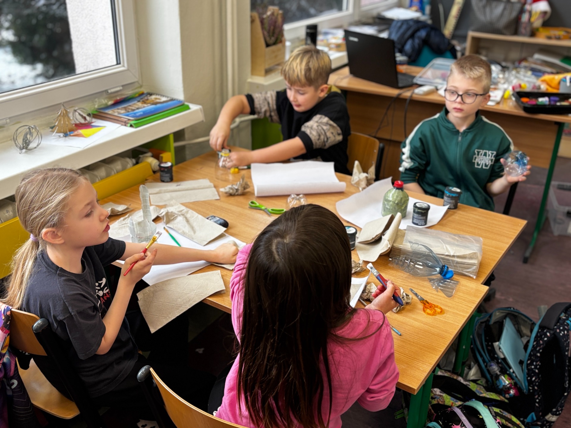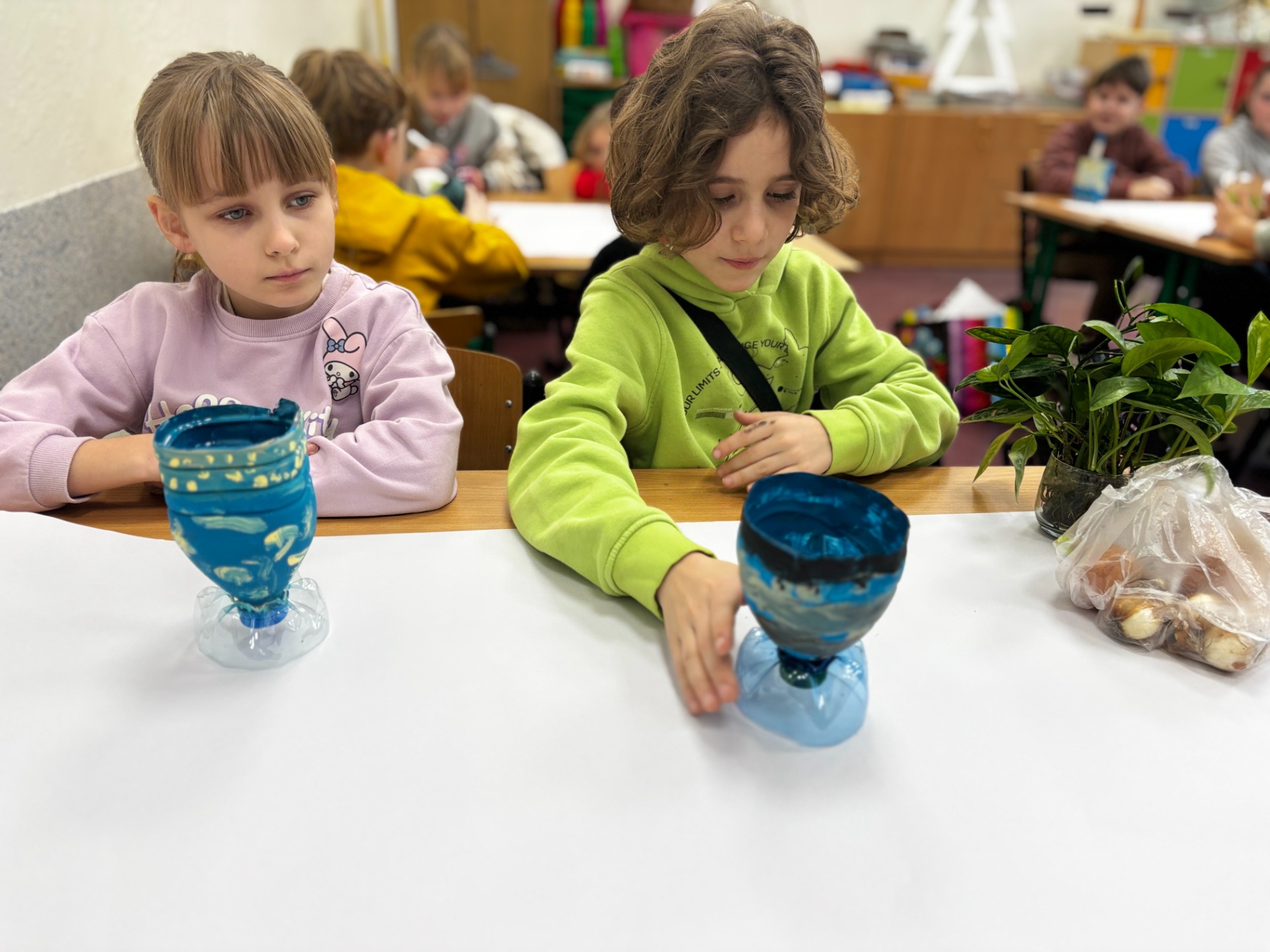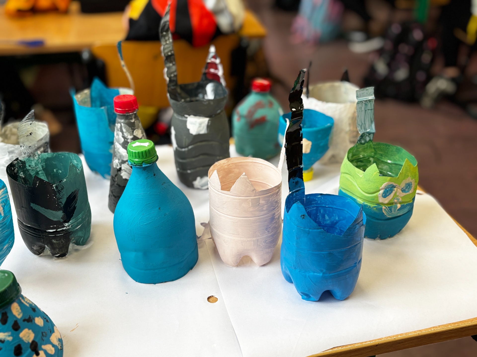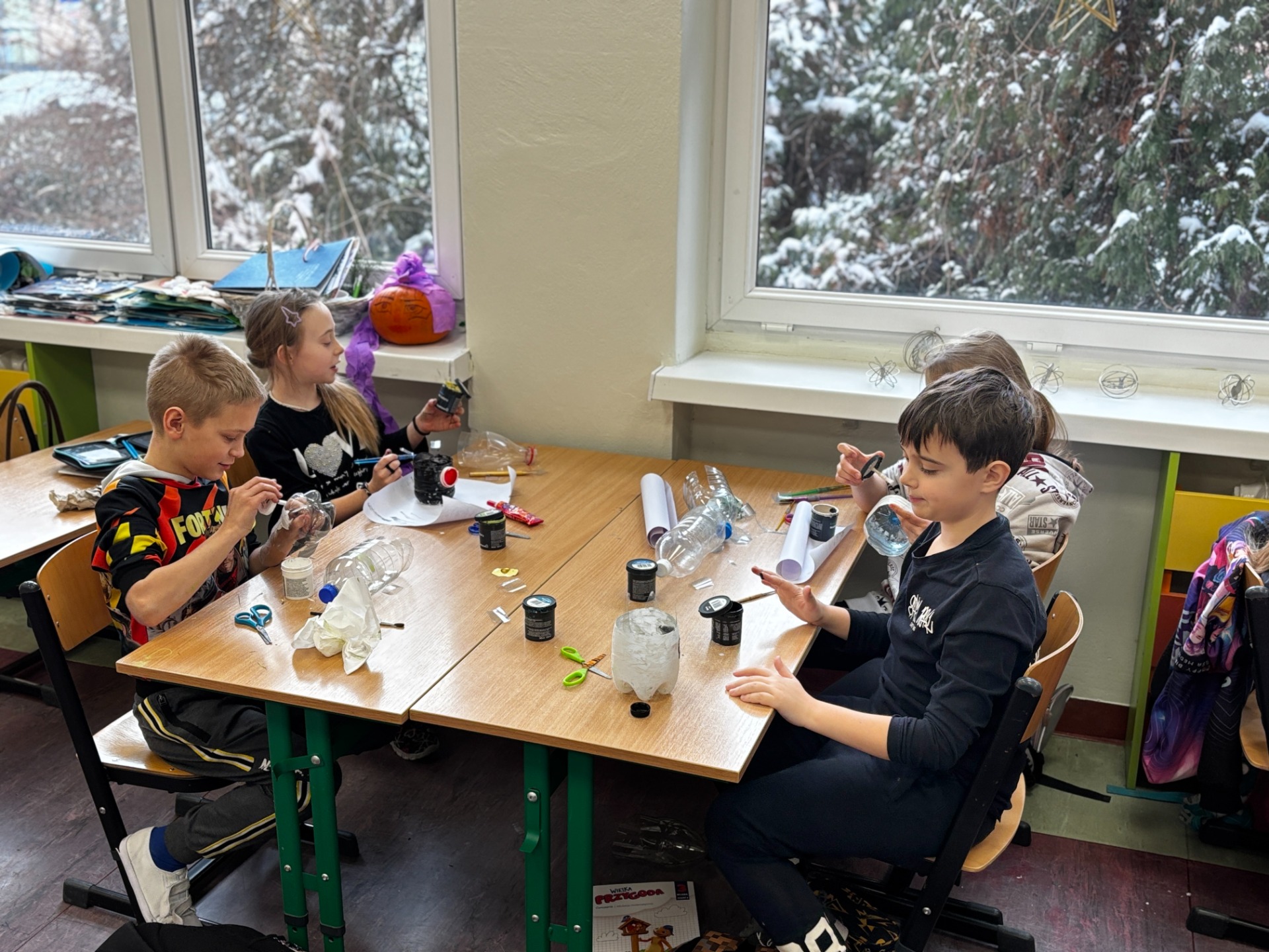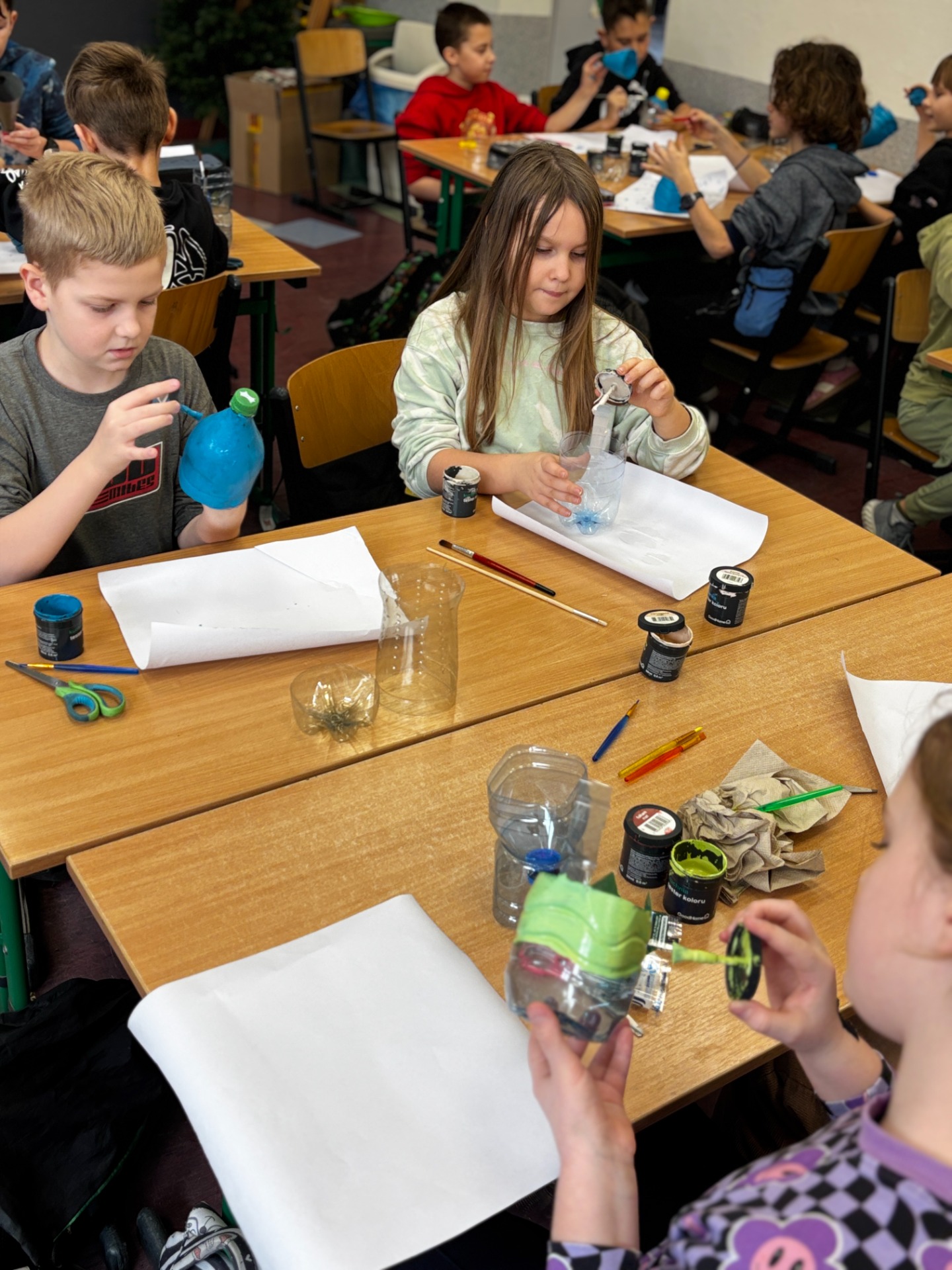 Zanim do akcji wkroczyła ziemia i rośliny, uczniowie zamienili się w projektantów dekoracji recyklingowych. Zgodnie z zasadą „mniej odpadów”, plastikowe butelki dostały drugie życie. Po kilku cięciach i ruchach pędzla, na parapetach zamieszkały: urocze kotki i pieski, barwne stworki, a nawet apetyczne doniczki-lodowe wafelki.