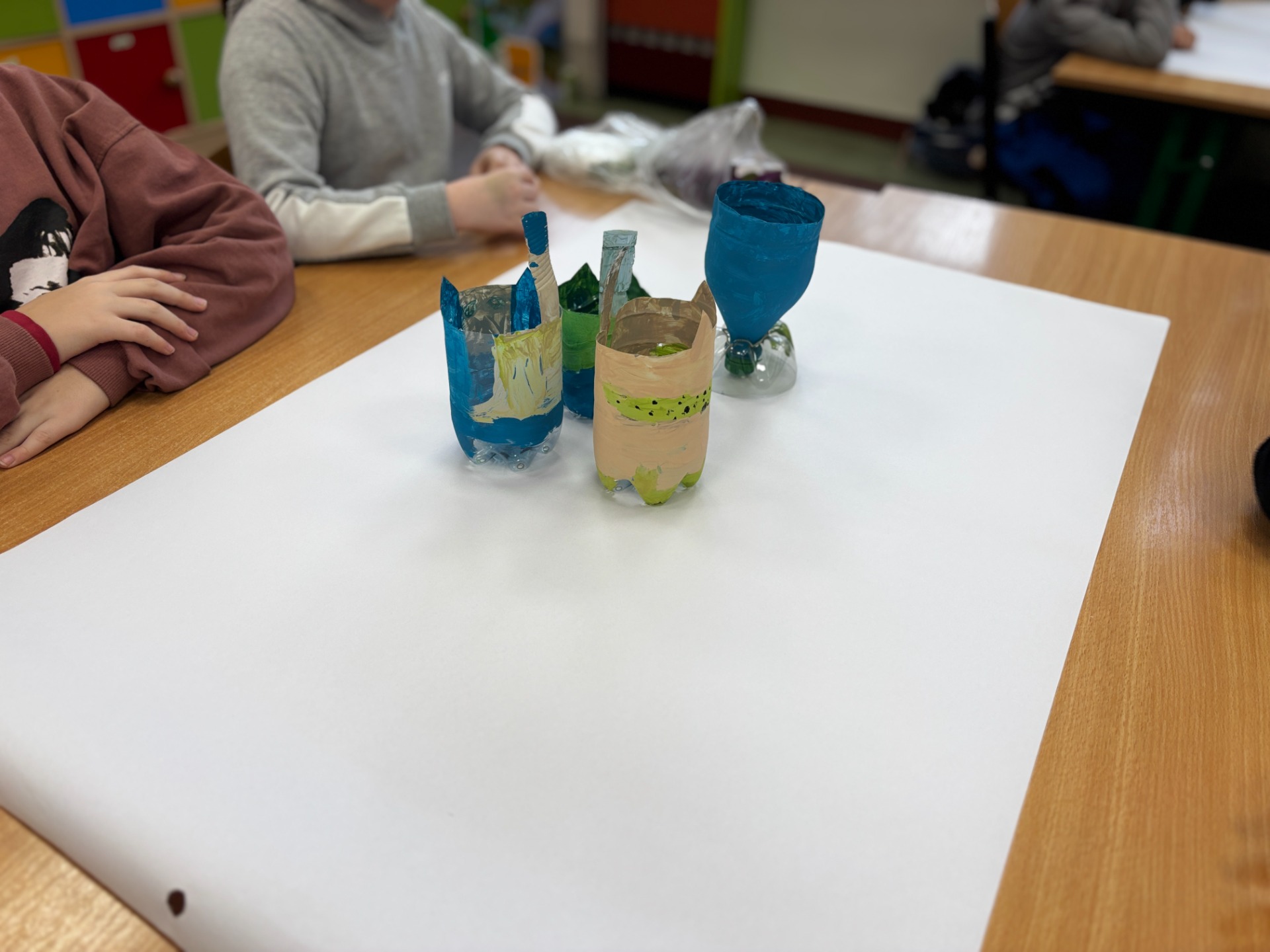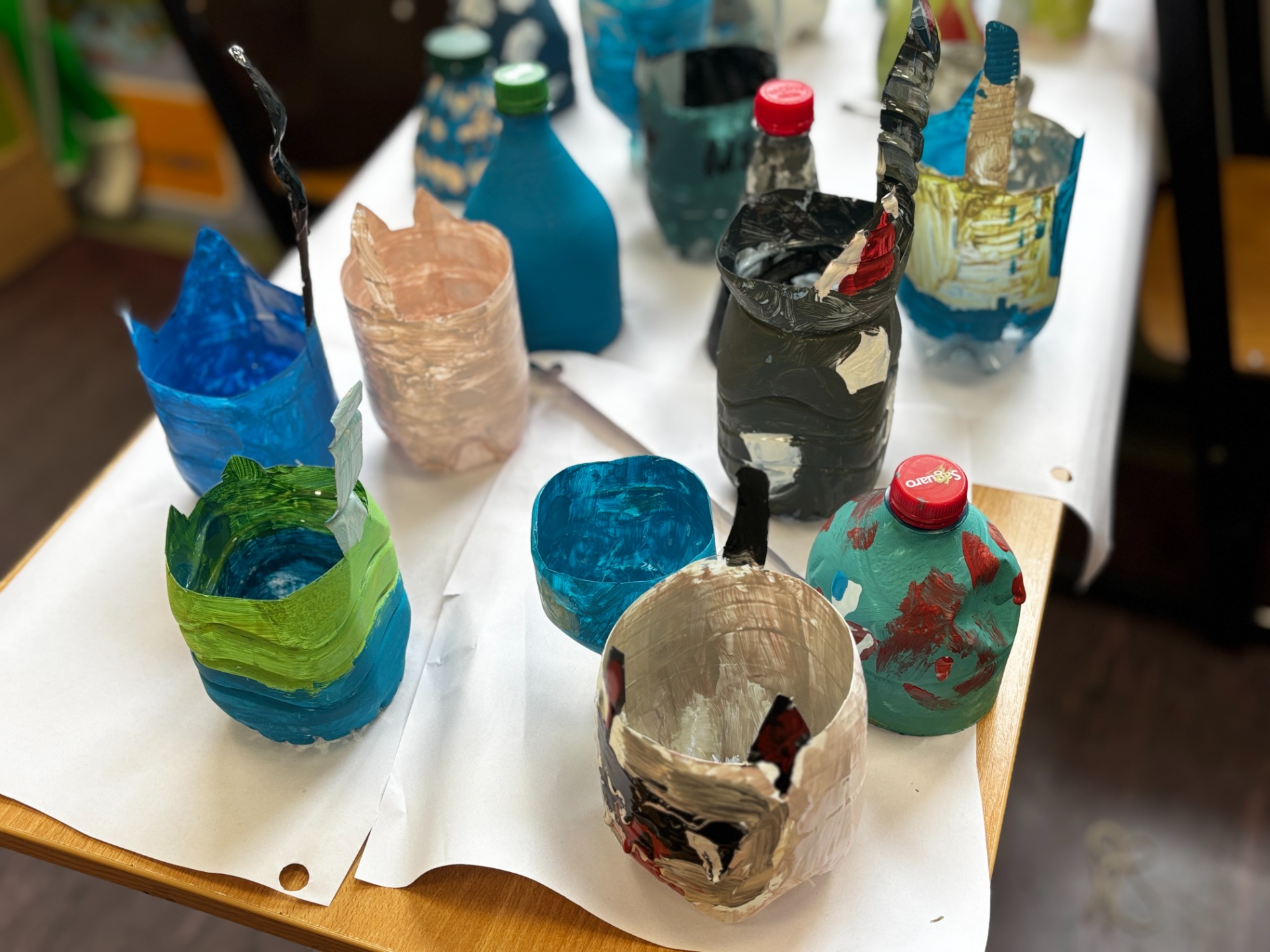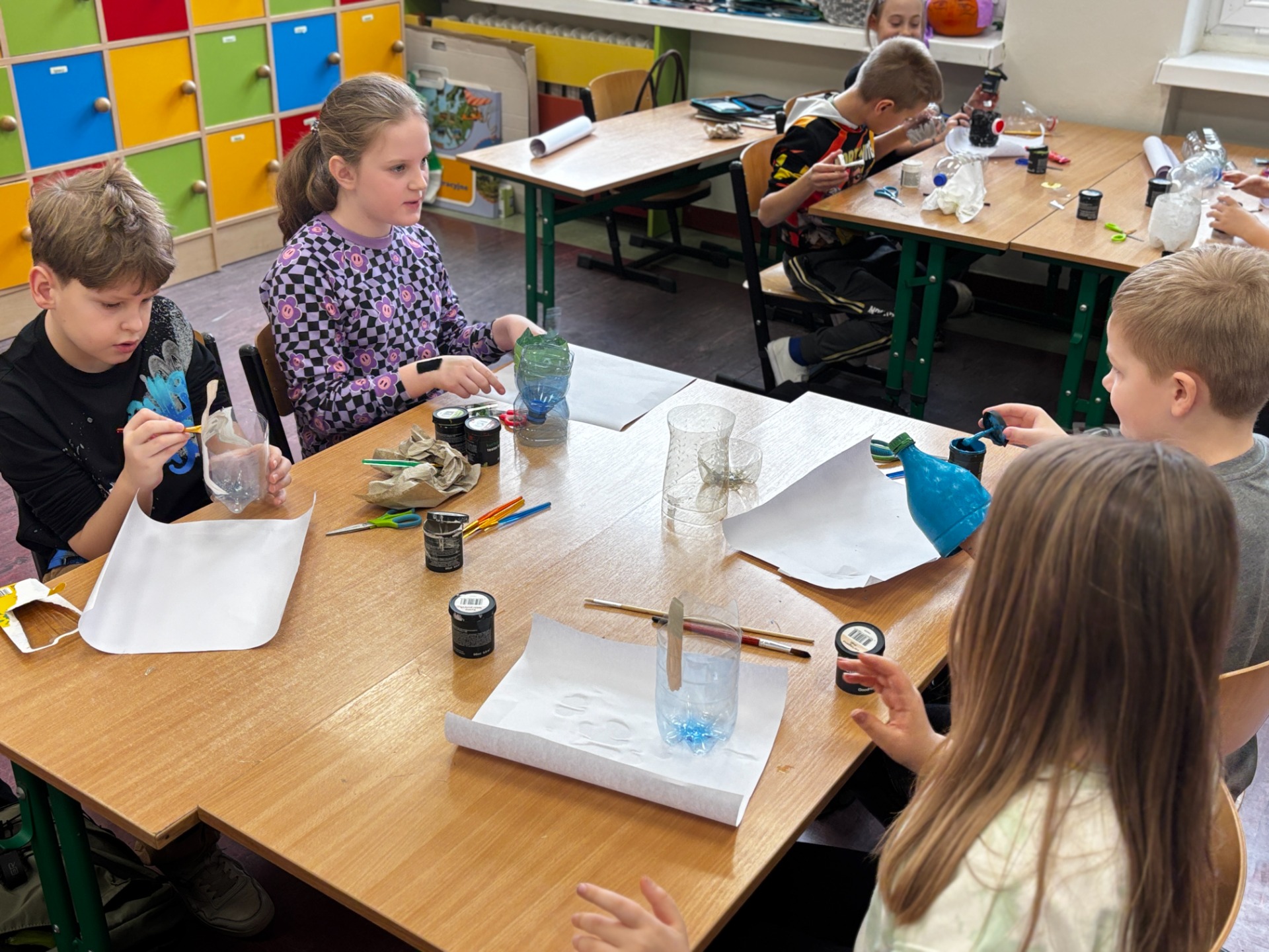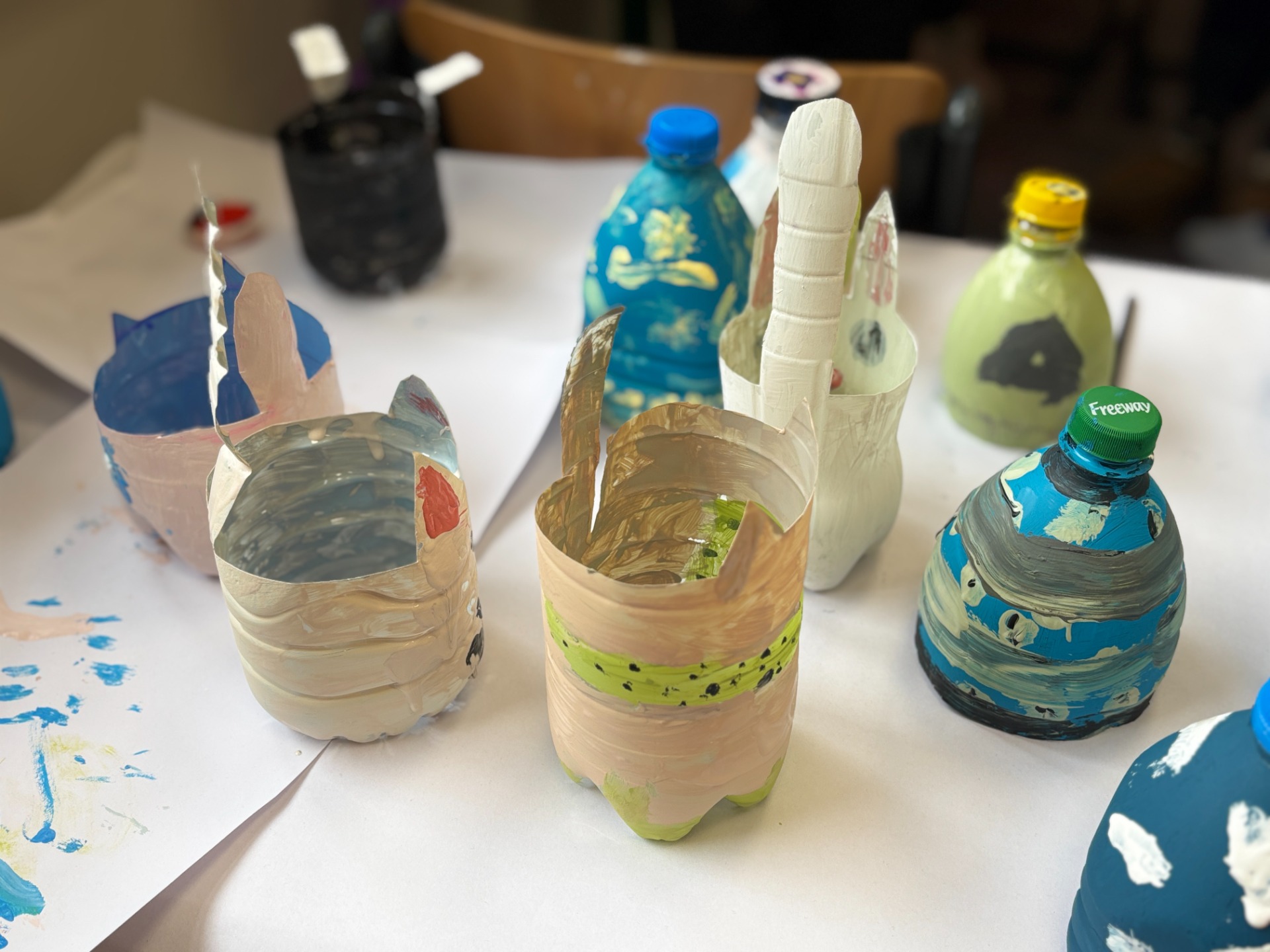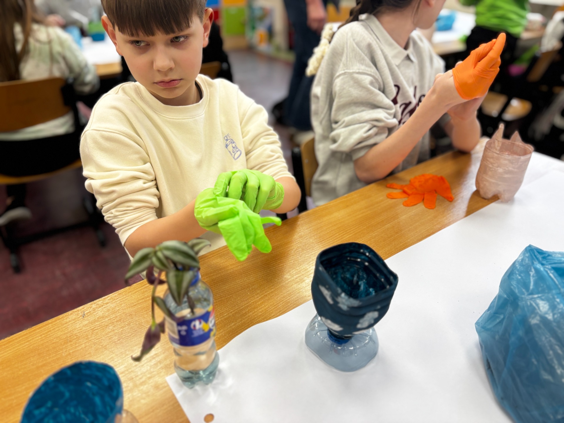 Zanim do akcji wkroczyła ziemia i rośliny, uczniowie zamienili się w projektantów dekoracji recyklingowych. Zgodnie z zasadą „mniej odpadów”, plastikowe butelki dostały drugie życie. Po kilku cięciach i ruchach pędzla, na parapetach zamieszkały: urocze kotki i pieski, barwne stworki, a nawet apetyczne doniczki-lodowe wafelki.