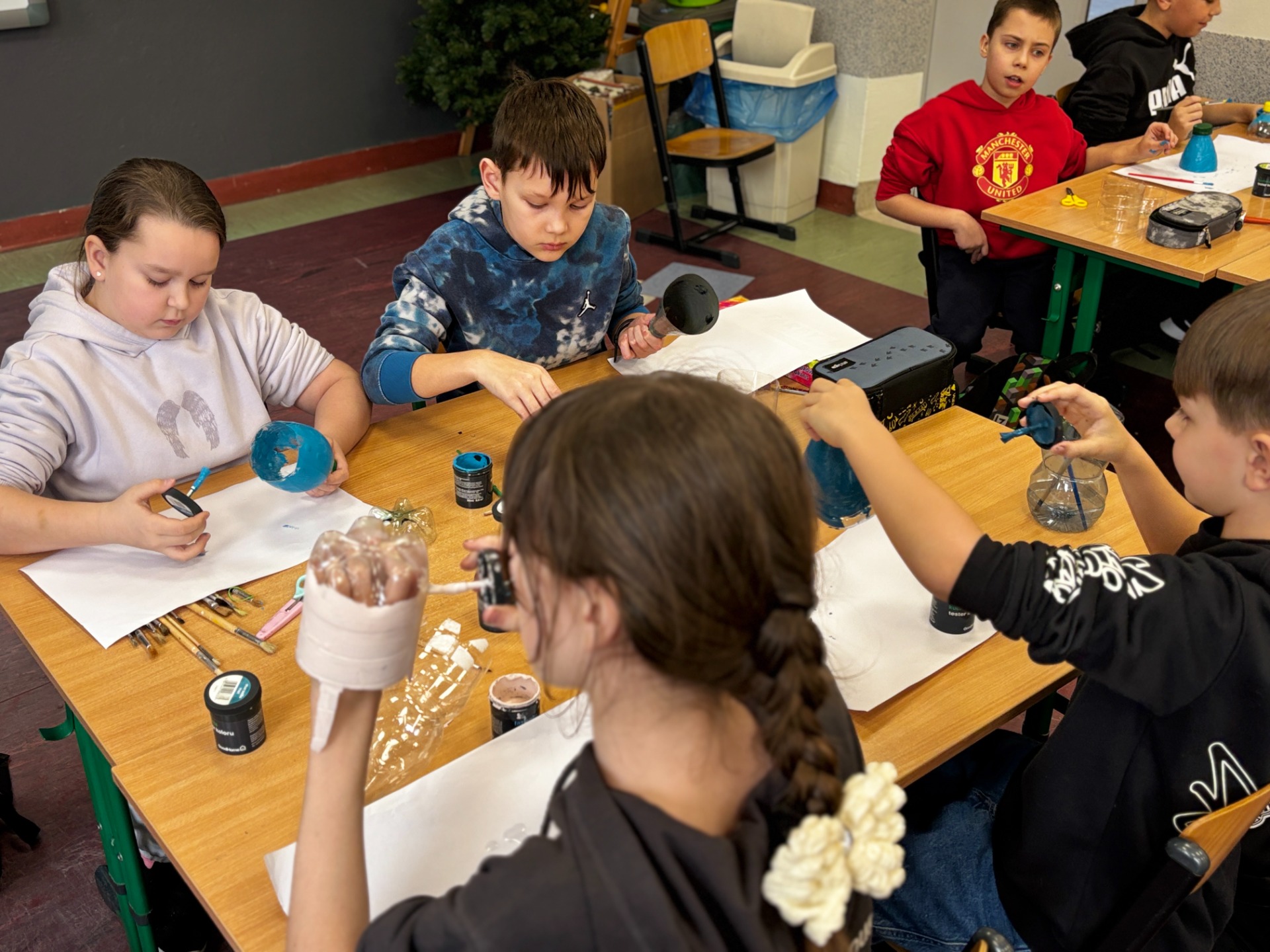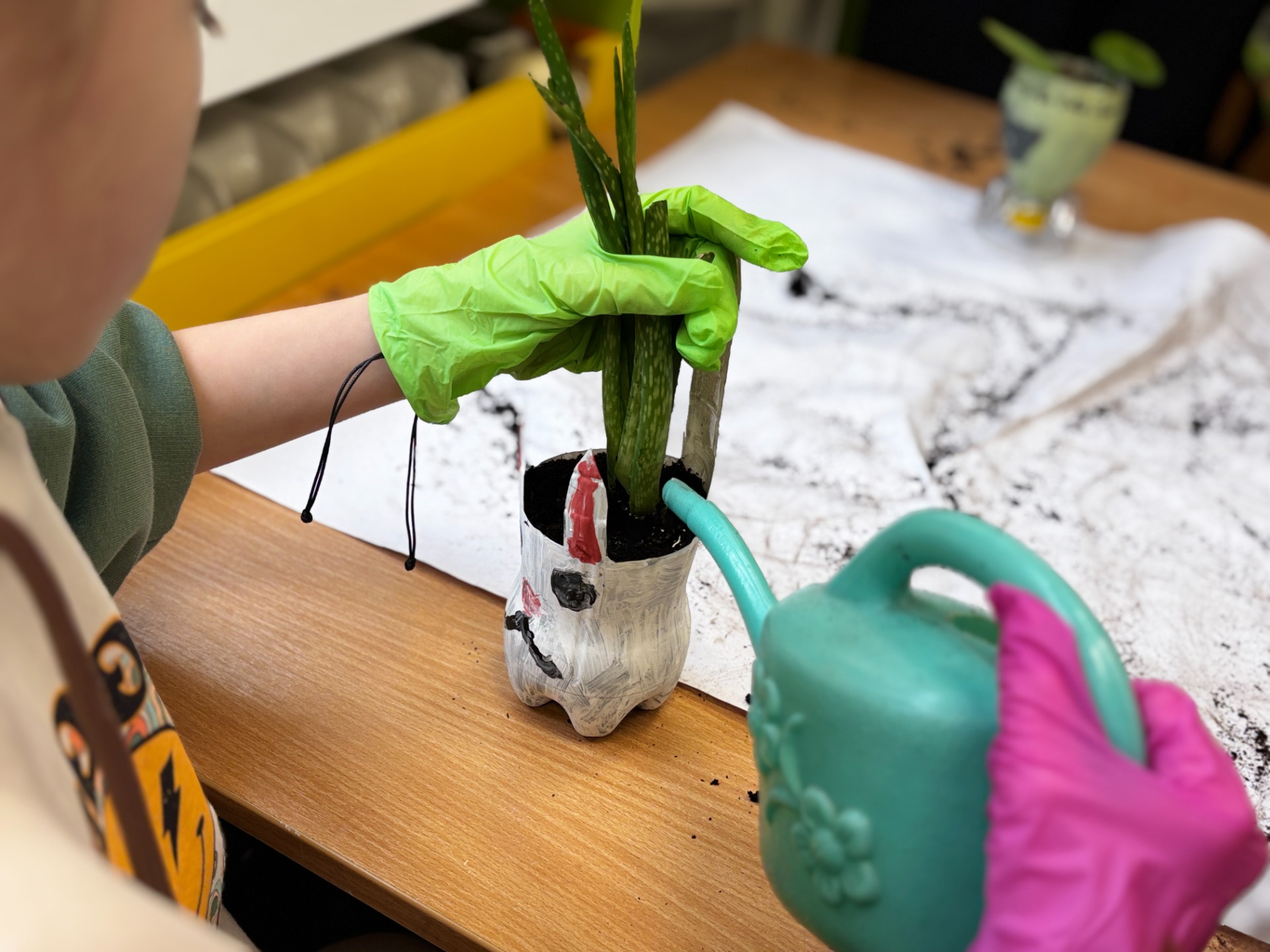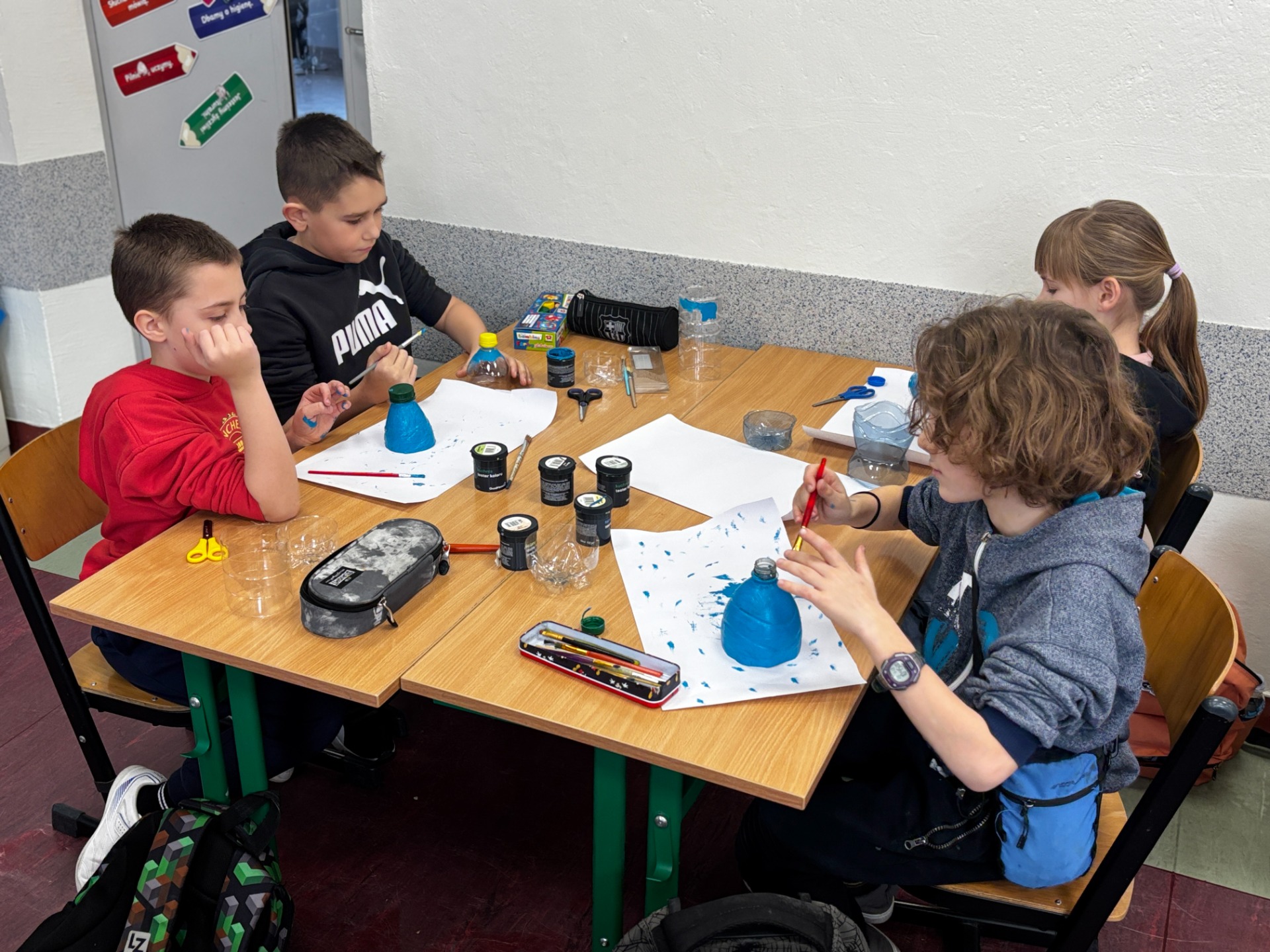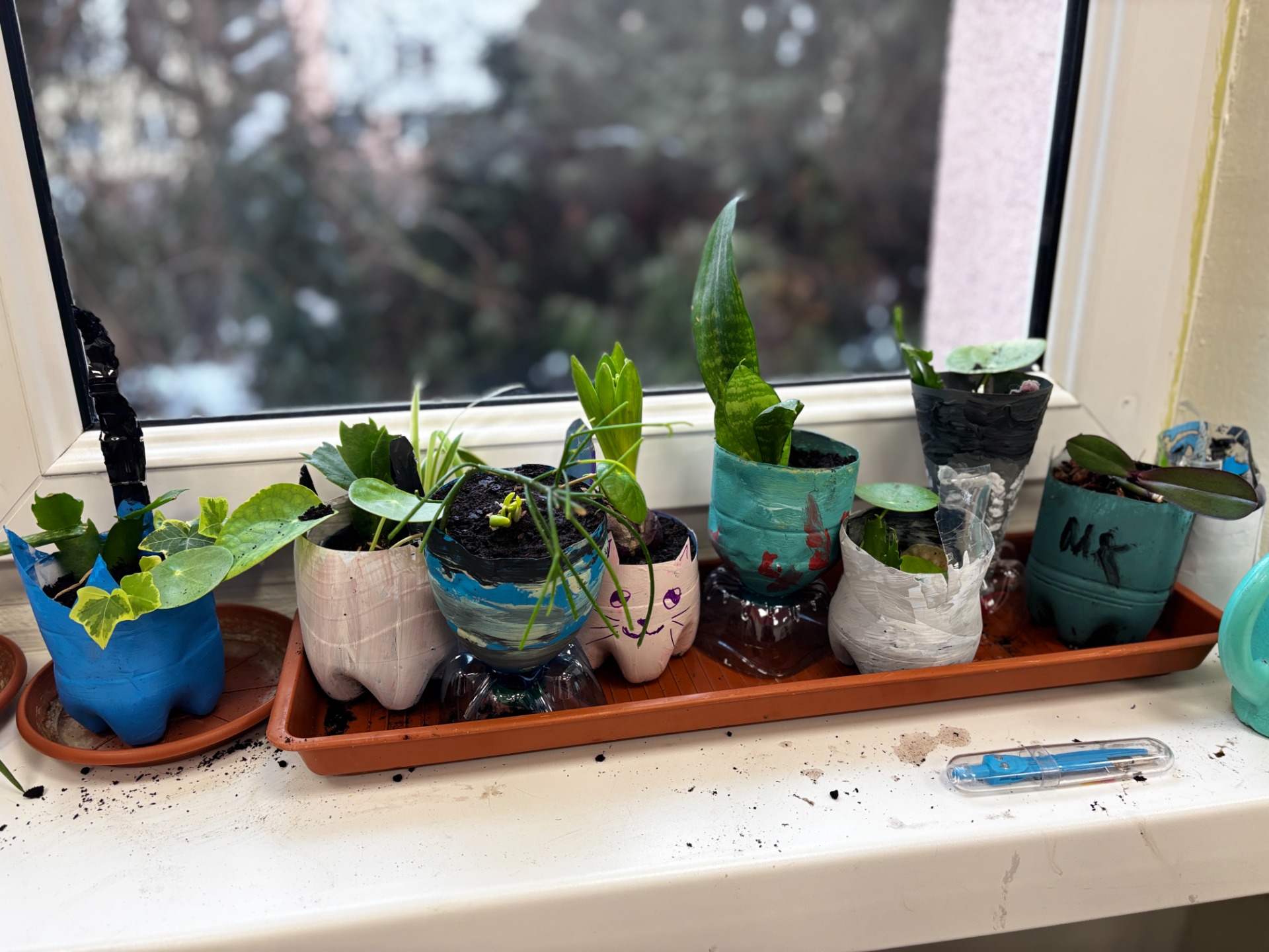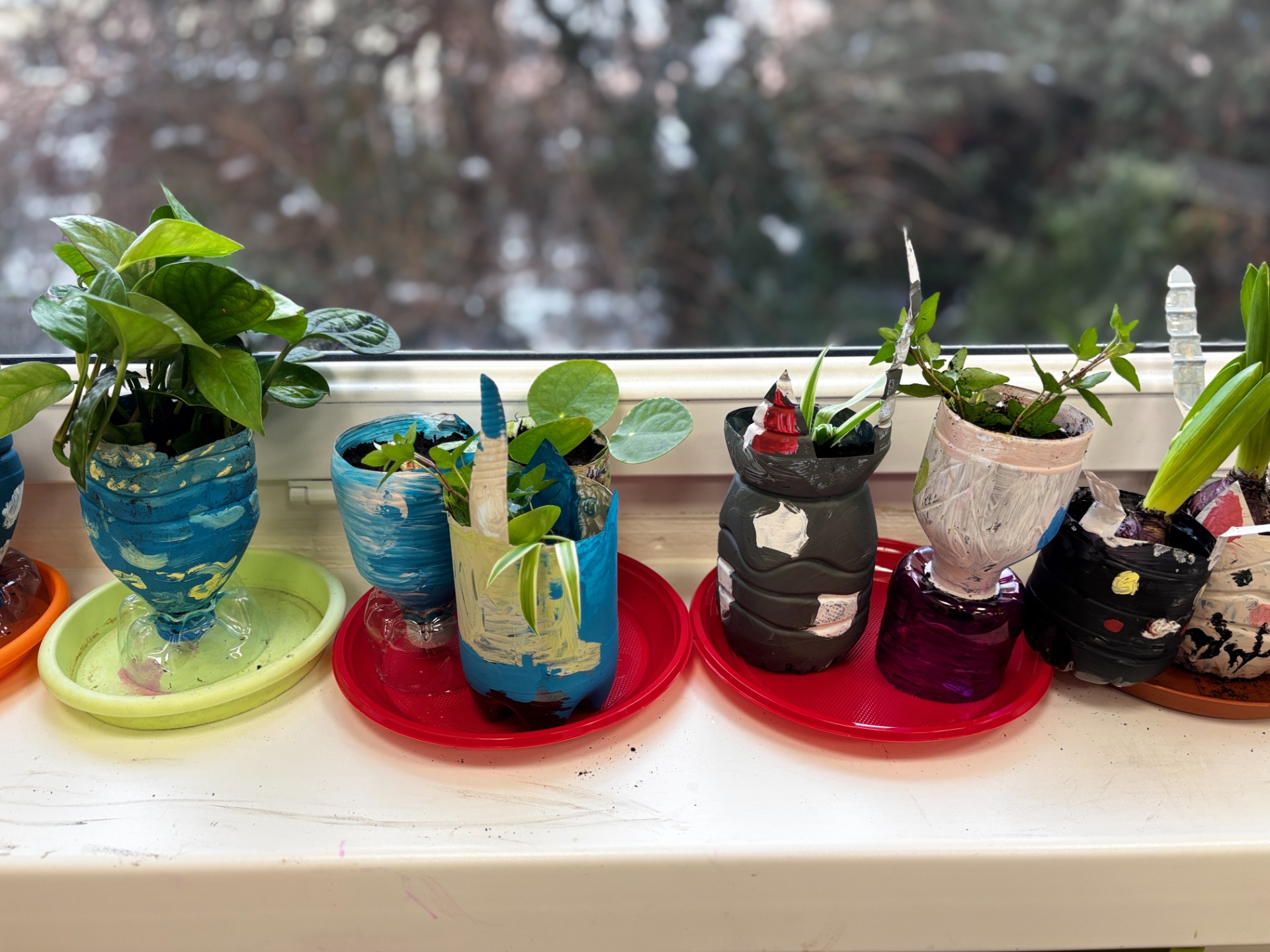 Zanim do akcji wkroczyła ziemia i rośliny, uczniowie zamienili się w projektantów dekoracji recyklingowych. Zgodnie z zasadą „mniej odpadów”, plastikowe butelki dostały drugie życie. Po kilku cięciach i ruchach pędzla, na parapetach zamieszkały: urocze kotki i pieski, barwne stworki, a nawet apetyczne doniczki-lodowe wafelki.