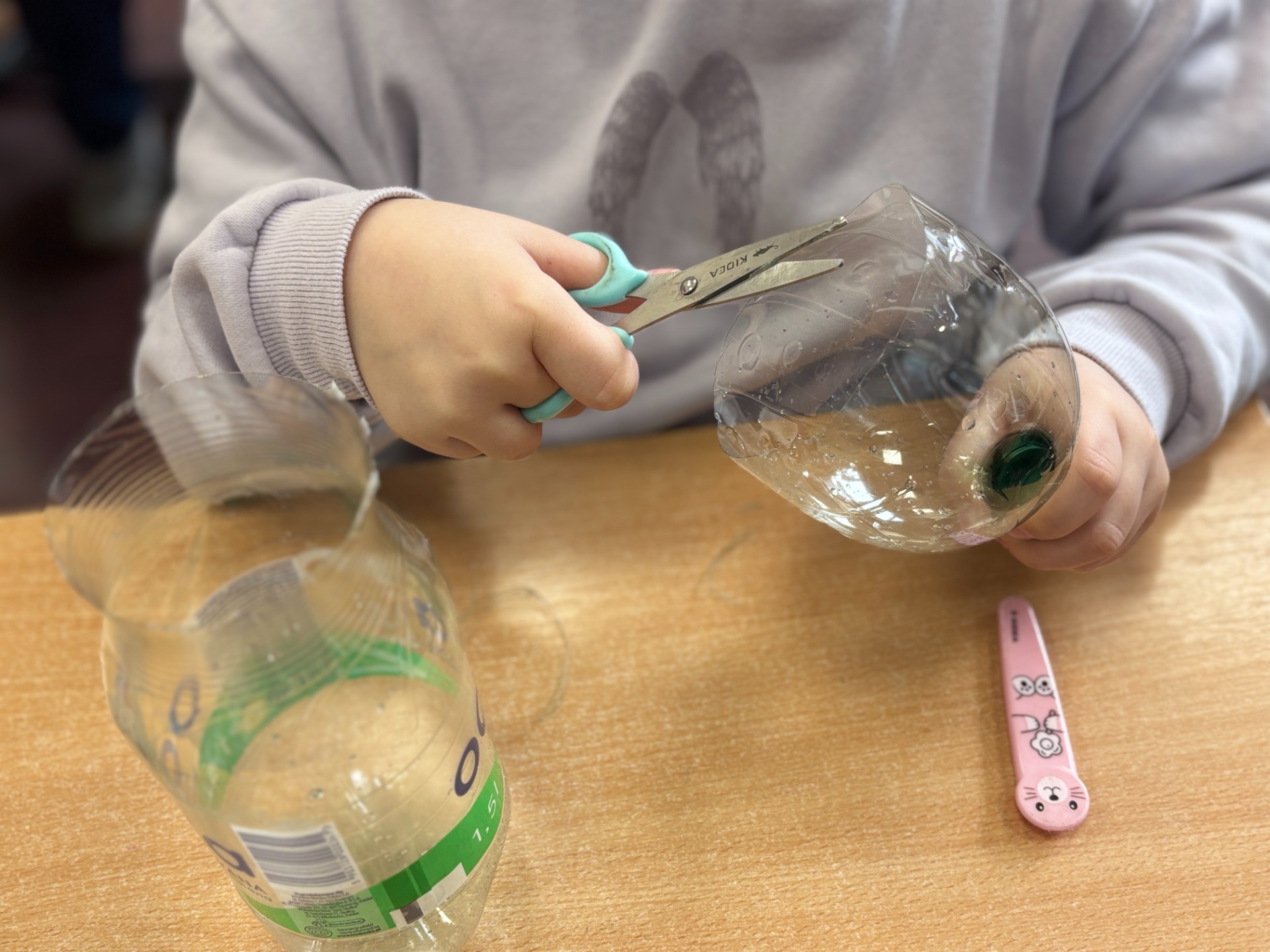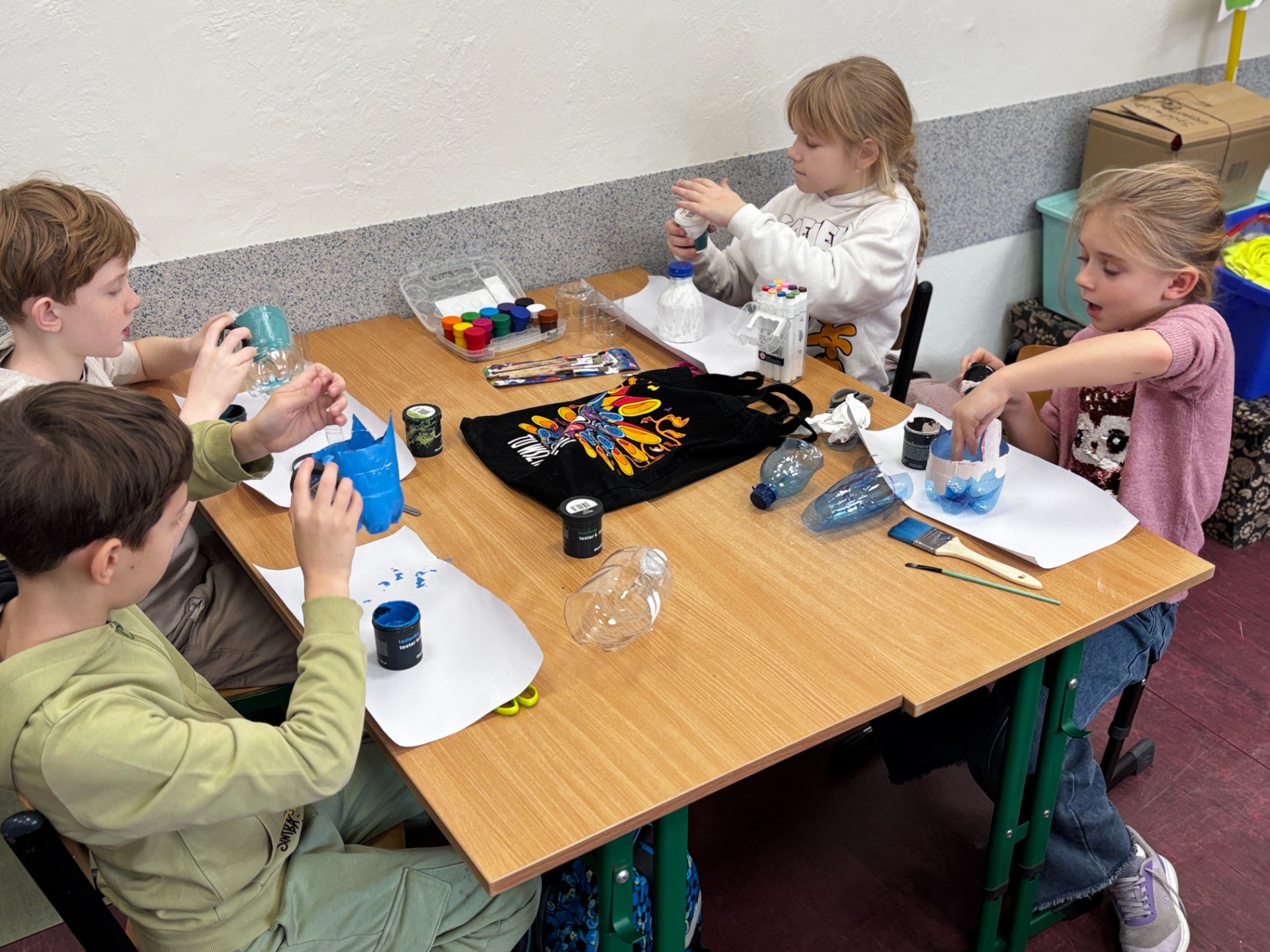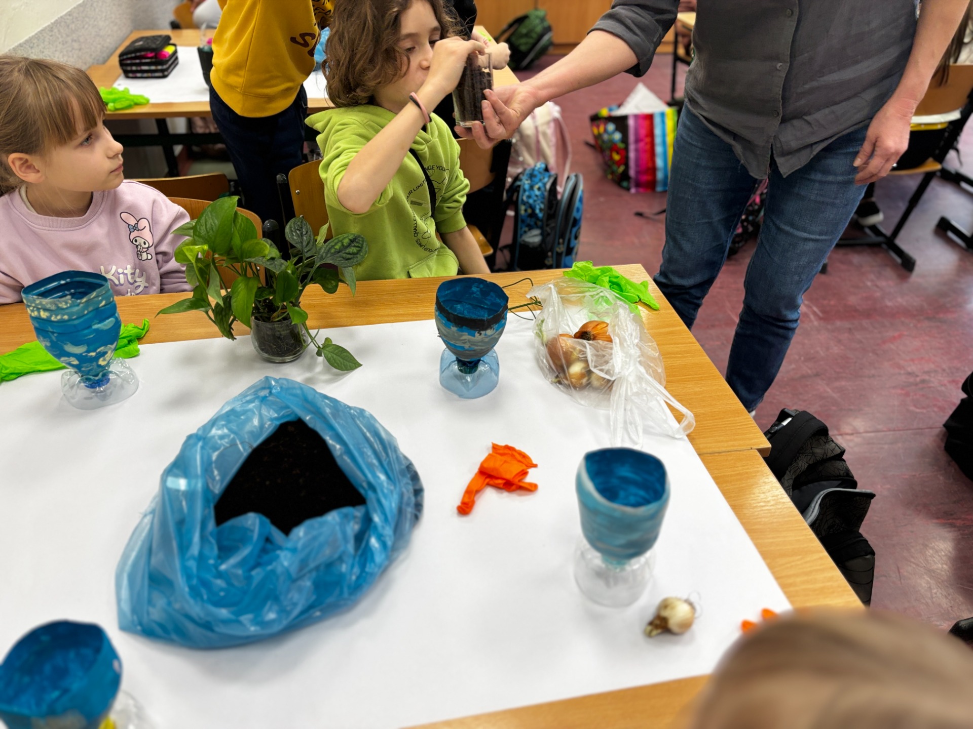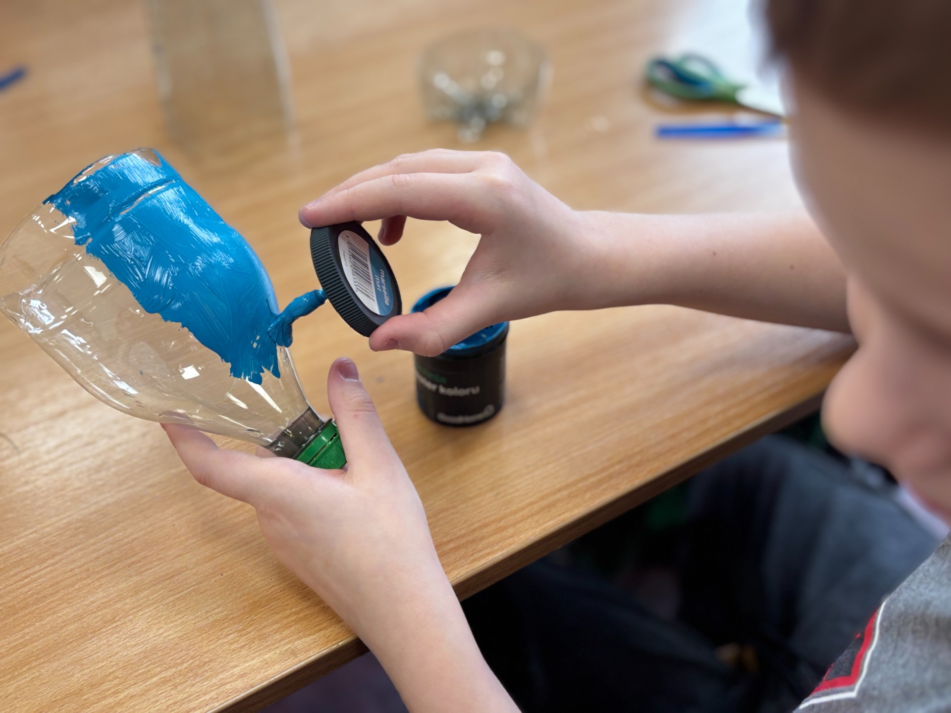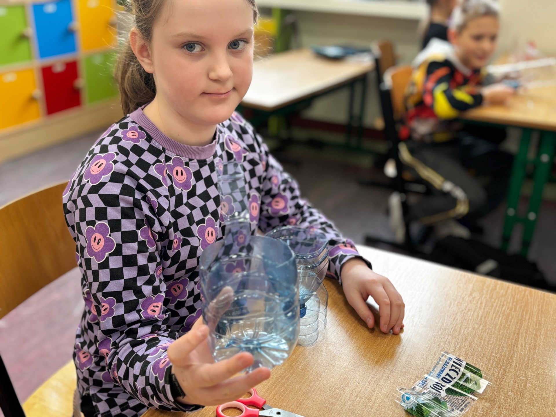 Zanim do akcji wkroczyła ziemia i rośliny, uczniowie zamienili się w projektantów dekoracji recyklingowych. Zgodnie z zasadą „mniej odpadów”, plastikowe butelki dostały drugie życie. Po kilku cięciach i ruchach pędzla, na parapetach zamieszkały: urocze kotki i pieski, barwne stworki, a nawet apetyczne doniczki-lodowe wafelki.