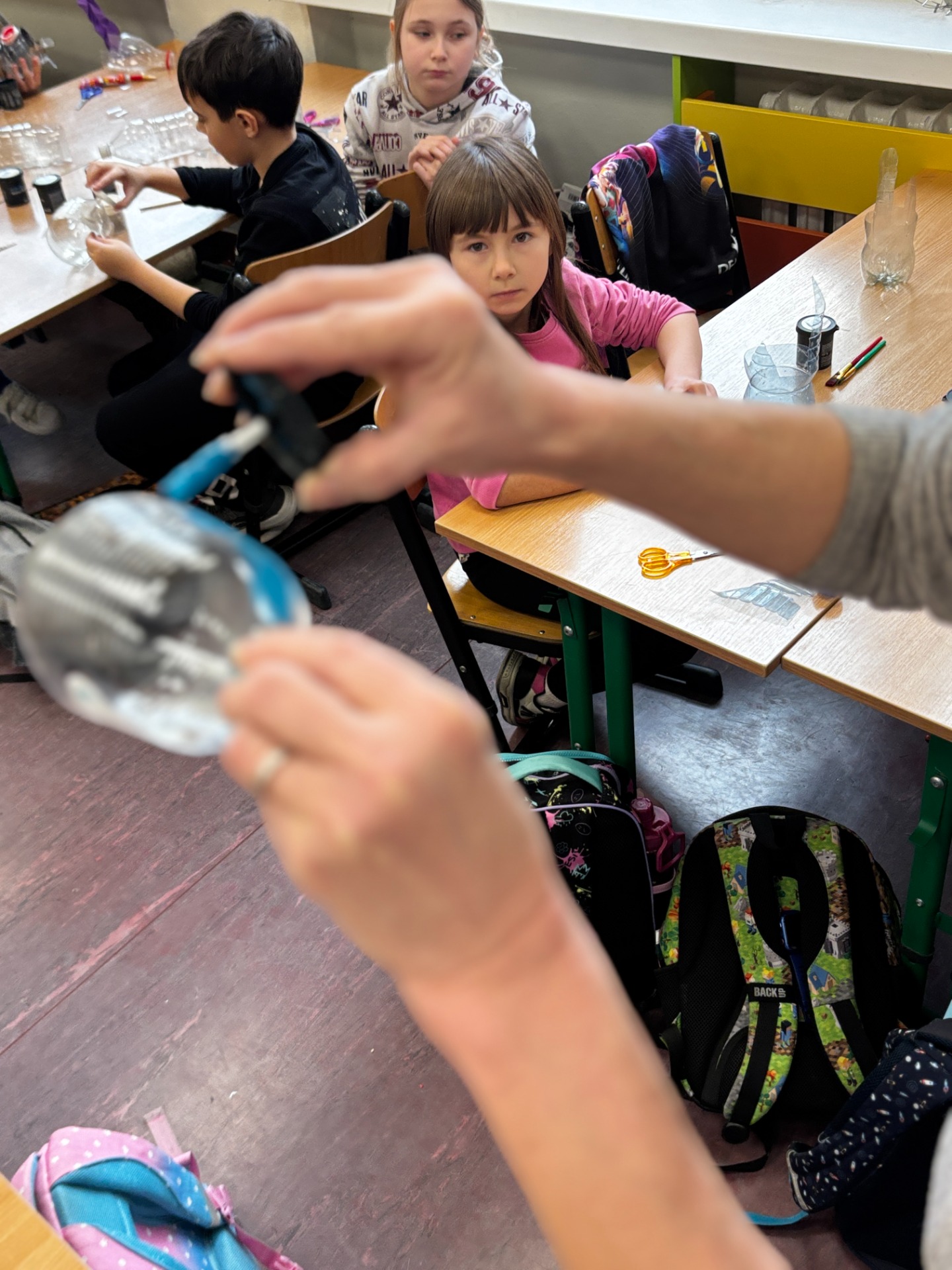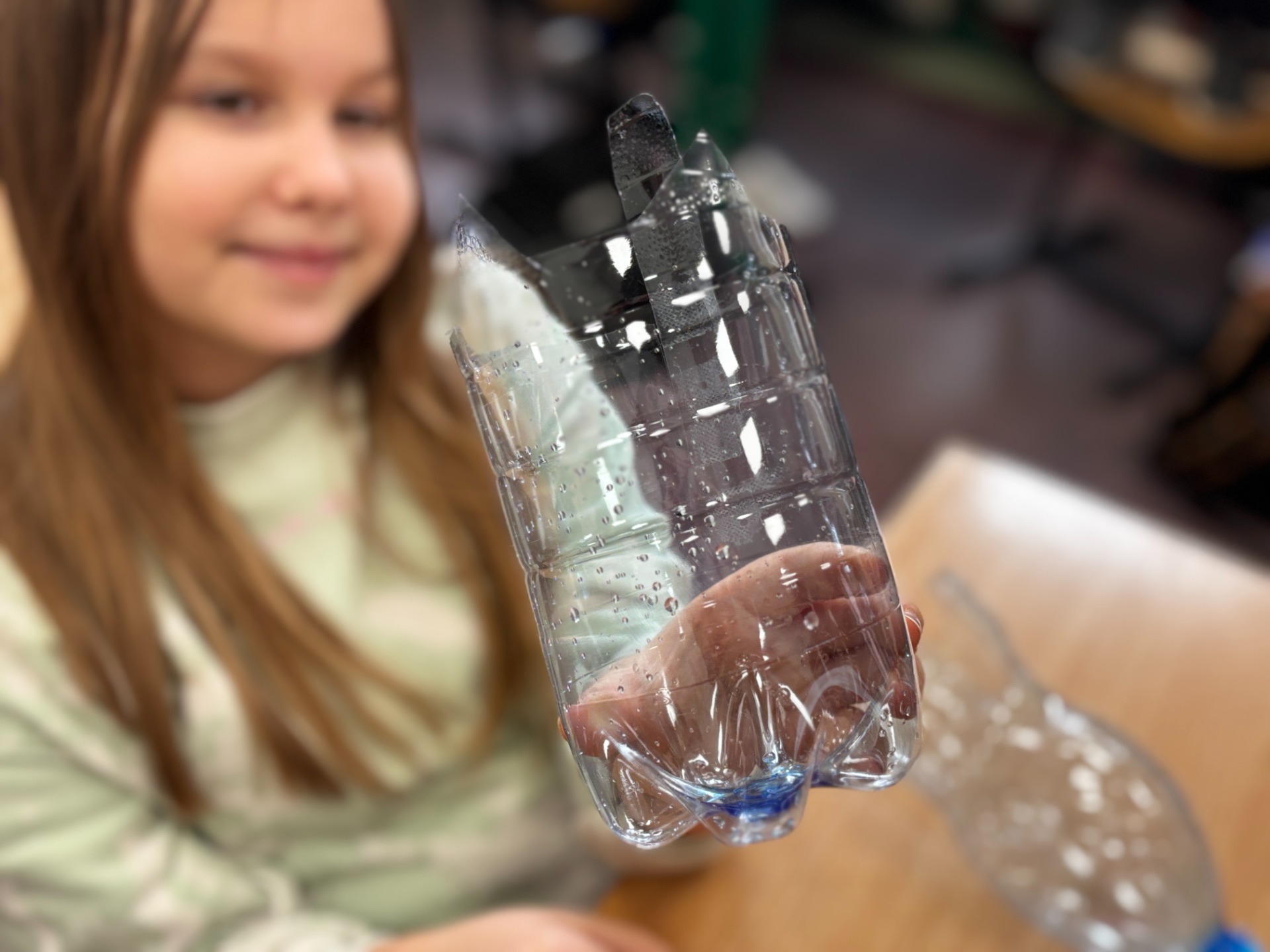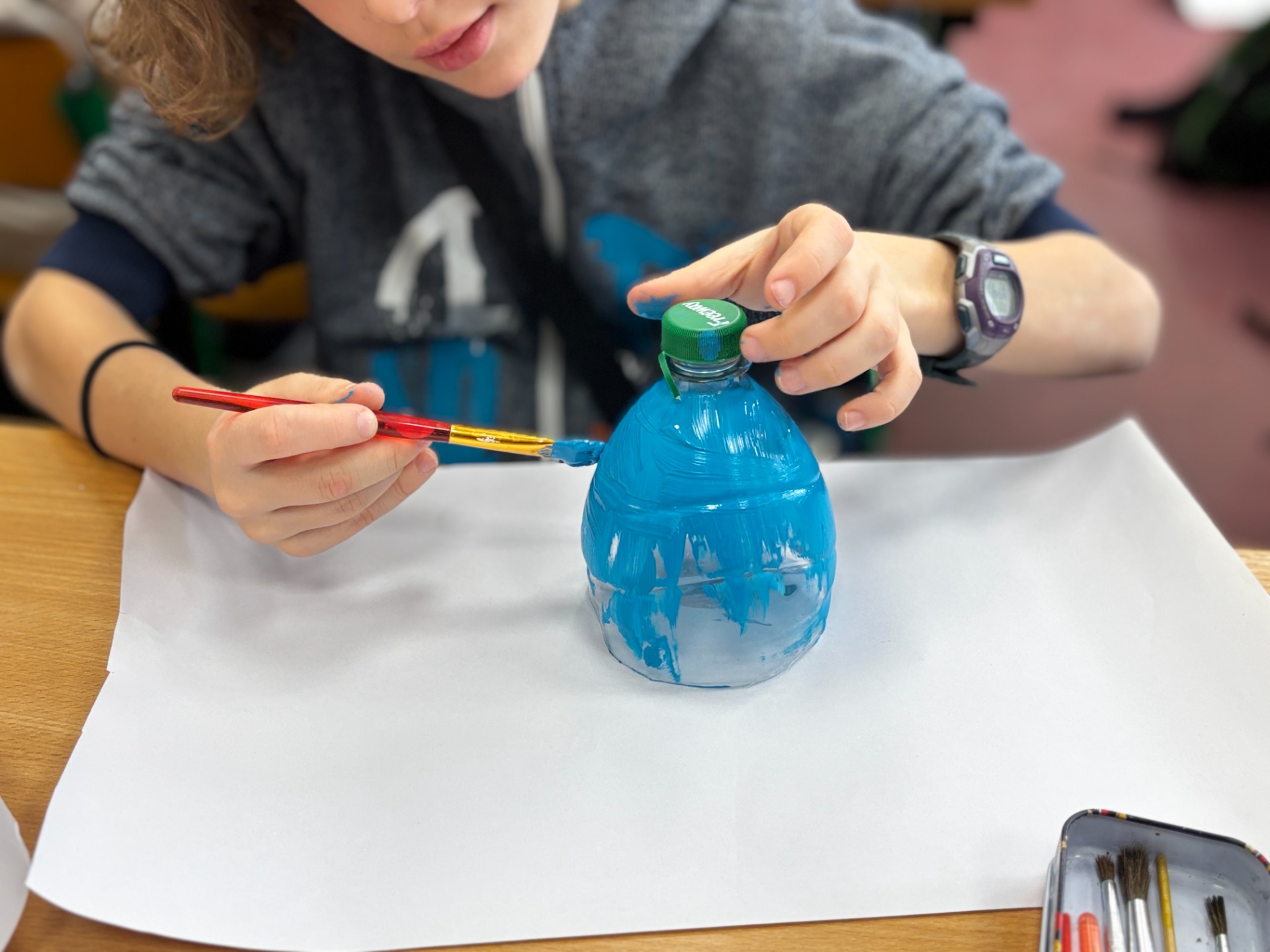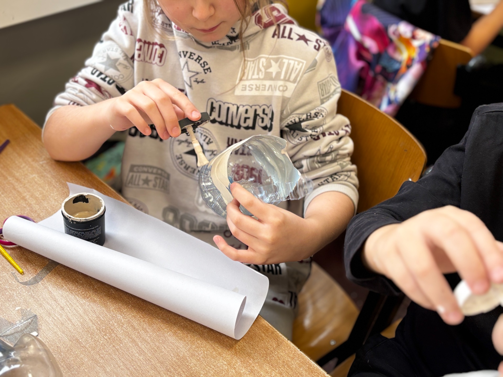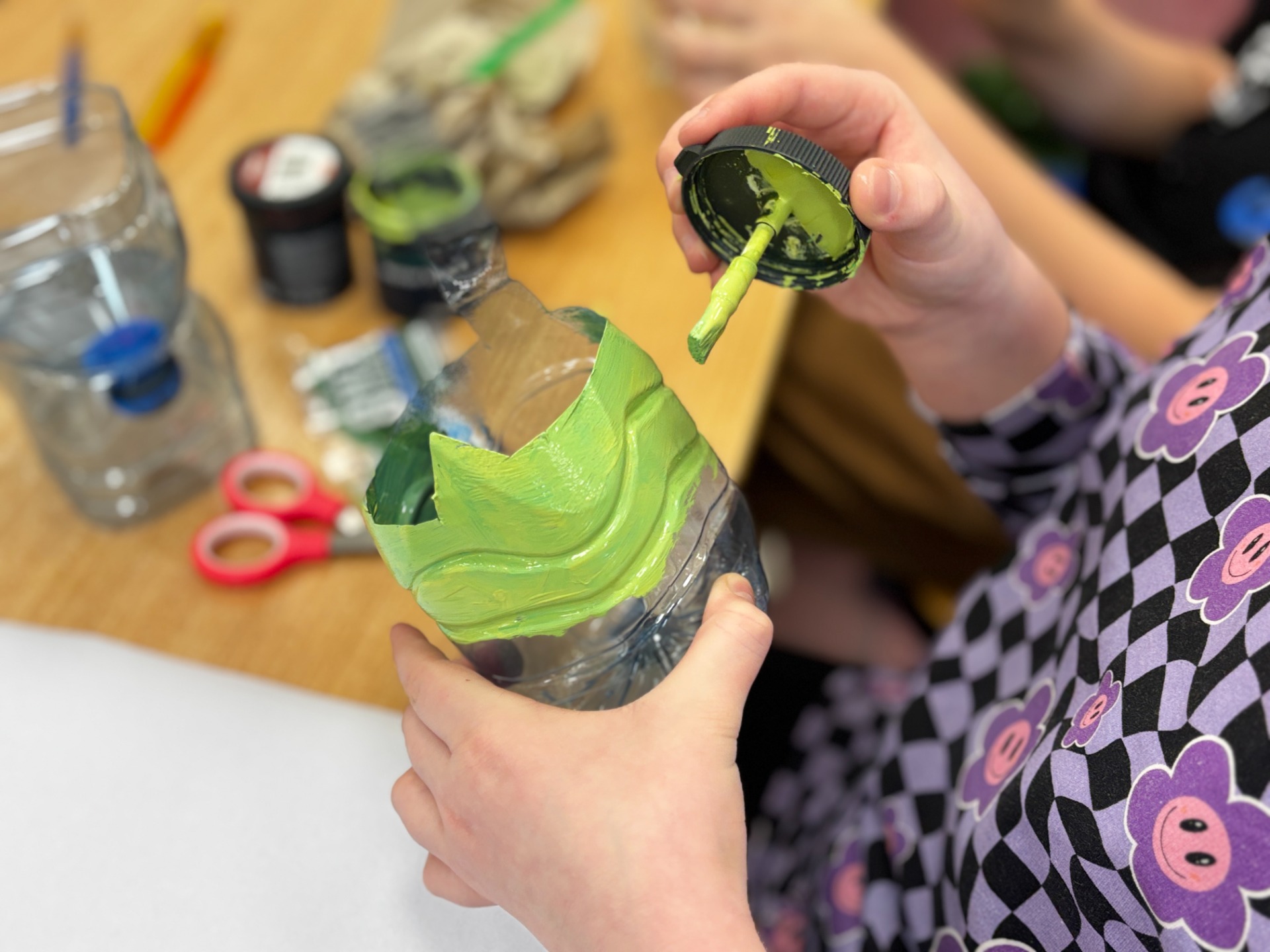Zanim do akcji wkroczyła ziemia i rośliny, uczniowie zamienili się w projektantów dekoracji recyklingowych. Zgodnie z zasadą „mniej odpadów”, plastikowe butelki dostały drugie życie. Po kilku cięciach i ruchach pędzla, na parapetach zamieszkały: urocze kotki i pieski, barwne stworki, a nawet apetyczne doniczki-lodowe wafelki.
