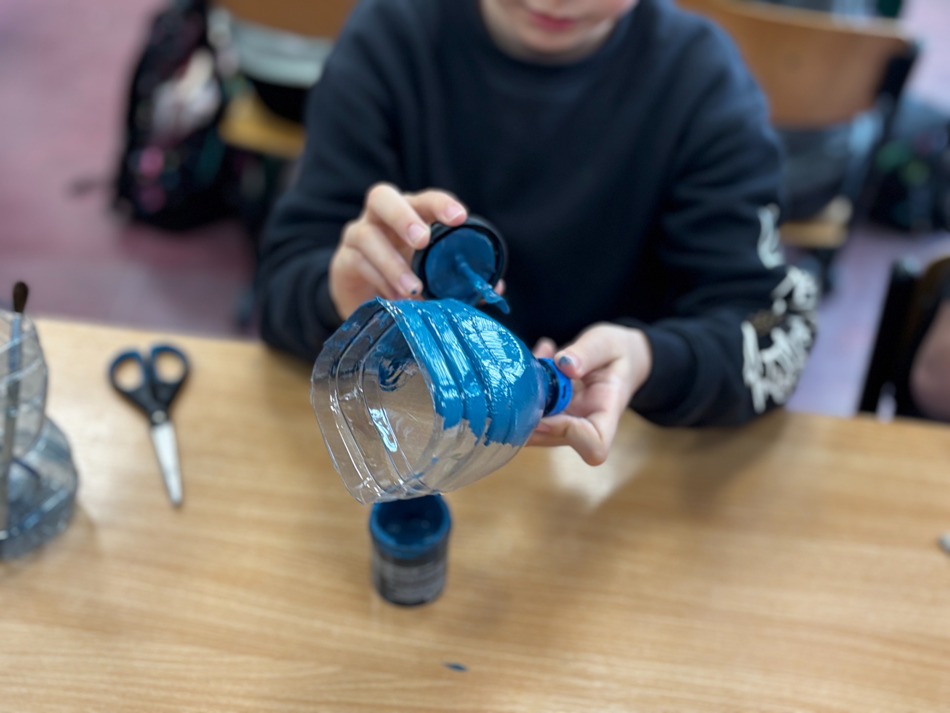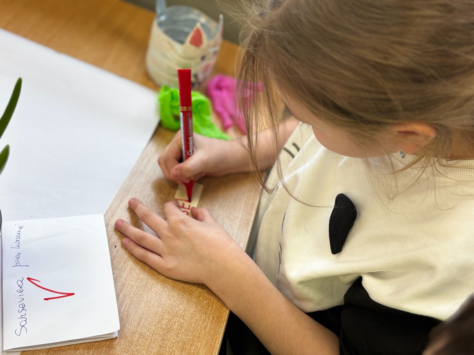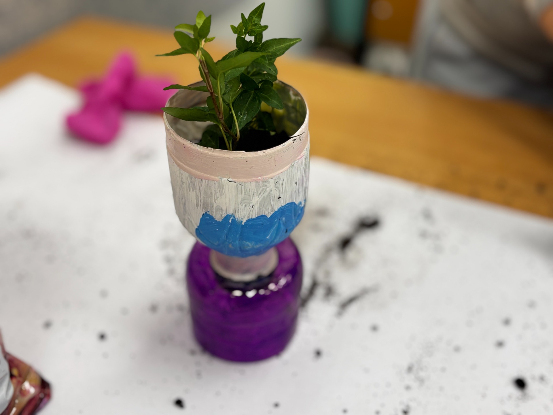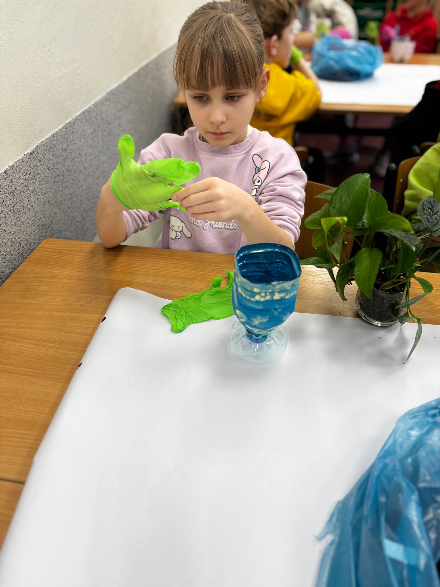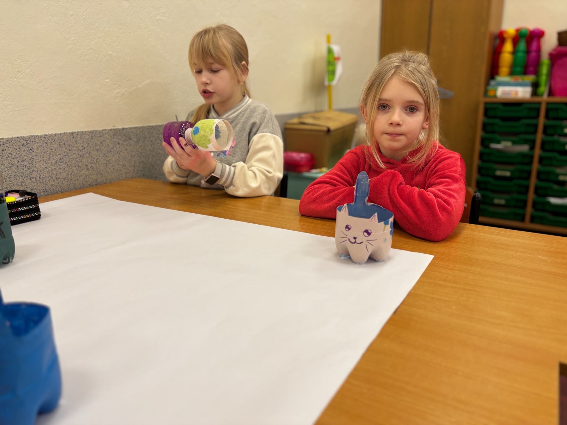 Zanim do akcji wkroczyła ziemia i rośliny, uczniowie zamienili się w projektantów dekoracji recyklingowych. Zgodnie z zasadą „mniej odpadów”, plastikowe butelki dostały drugie życie. Po kilku cięciach i ruchach pędzla, na parapetach zamieszkały: urocze kotki i pieski, barwne stworki, a nawet apetyczne doniczki-lodowe wafelki.