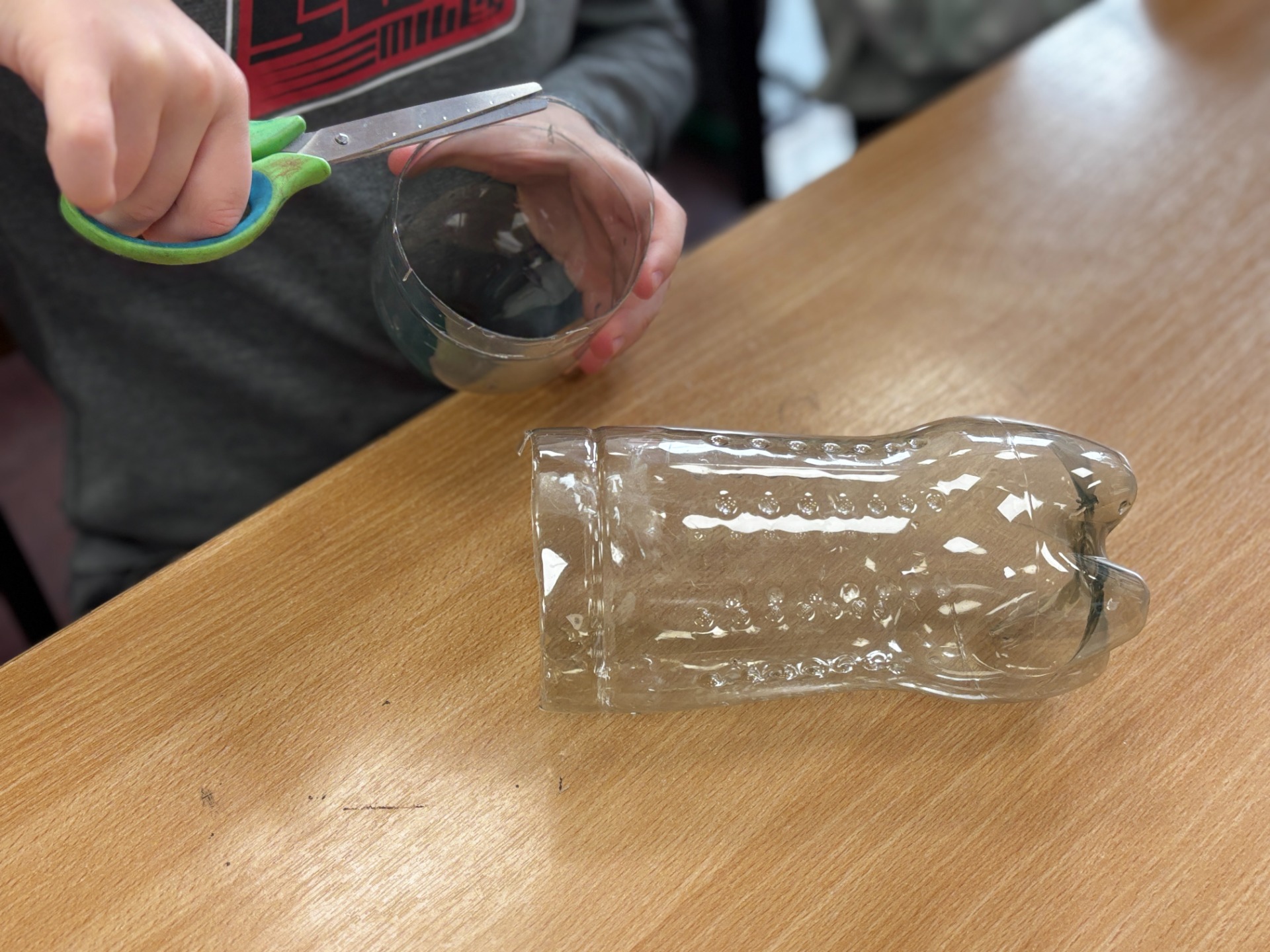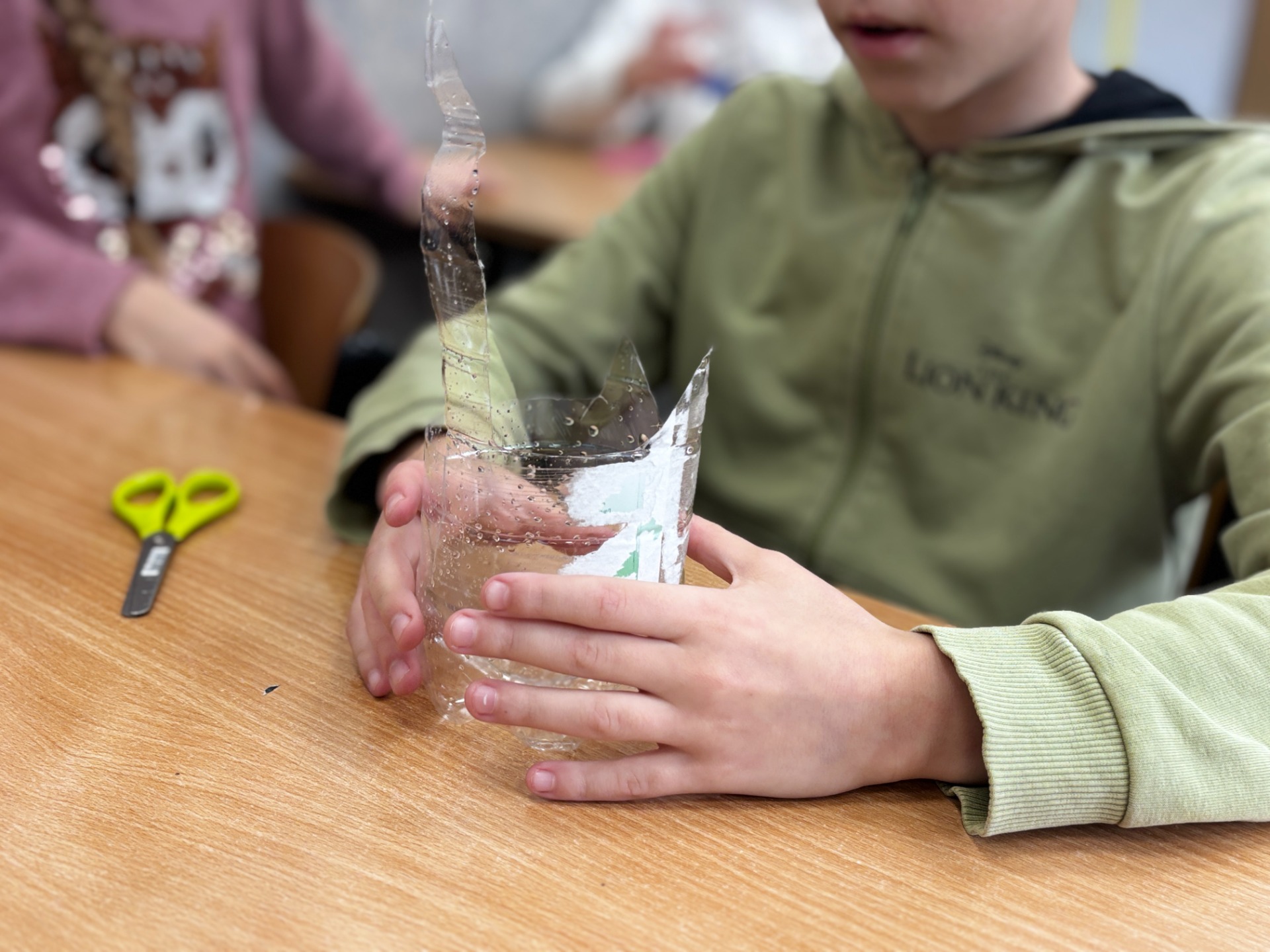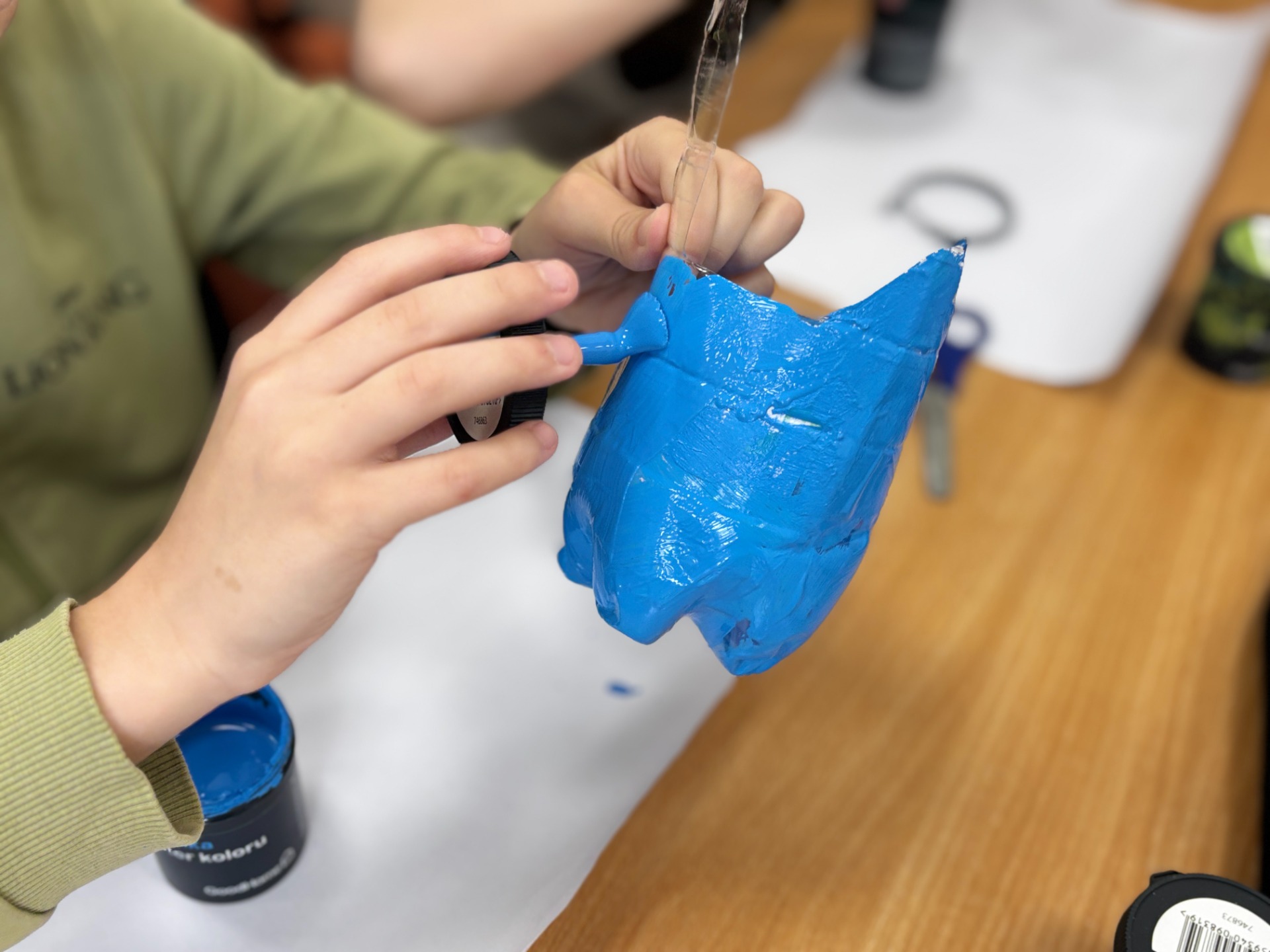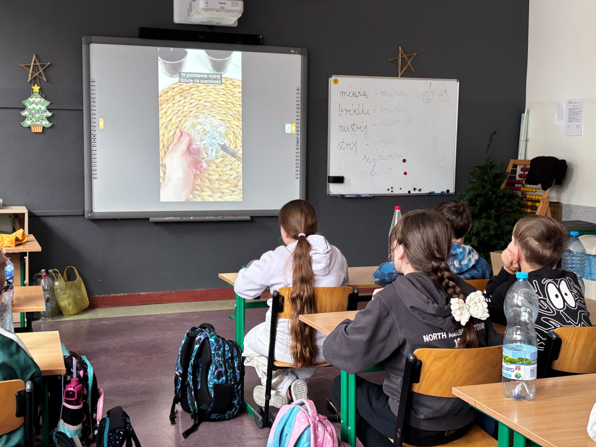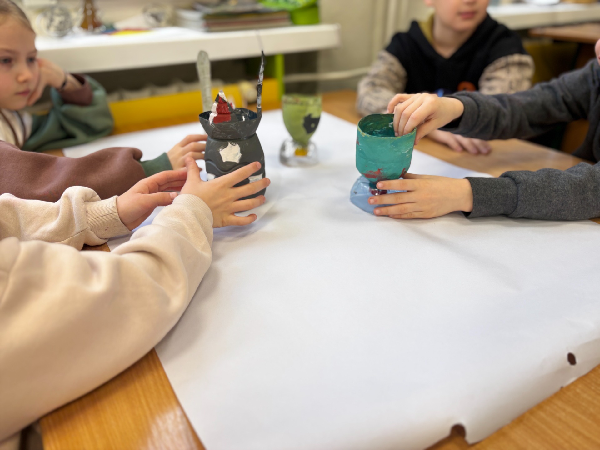 Zanim do akcji wkroczyła ziemia i rośliny, uczniowie zamienili się w projektantów dekoracji recyklingowych. Zgodnie z zasadą „mniej odpadów”, plastikowe butelki dostały drugie życie. Po kilku cięciach i ruchach pędzla, na parapetach zamieszkały: urocze kotki i pieski, barwne stworki, a nawet apetyczne doniczki-lodowe wafelki.
