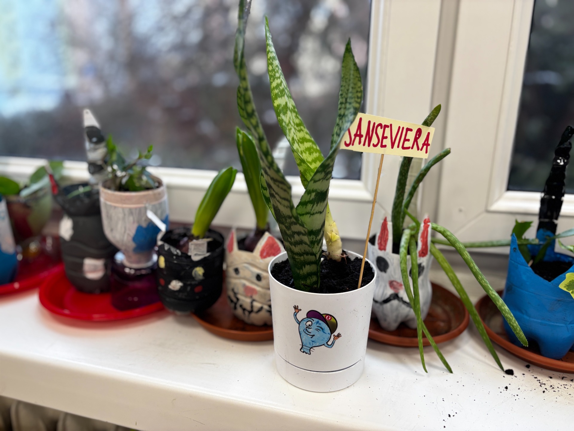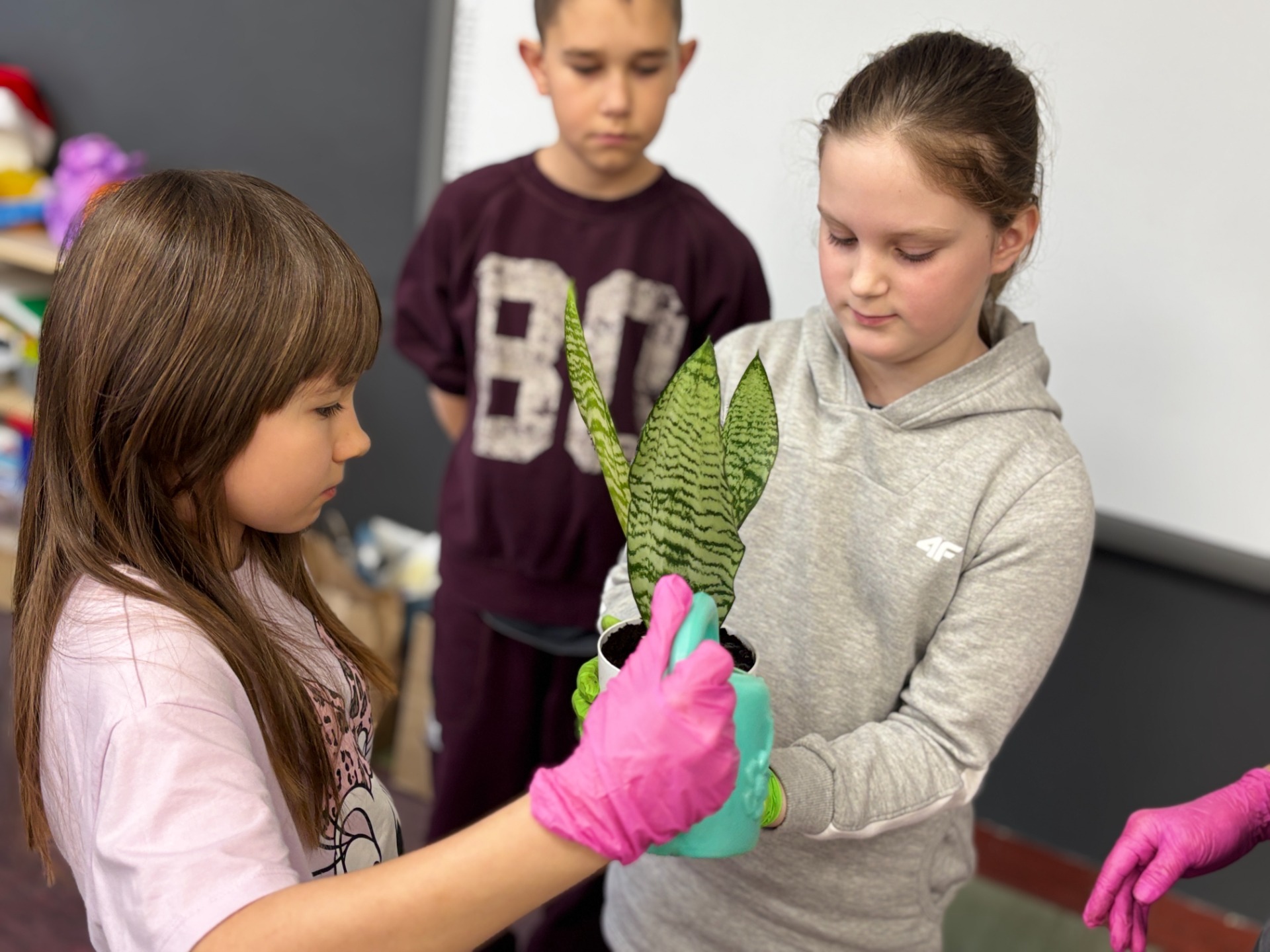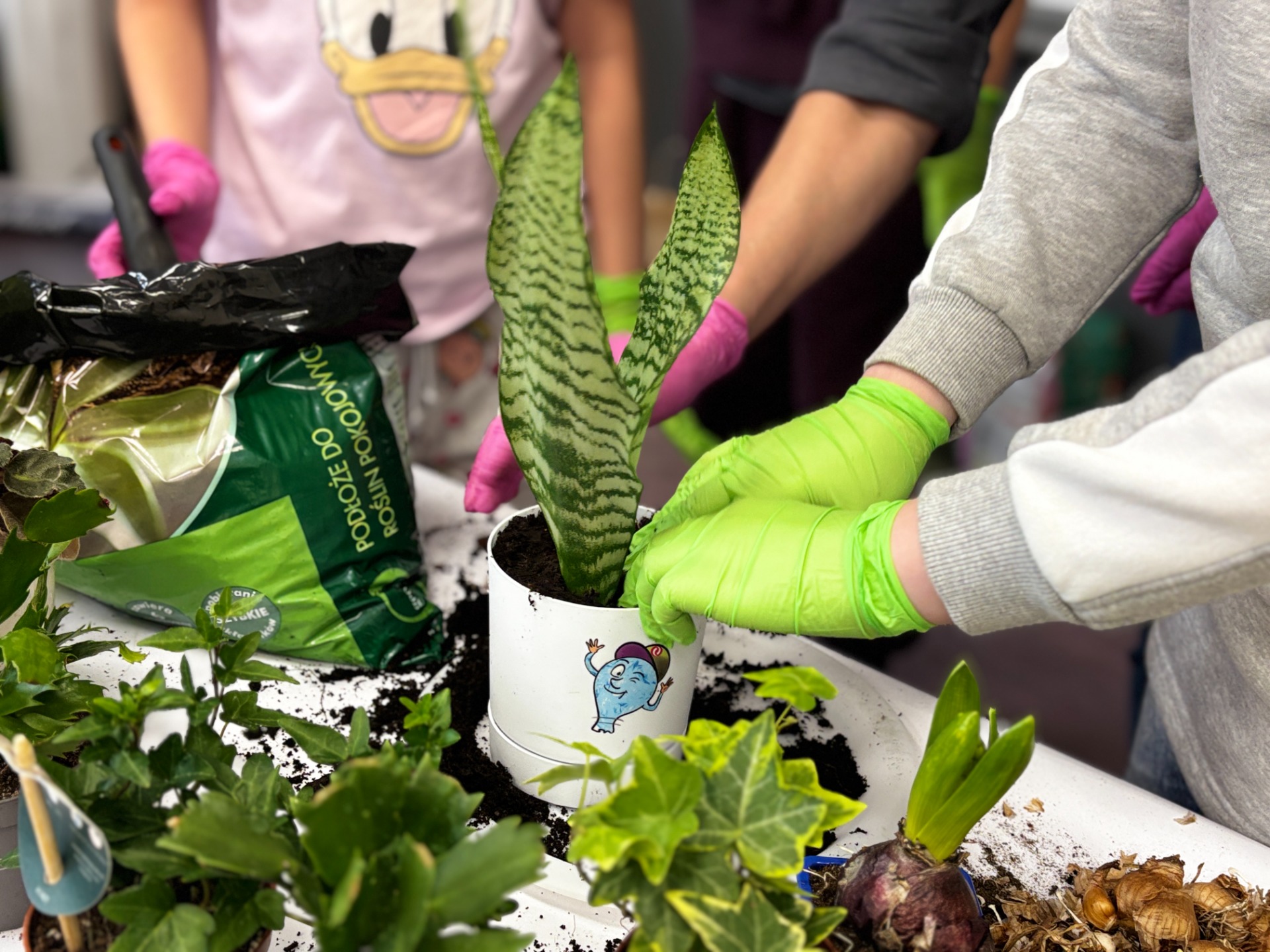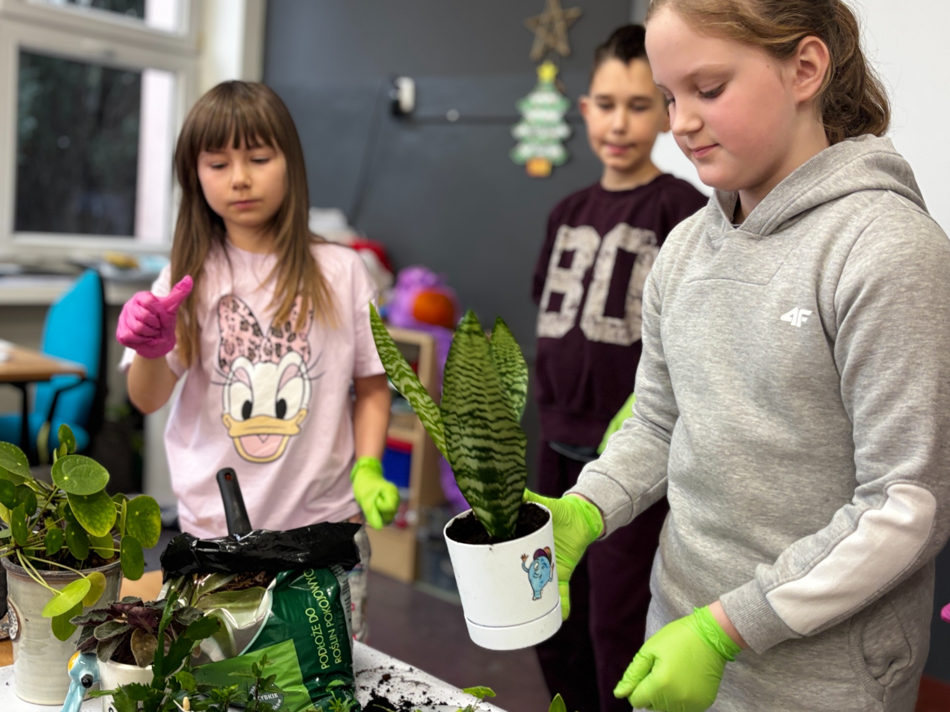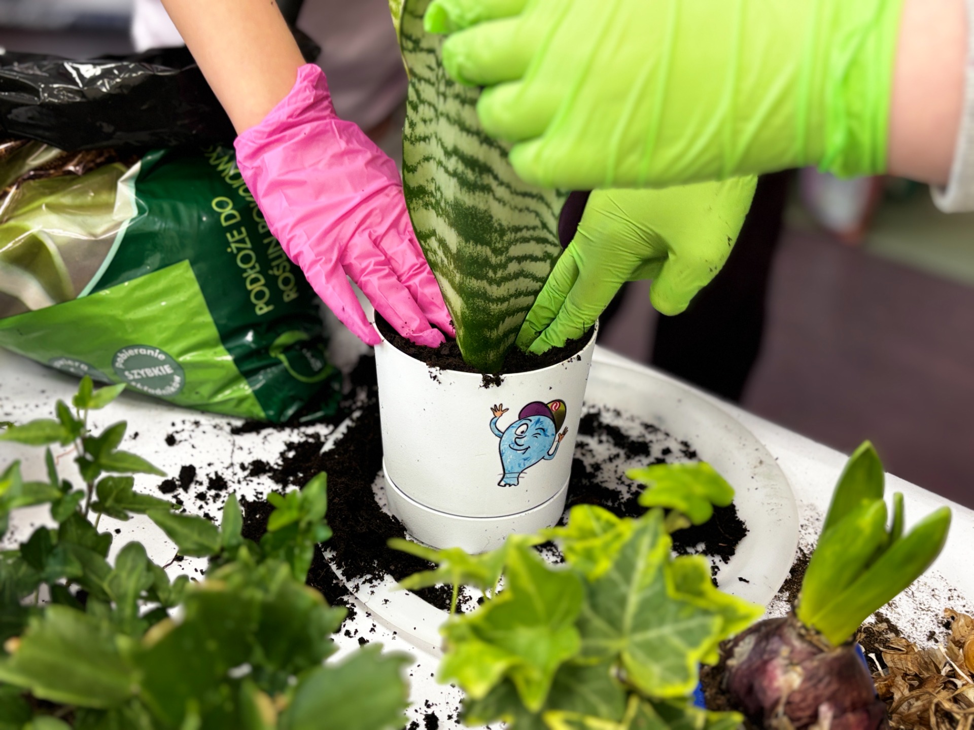 I tak po założeniu rękawiczek : uczniowie sadzili i siali z precyzją chirurgów, podlewali z największą ostrożnością, a na koniec podpisali każdego „lokatora” specjalną etykietą na patyczku, żeby nikt nie pomylił grudniczka z hiacyntem W doniczce Eko-Bystrzaka Foldka zamieszkała Sanseviera.