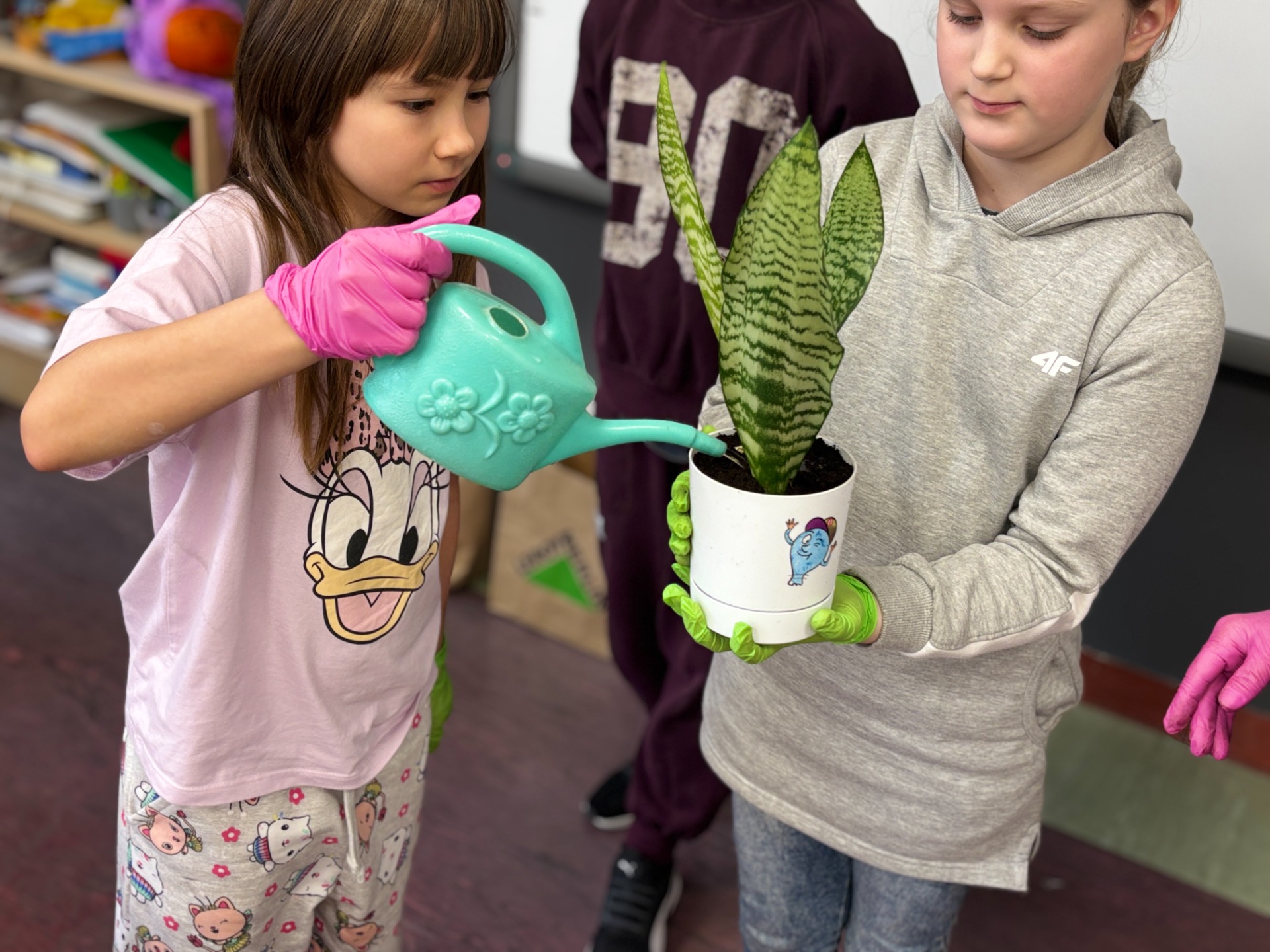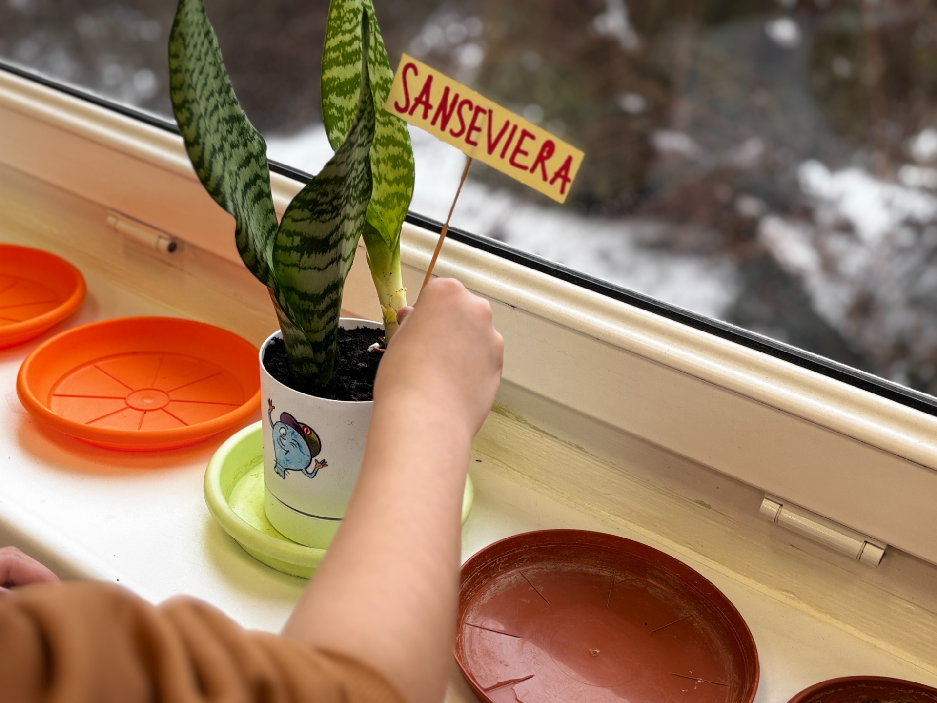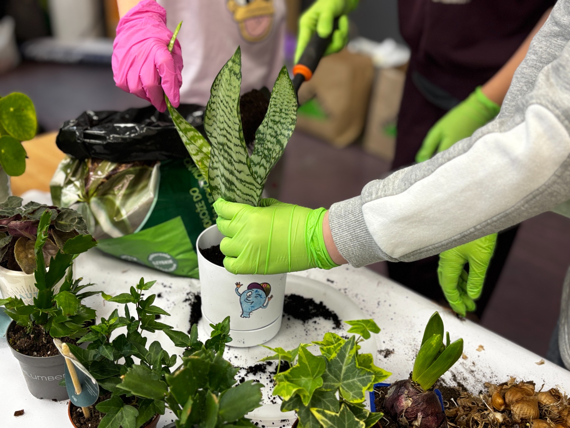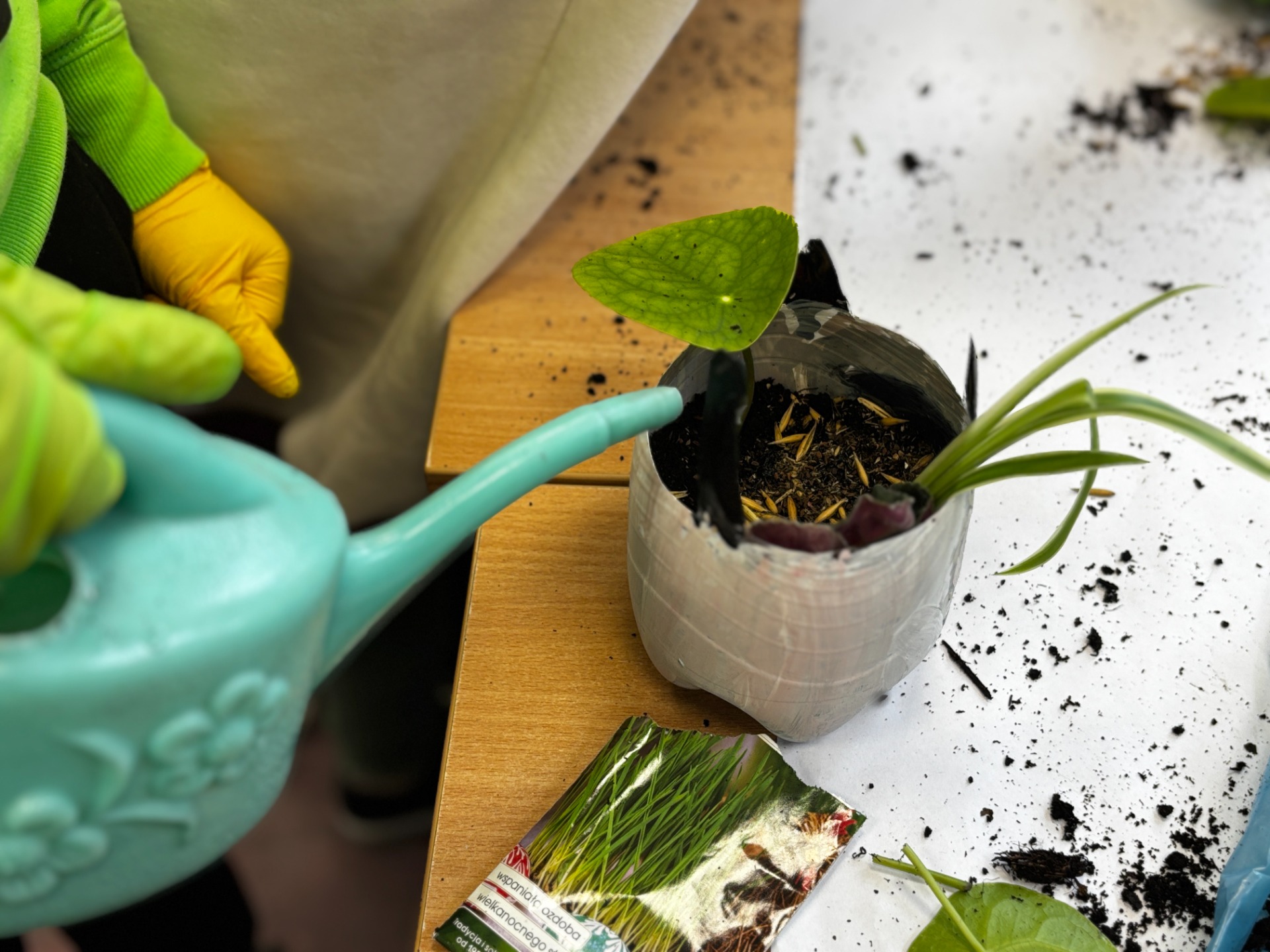 I tak po założeniu rękawiczek : uczniowie sadzili i siali z precyzją chirurgów, podlewali z największą ostrożnością, a na koniec podpisali każdego „lokatora” specjalną etykietą na patyczku, żeby nikt nie pomylił grudniczka z hiacyntem W doniczce Eko-Bystrzaka Foldka zamieszkała Sanseviera.