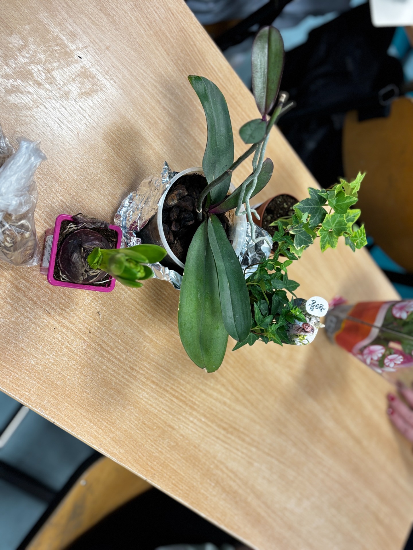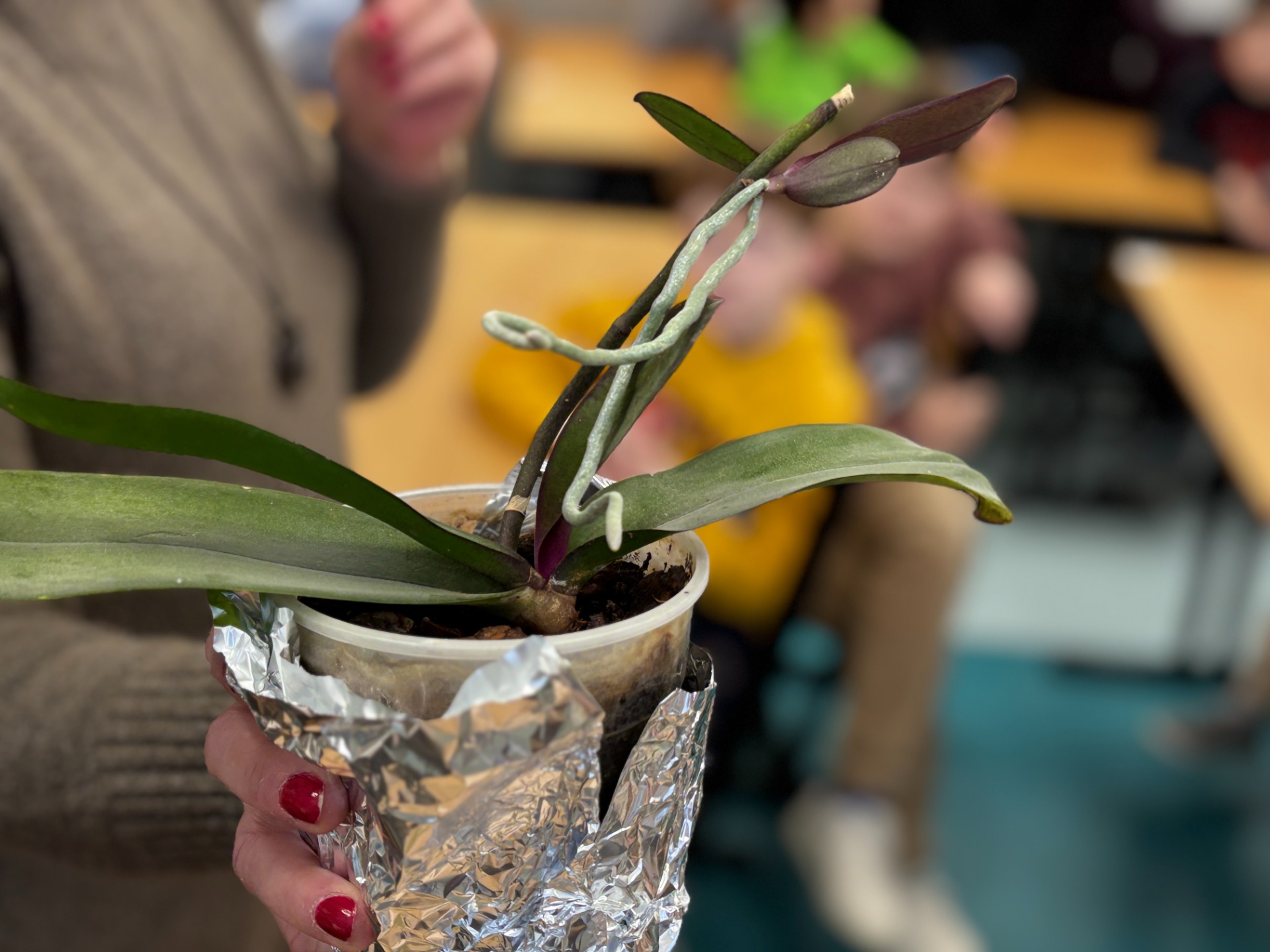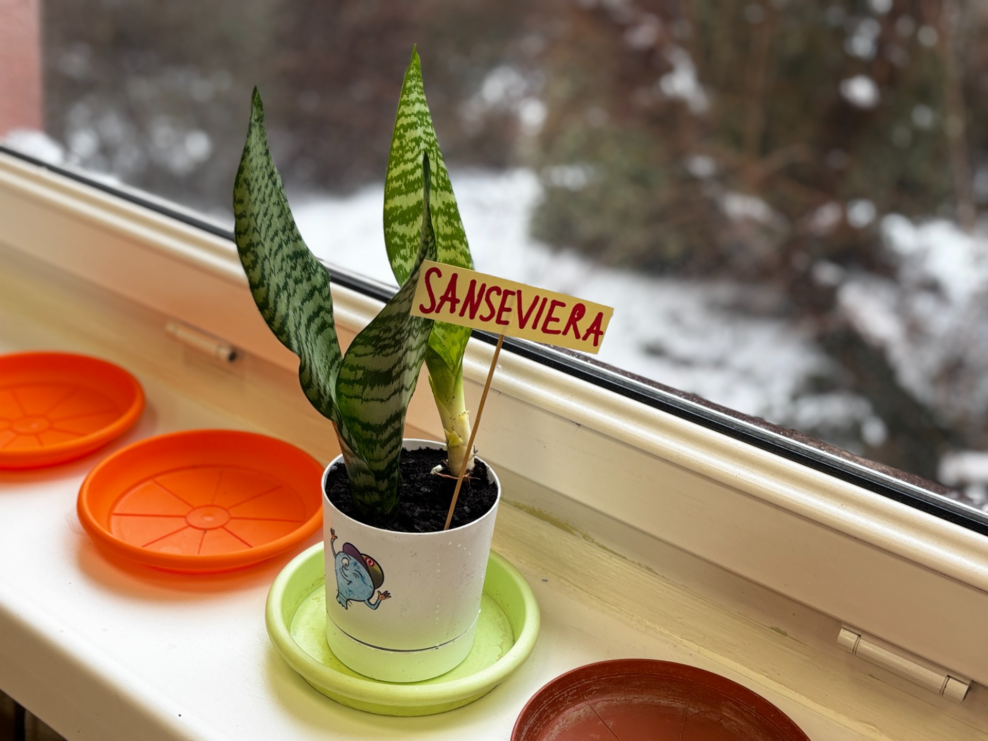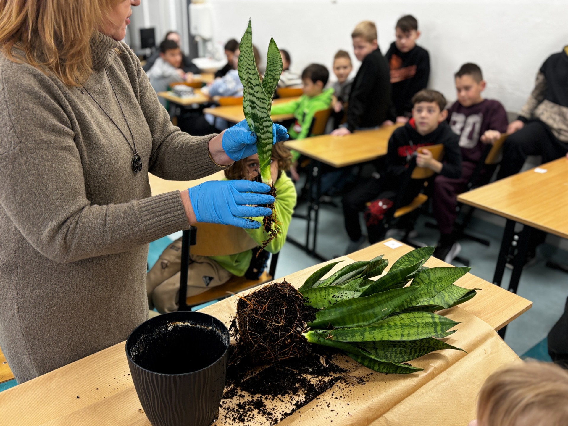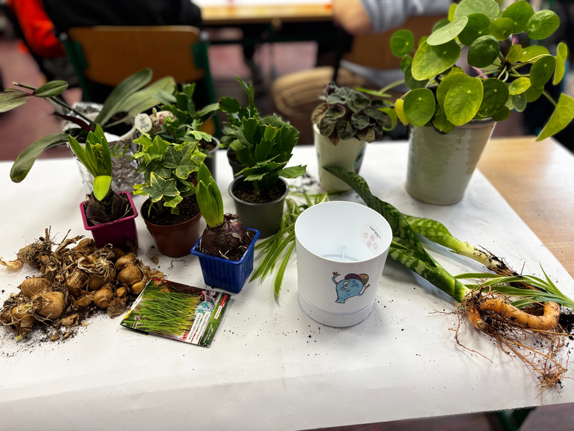 I tak po założeniu rękawiczek : uczniowie sadzili i siali z precyzją chirurgów, podlewali z największą ostrożnością, a na koniec podpisali każdego „lokatora” specjalną etykietą na patyczku, żeby nikt nie pomylił grudniczka z hiacyntem W doniczce Eko-Bystrzaka Foldka zamieszkała Sanseviera.