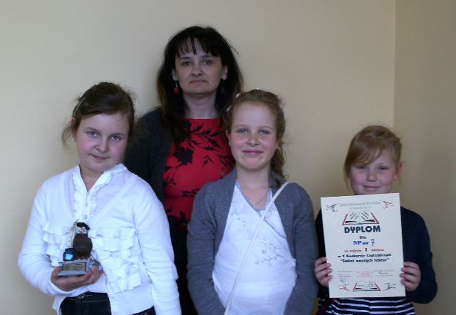 27 maja 2013 r. uczniowie z naszej szkoły zajęli I miejsce w X Międzyszkolnym Konkursie Czytelniczym „Świat naszych lektur”. Skład drużyny: Julia Sokół kl.3a, Nikola Janczak kl.2b, Wiktoria Wojciechowska kl.1b. Gratulujemy!