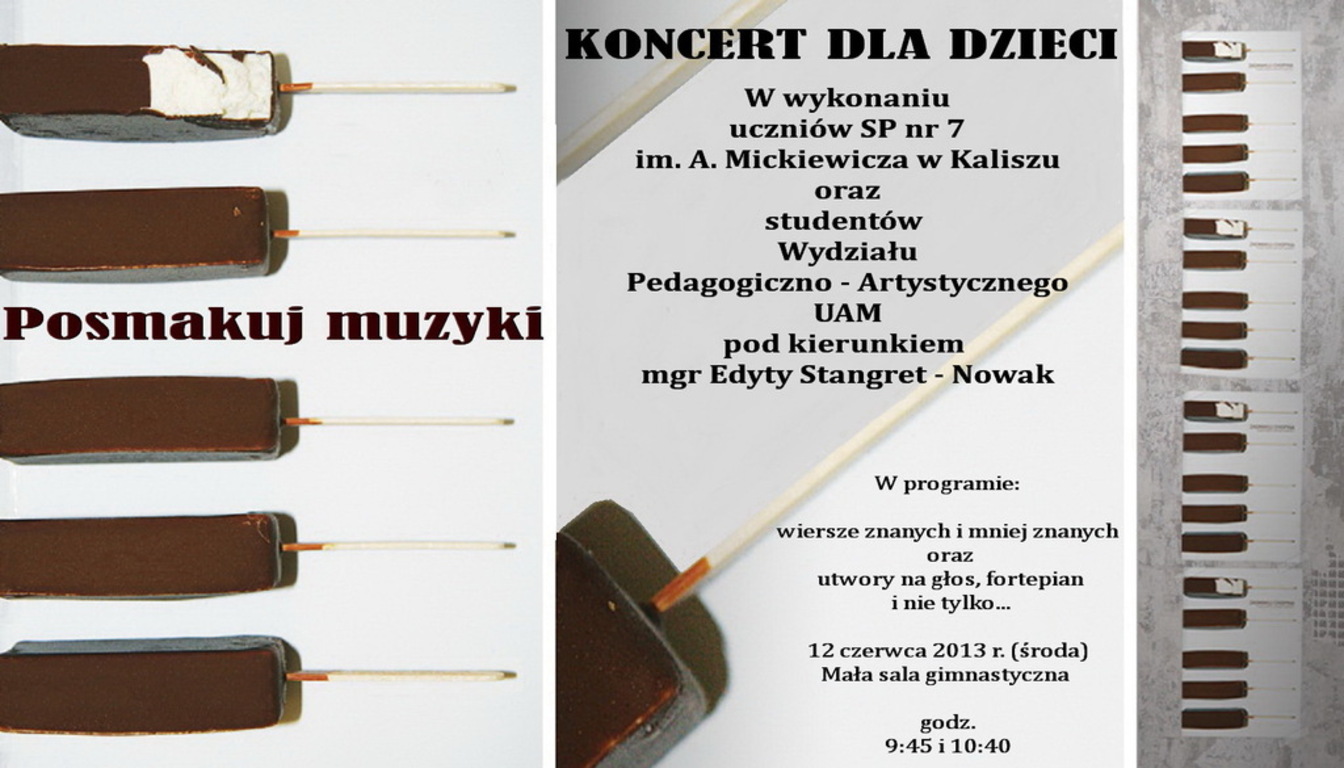 12 czerwca 2013 r. odbędzie się koncert "POSMAKUJ MUZYKI" w wykonaniu uczniów Szkoły Podstawowej nr 7 im. Adama Mickiewicza w Kaliszu oraz studentów Wydziału Pedagogiczno – Artystycznego w Kaliszu Uniwersytetu im. Adama Mickiewicza w Poznaniu, realizowany w ramach praktyk studenckich pod kierunkiem p. Edyty Stangret - Nowak. Kliknij na zdjęcie ...
