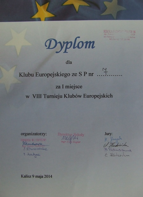 9 maja 2014r. zajęliśmy I miejsce w VIII Kaliskim Turnieju Klubów Europejskich. Naszą szkołę reprezentowała 4-osobowa drużyna uczniów (Nikola Janczak, Ada Wojterska, Jakub Klimek, Mikołaj Suchecki). Uczniów do konkursu przygotowała pani Ewa Karolewska w ramach zajęć Koła Małego Europejczyka. Turniej odbył się w Szkole Podstawowej nr 16 w Kaliszu. Naszym zwycięzcom serdecznie gratulujemy wiedzy na temat krajów Unii Europejskiej oraz Tytułu Najlepszego Kaliskiego Klubu Europejczyka.